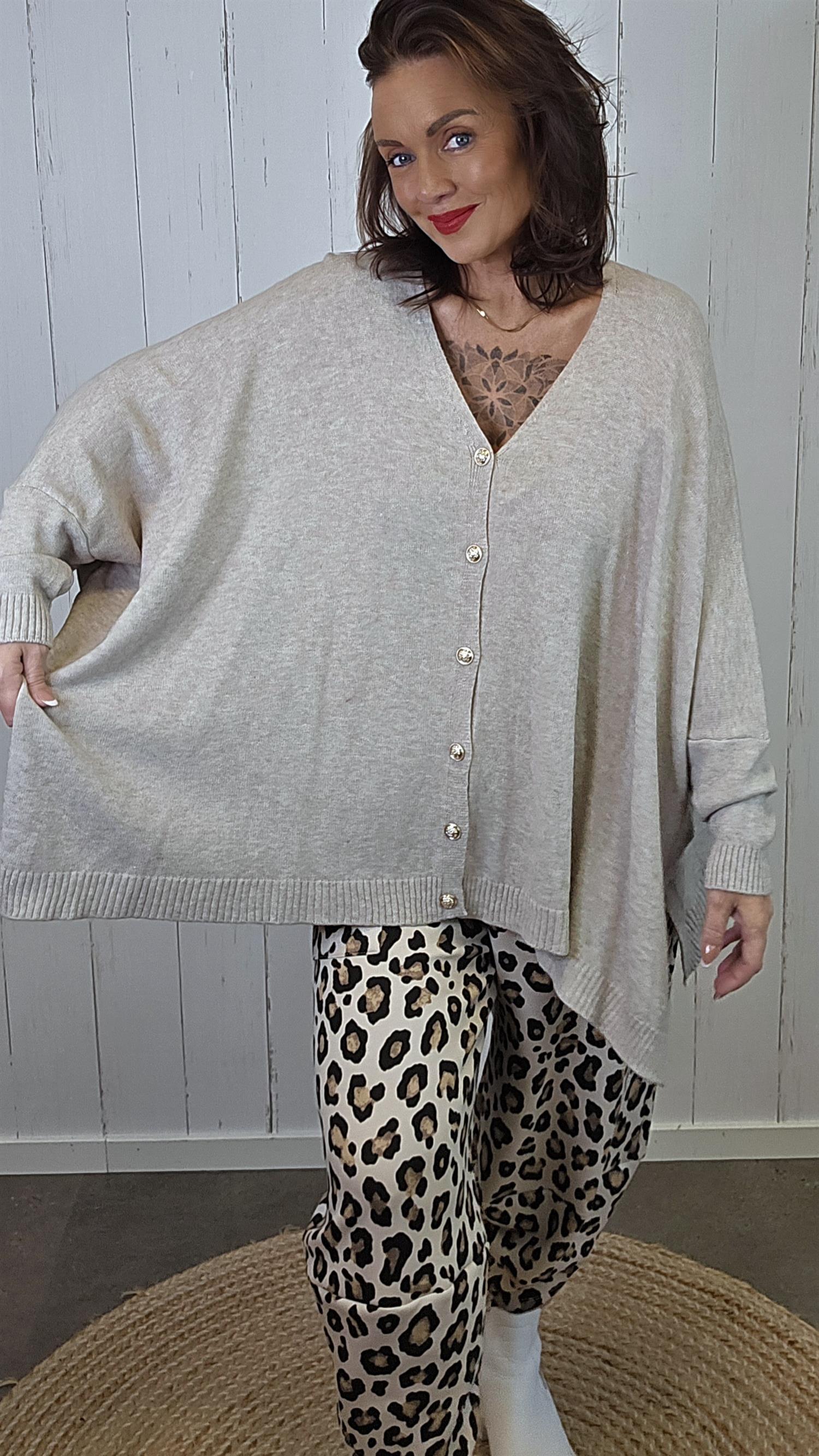 En utrolig fin genserjakke med knapper hele veien ned, som kan styles både som genser og som lett jakke. Den har en bling-stjerne bak i nakken, dyp v-hals og splitter i sidene. Modellen er superbaggy, faller tungt og er laget i et stretchy materiale som gir en flatterende og komfortabel passform.