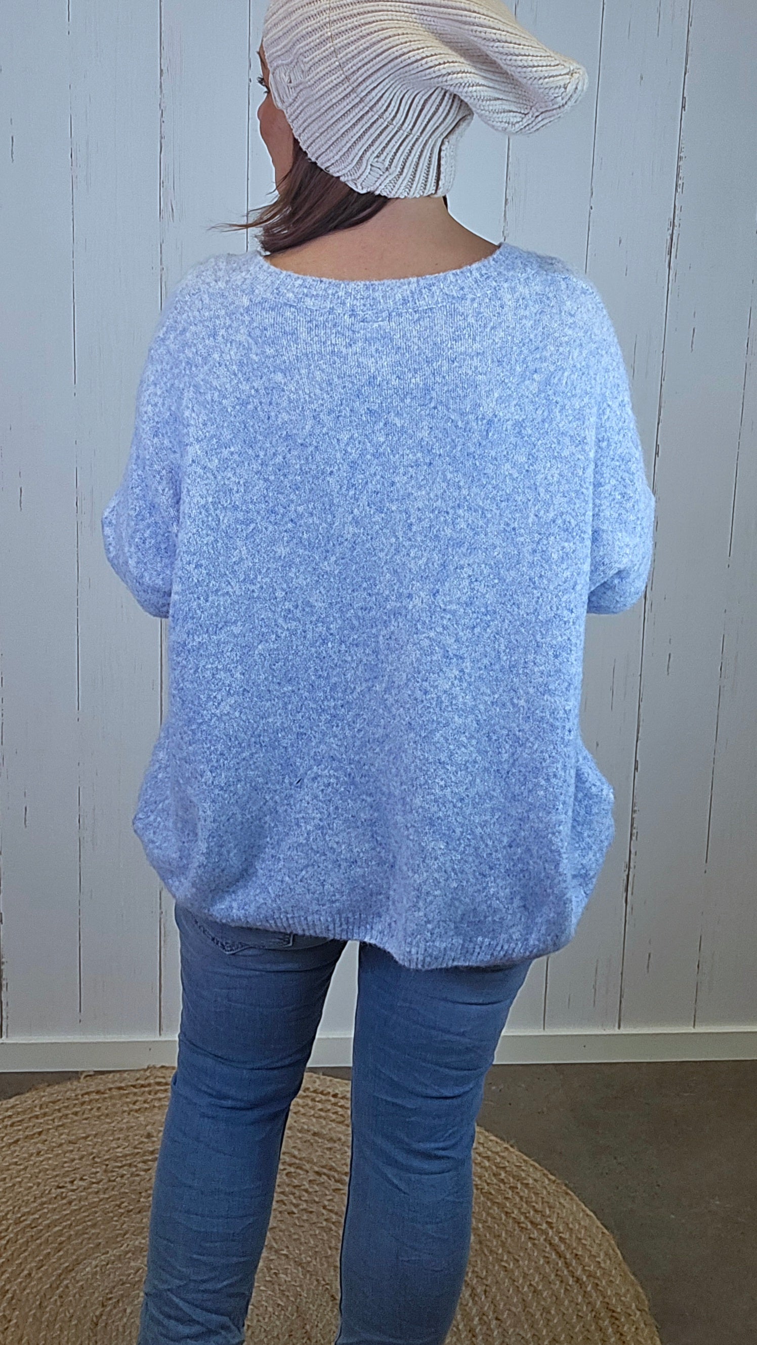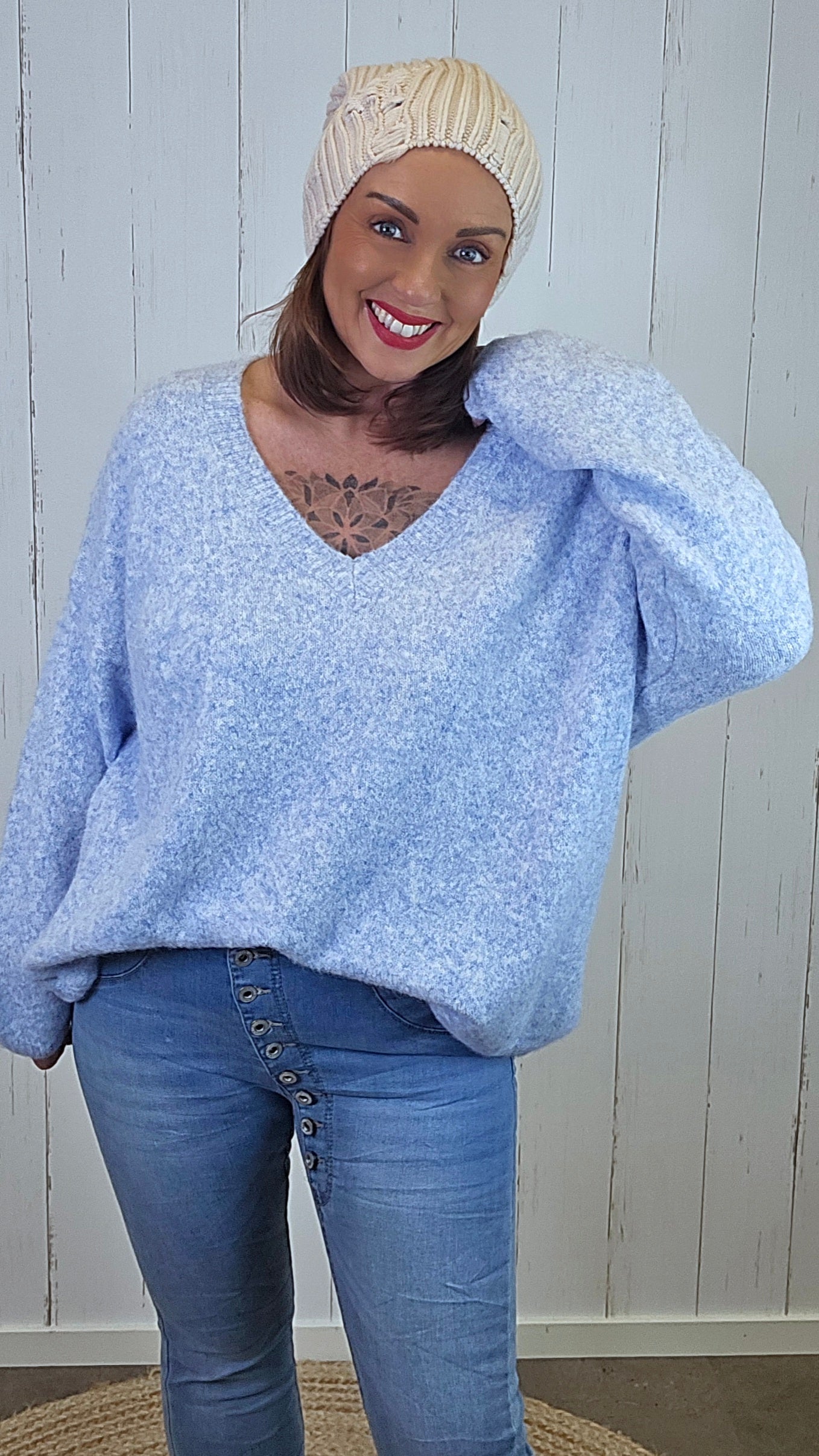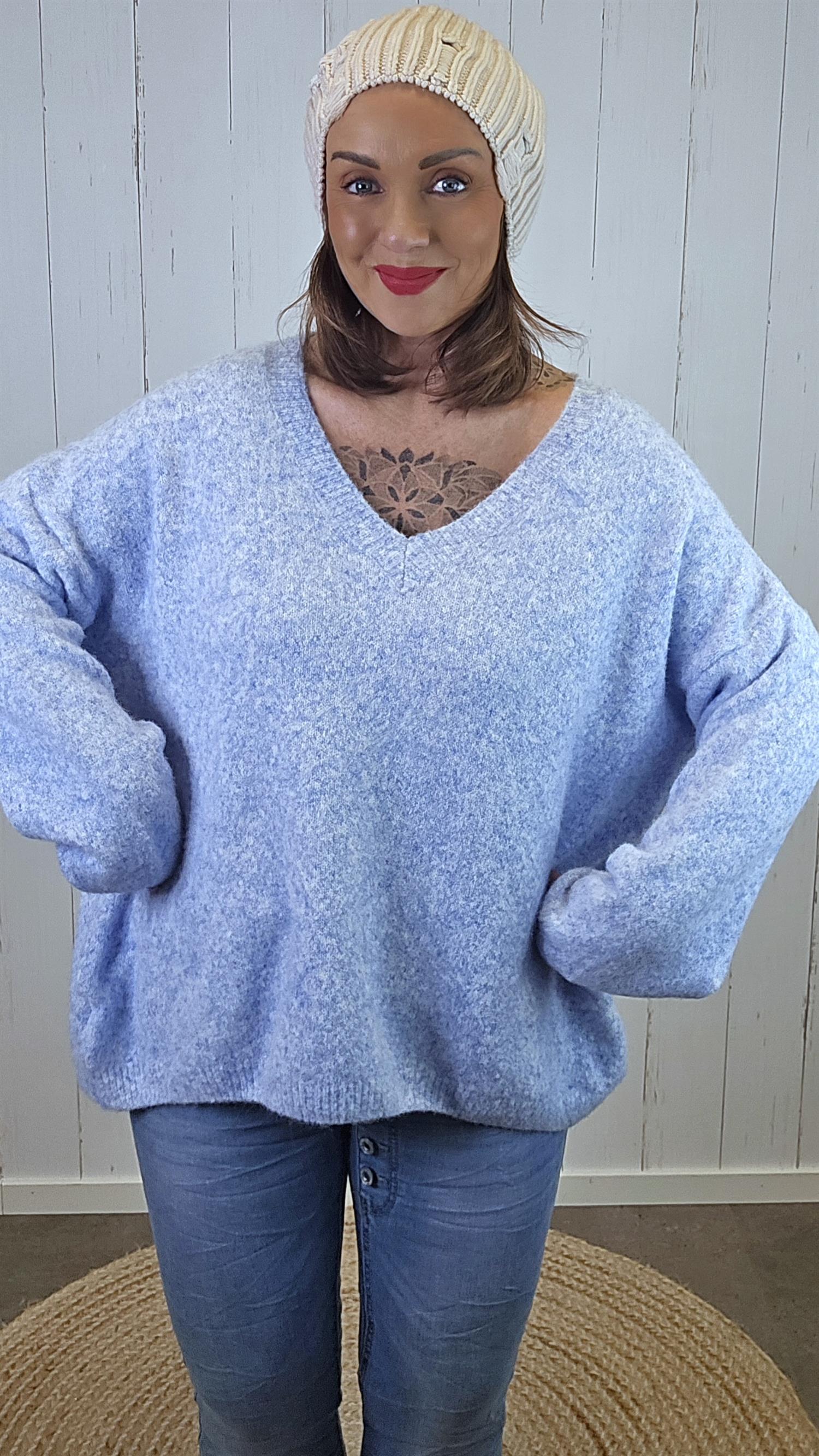 En deilig myk og varm genser med ribbestrikket kant nederst og langs den dype V-halsen. Genseren har fulle ermer med ribbekant nederst, noe som gir den et avslappet, men samtidig pent uttrykk. Stoffet er supermykt og komfortabelt – perfekt til både hverdag og kos.