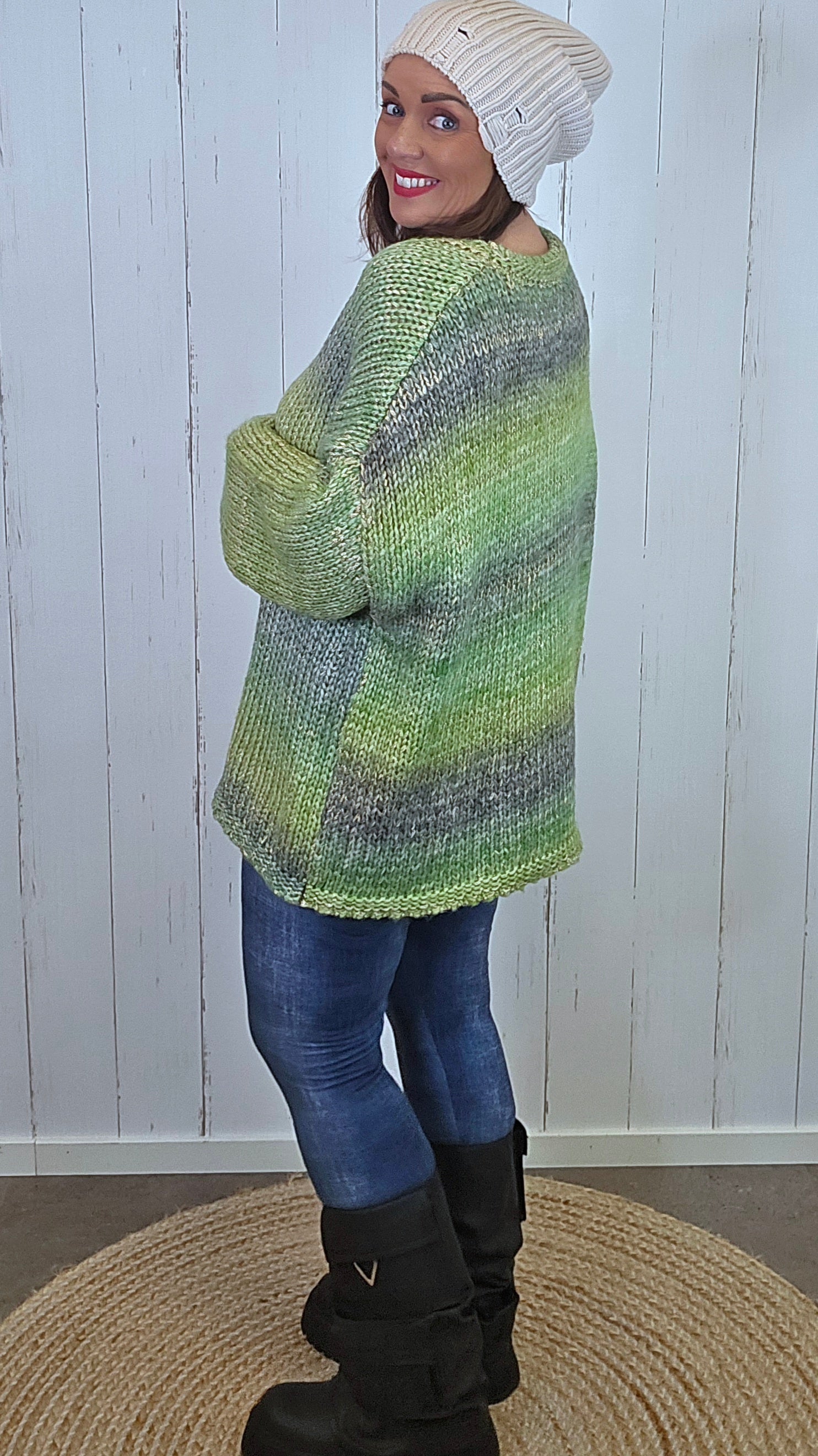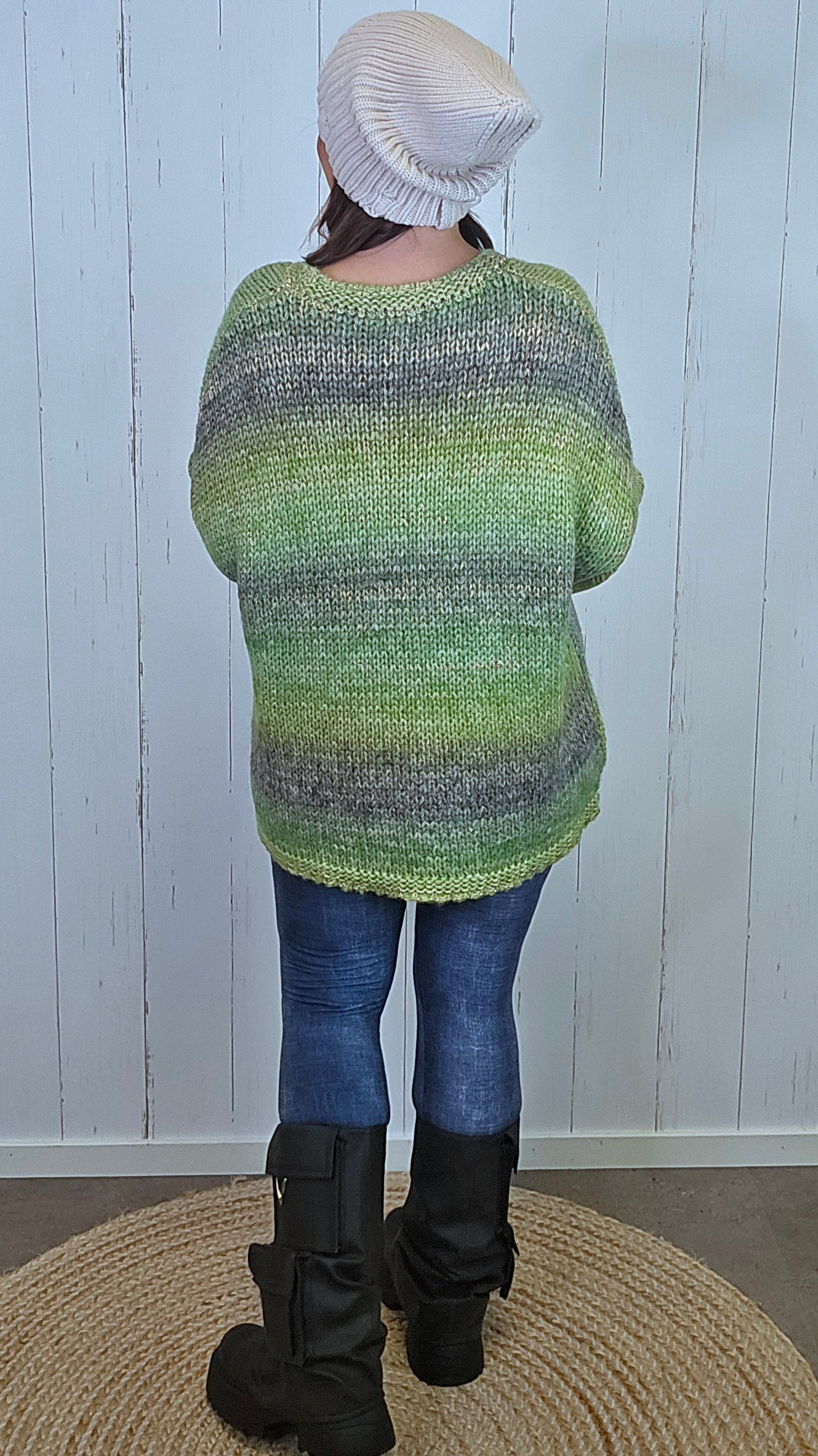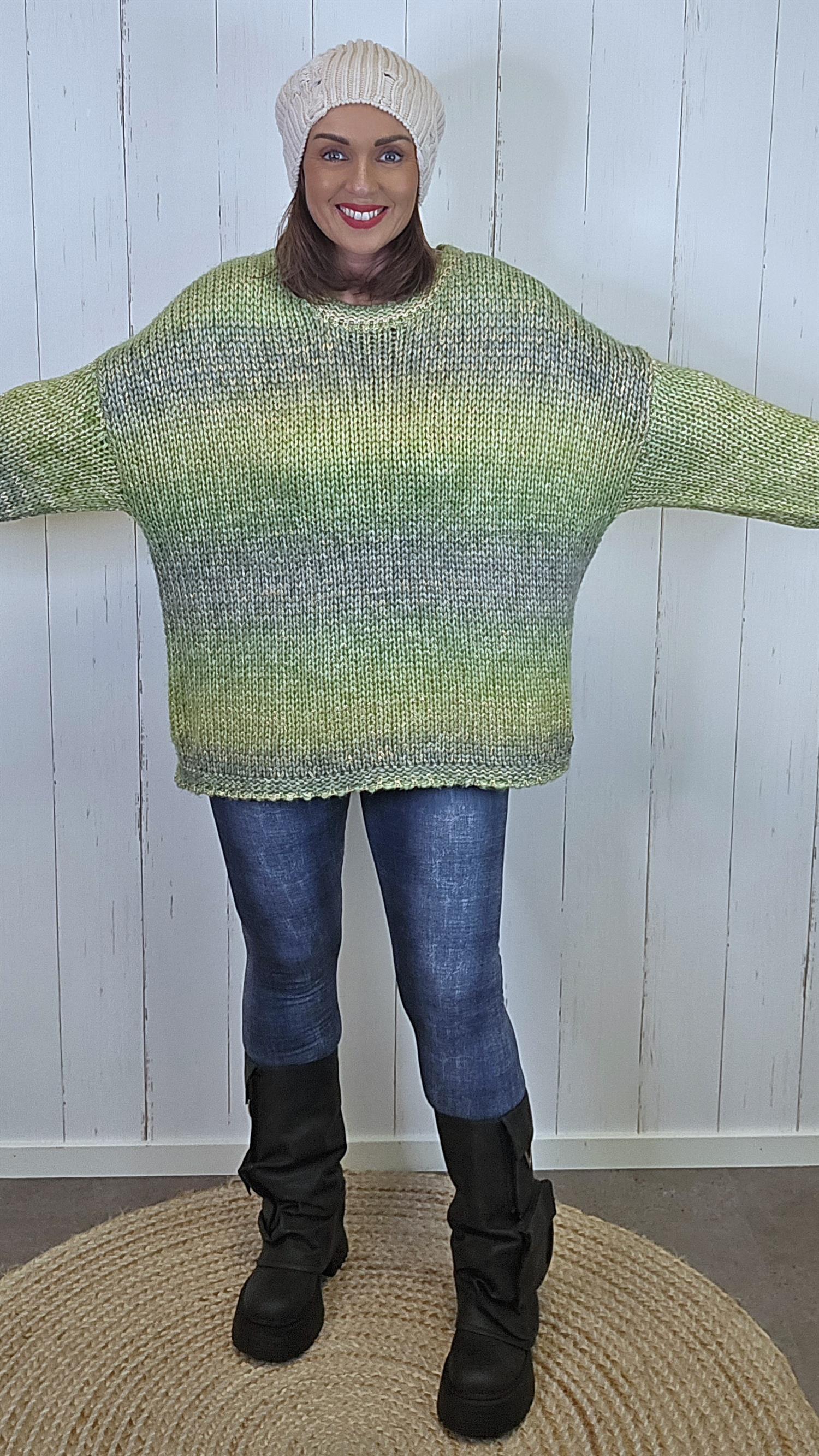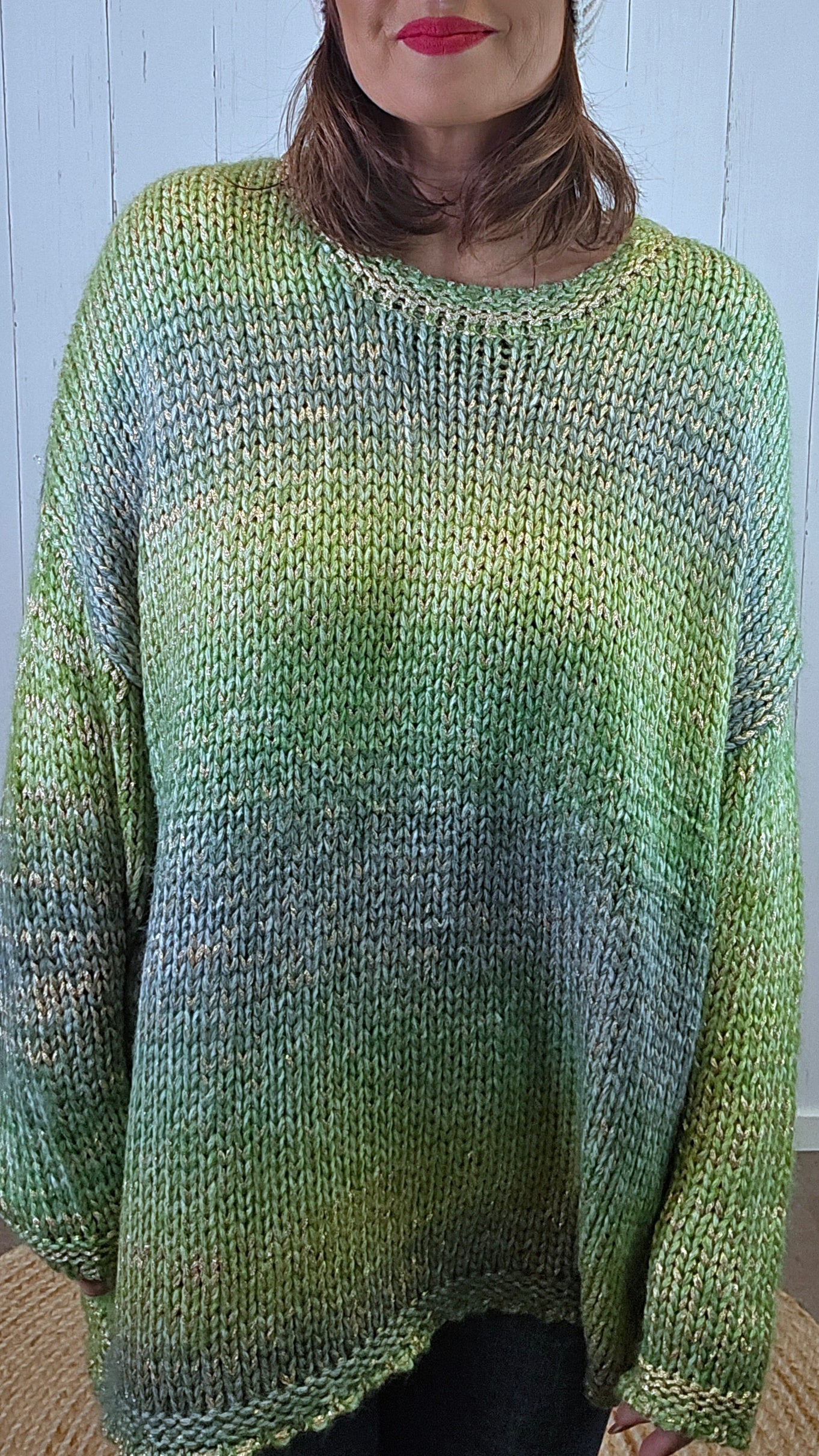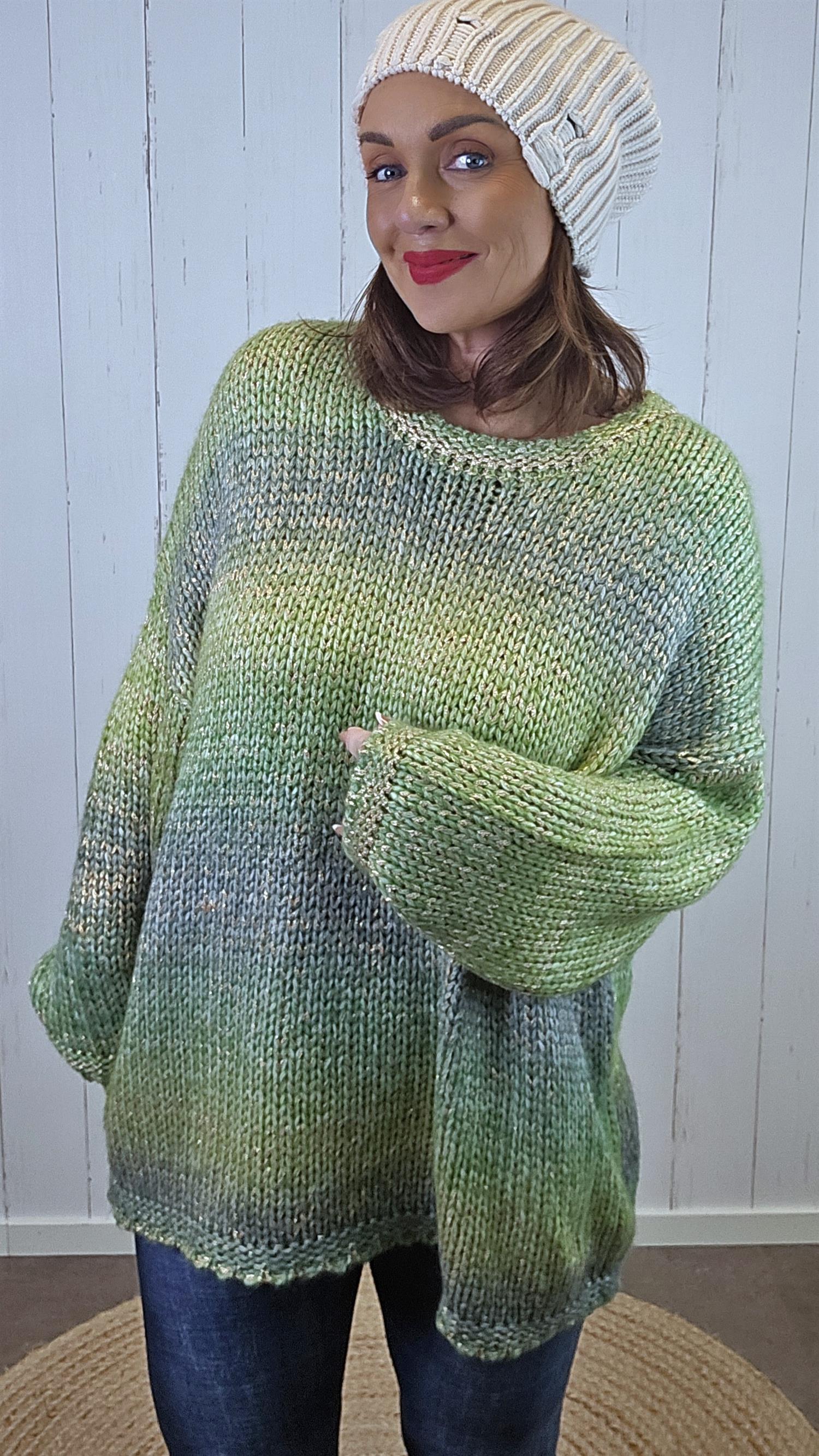 Løs og myk strikkegenser med melert grønnfarge og avslappet passform. Perfekt til hverdagslag-på-lag.