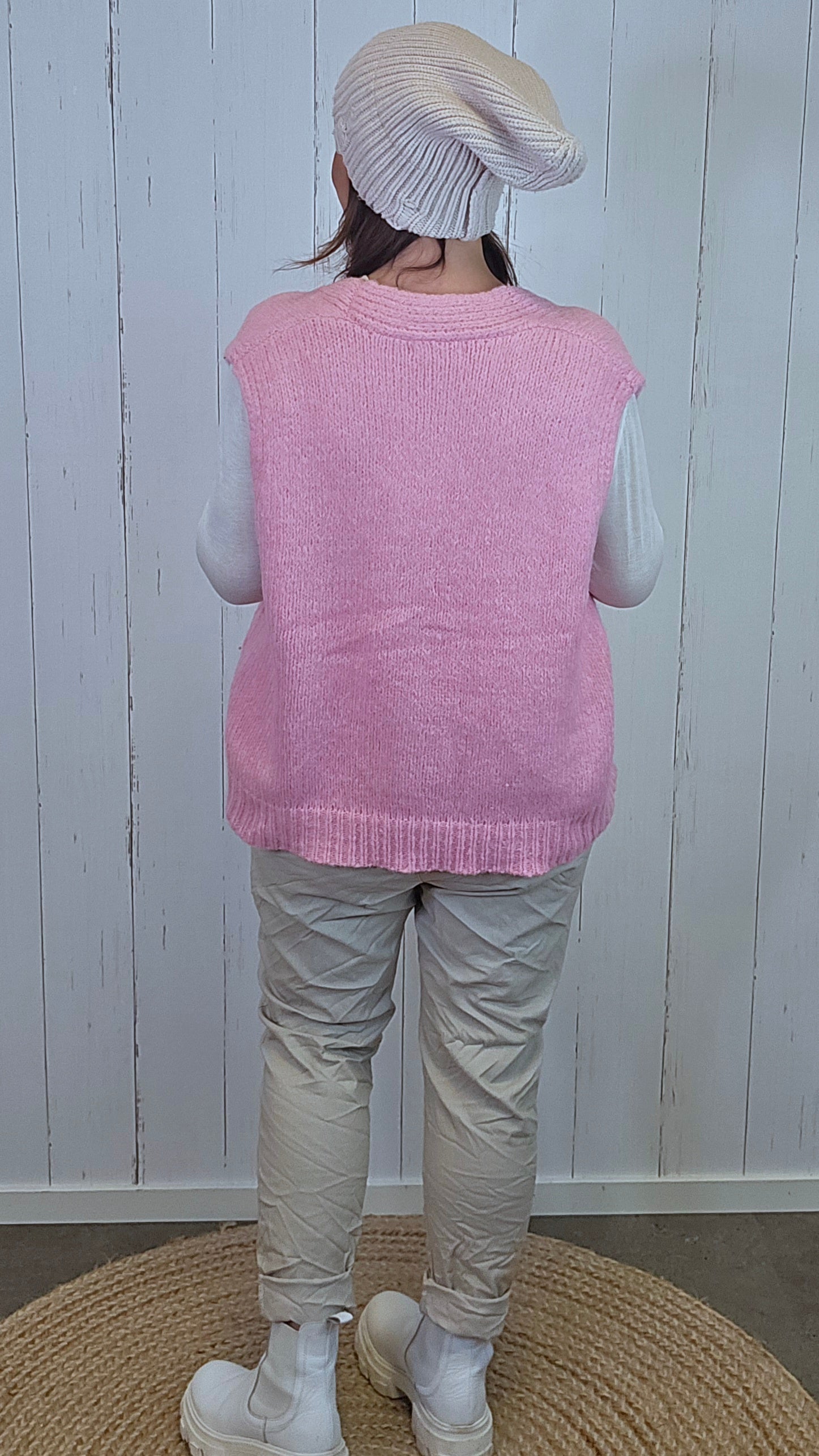 Myk og lett strikkevest med pen V-hals og knapper i front, perfekt til lag-på-lag året rundt.