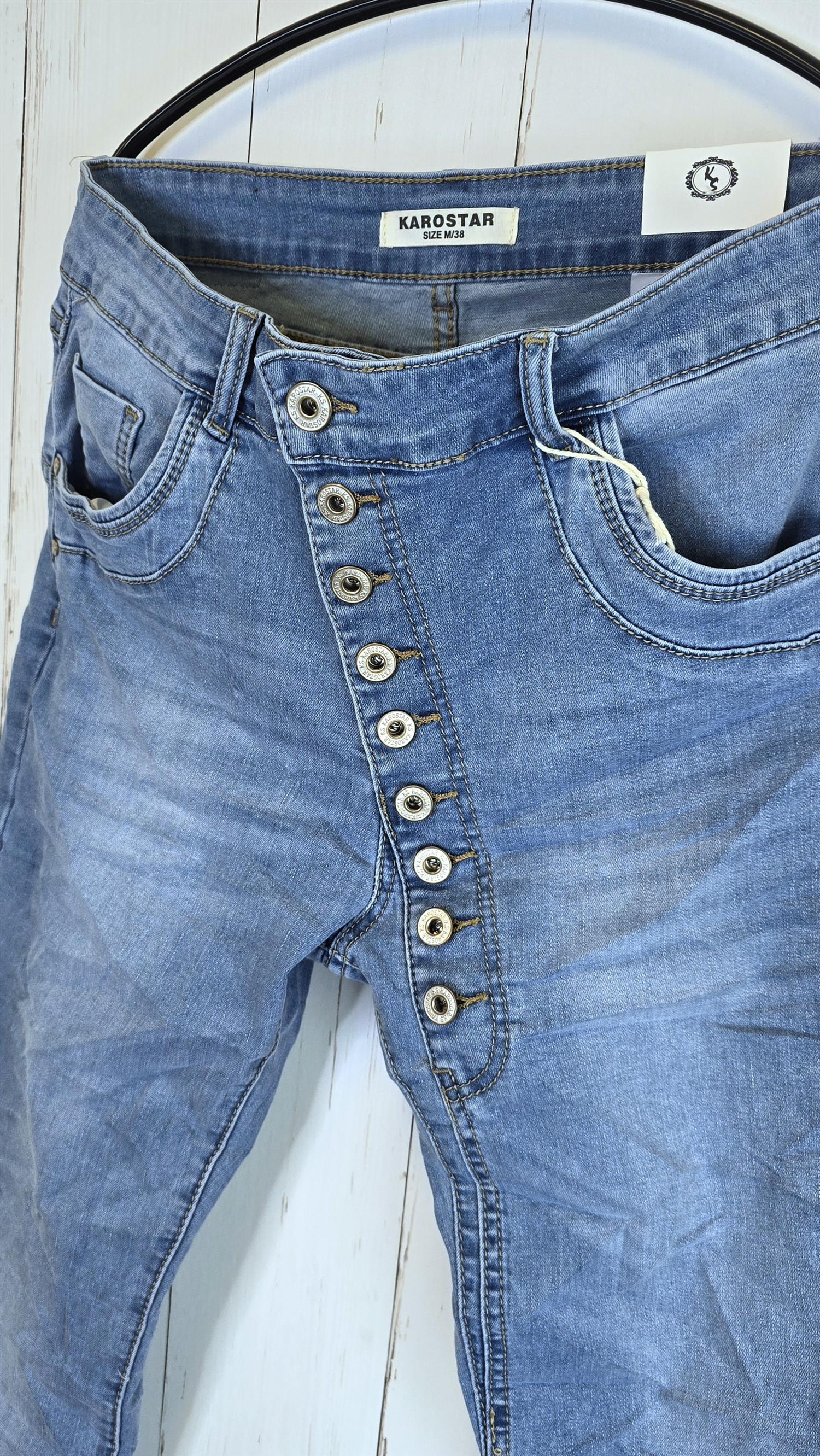 Trendy lyseblå Karostar jeans med dekorative knapper i front og god stretch for komfort i hverdagen.