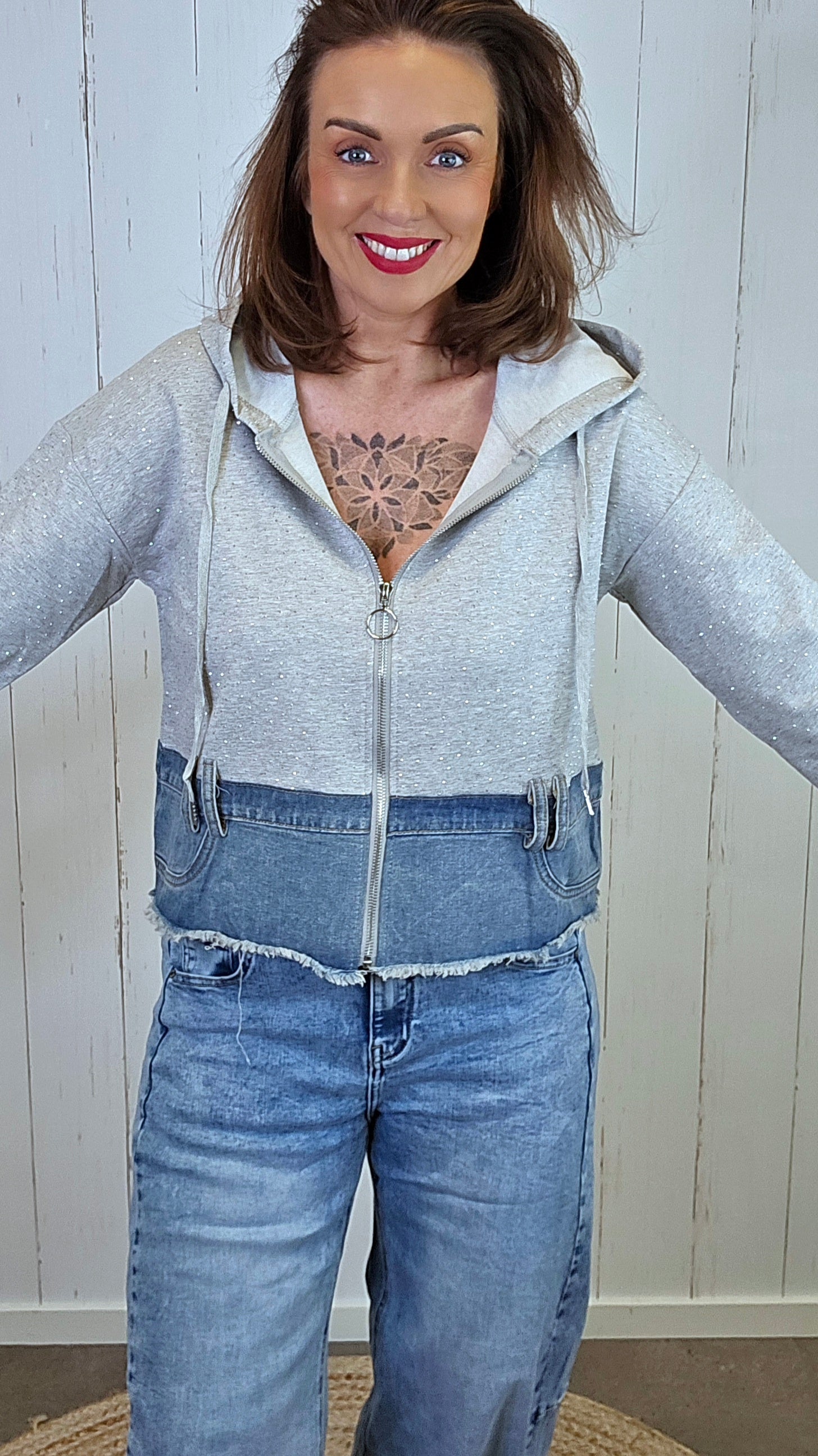 Kombinert hettejakke i myk jersey og rå denimdetaljer med små glitterprikker for et kult hverdagsuttrykk. Lange ermer.