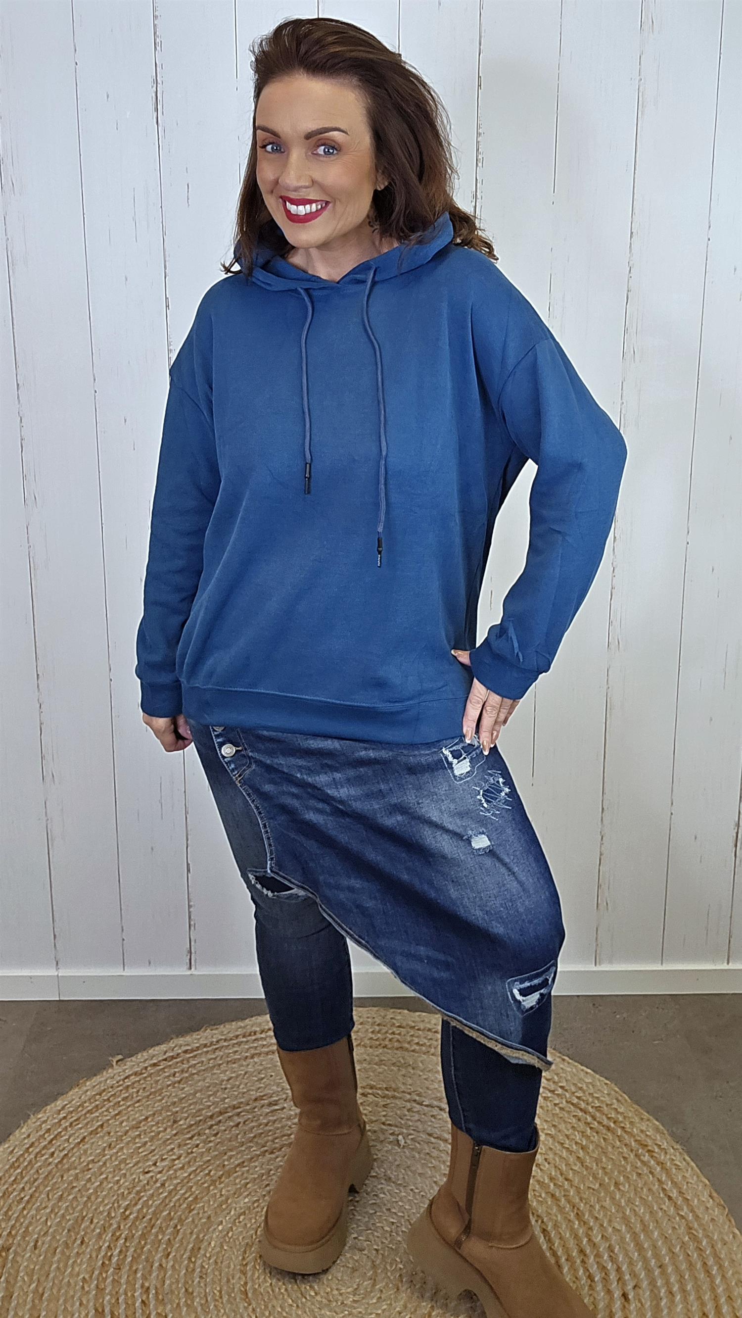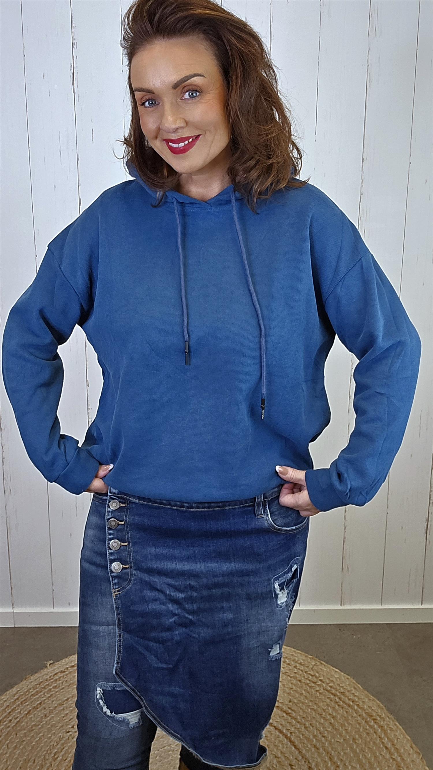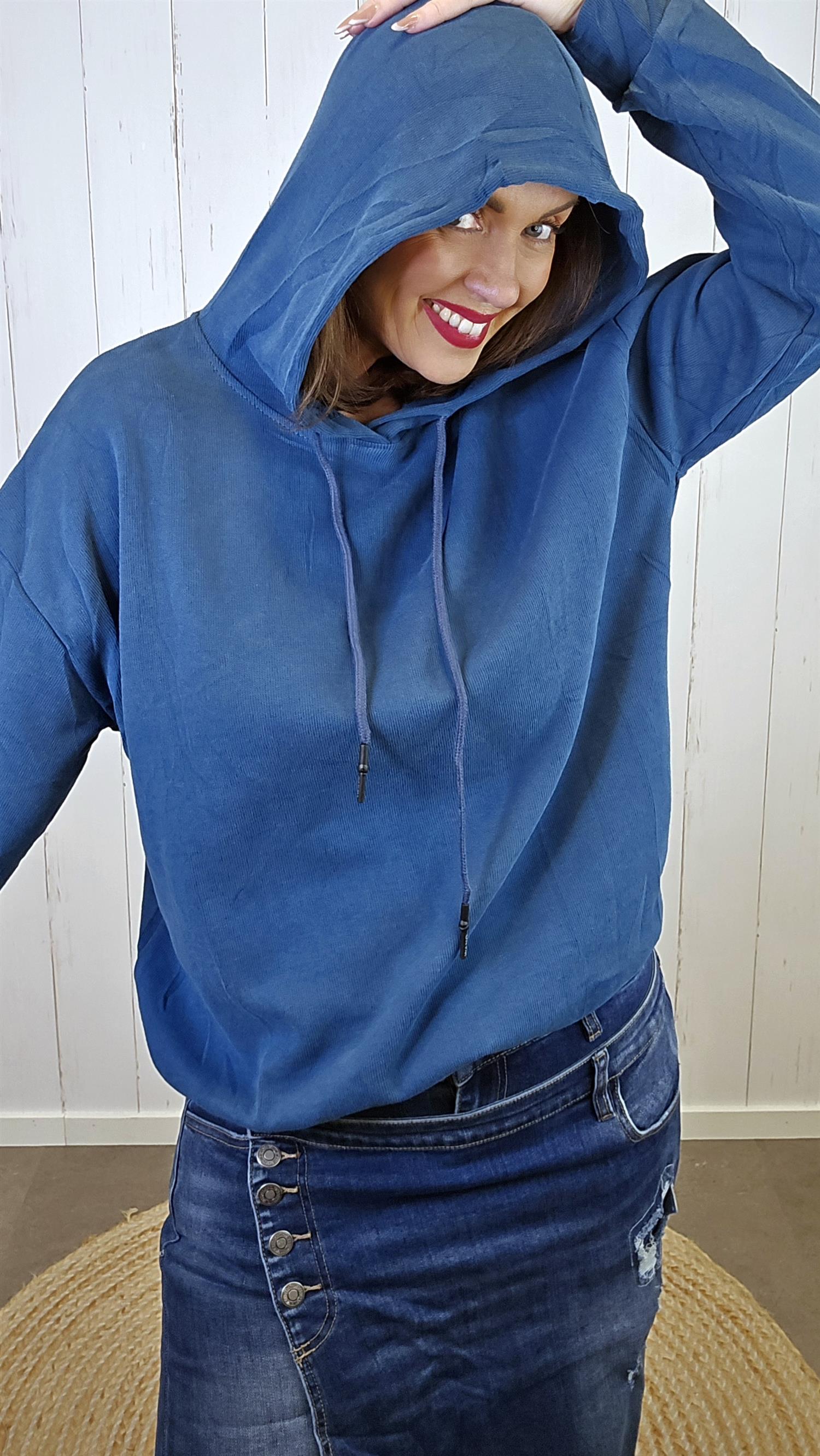 En myk og behagelig blå hettegenser laget av ren bomull. Genseren har en ribbestrikket kant nederst som gir en pen og fleksibel avslutning. I halsen har den praktisk snøring som lar deg justere åpningen. Litt liten I str. Vill du ha den mer løs på ta en str større.