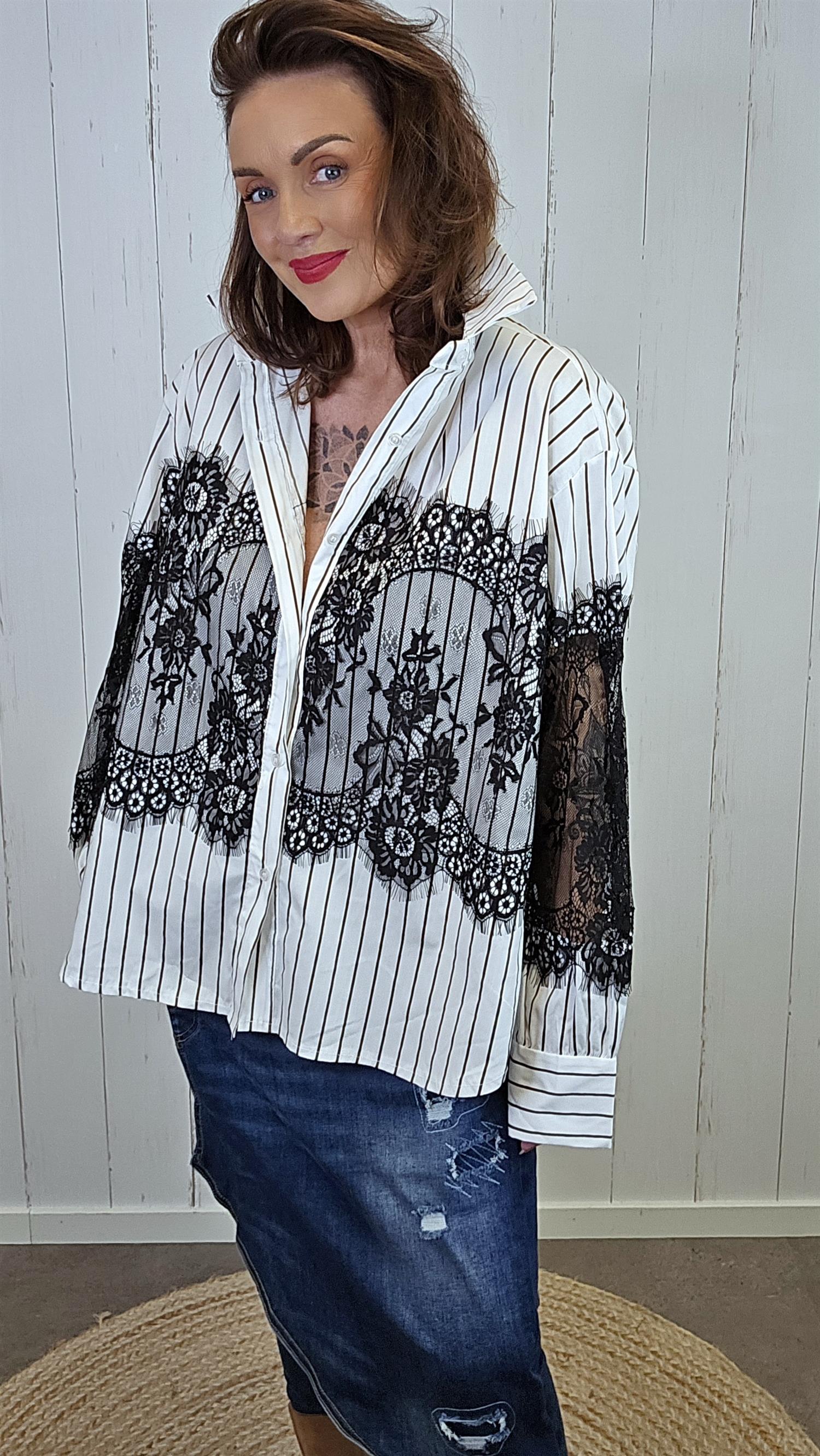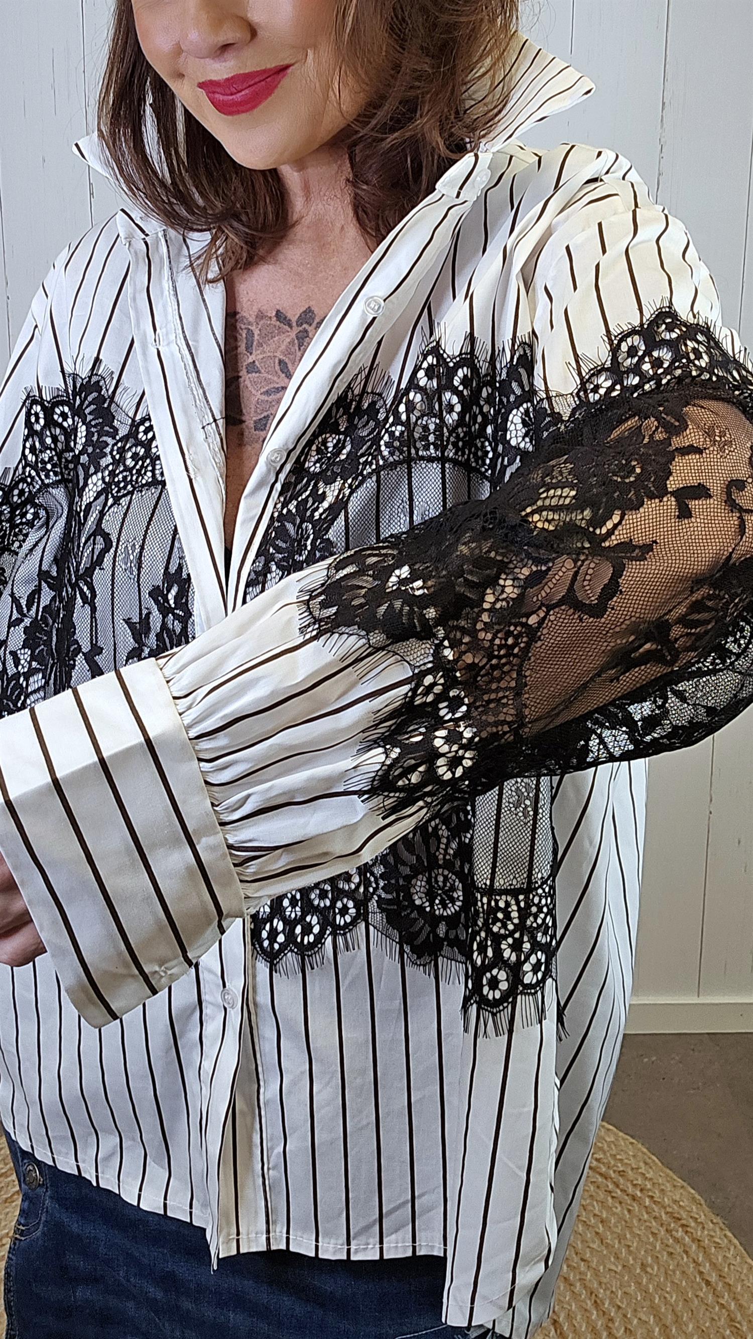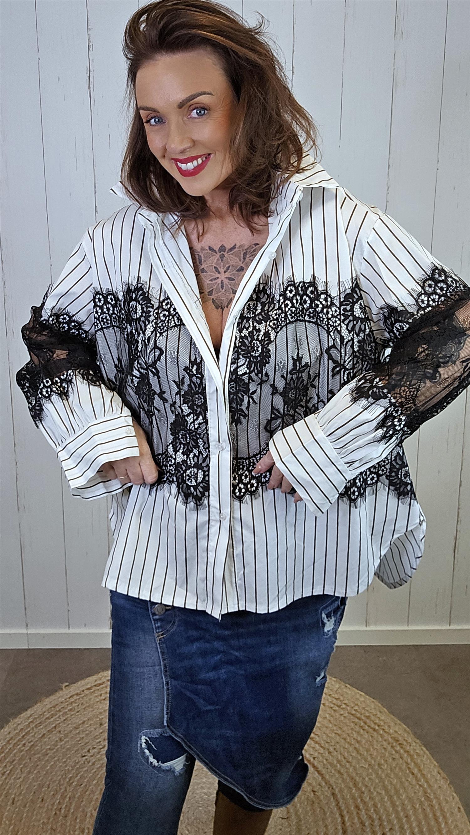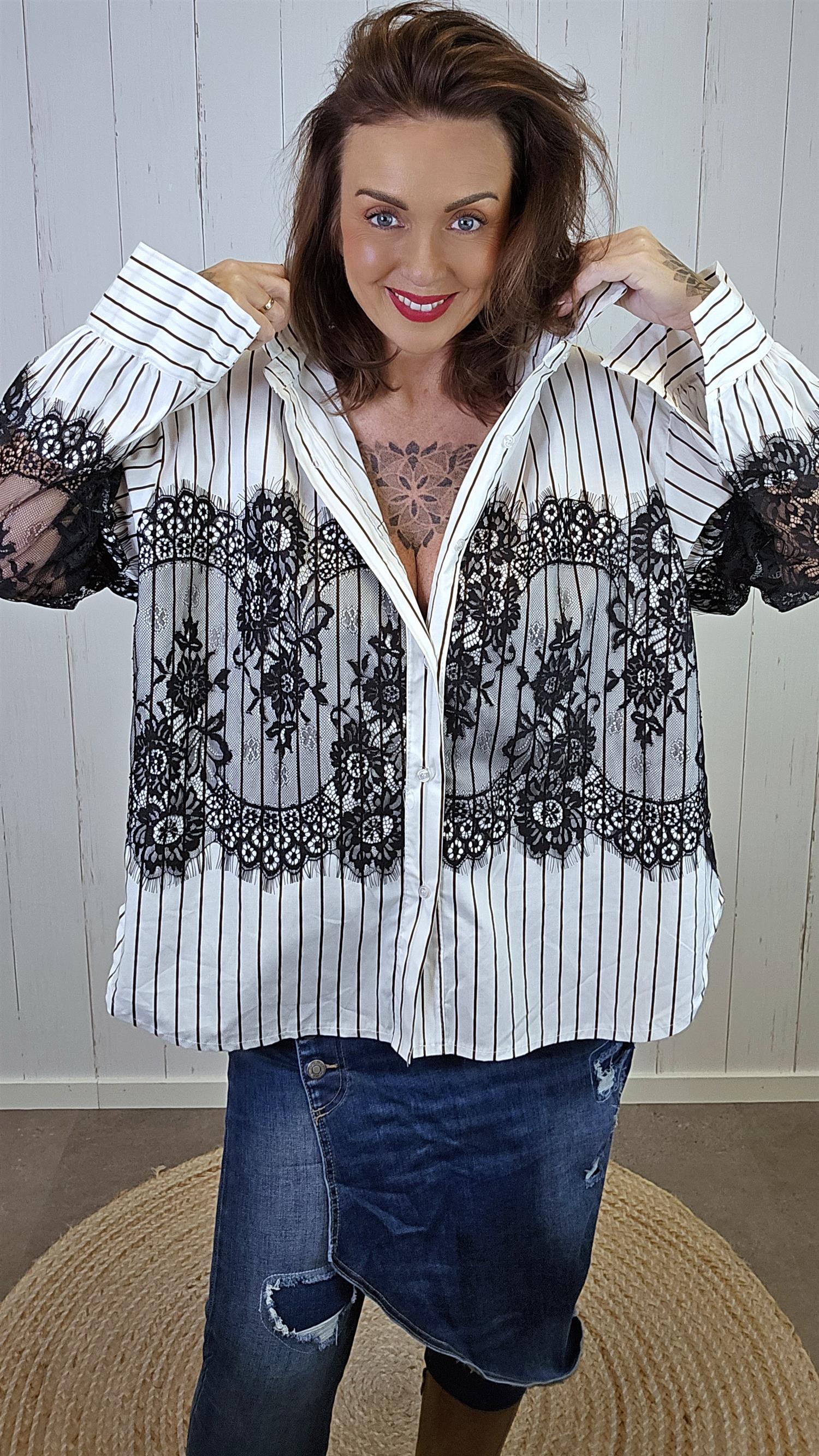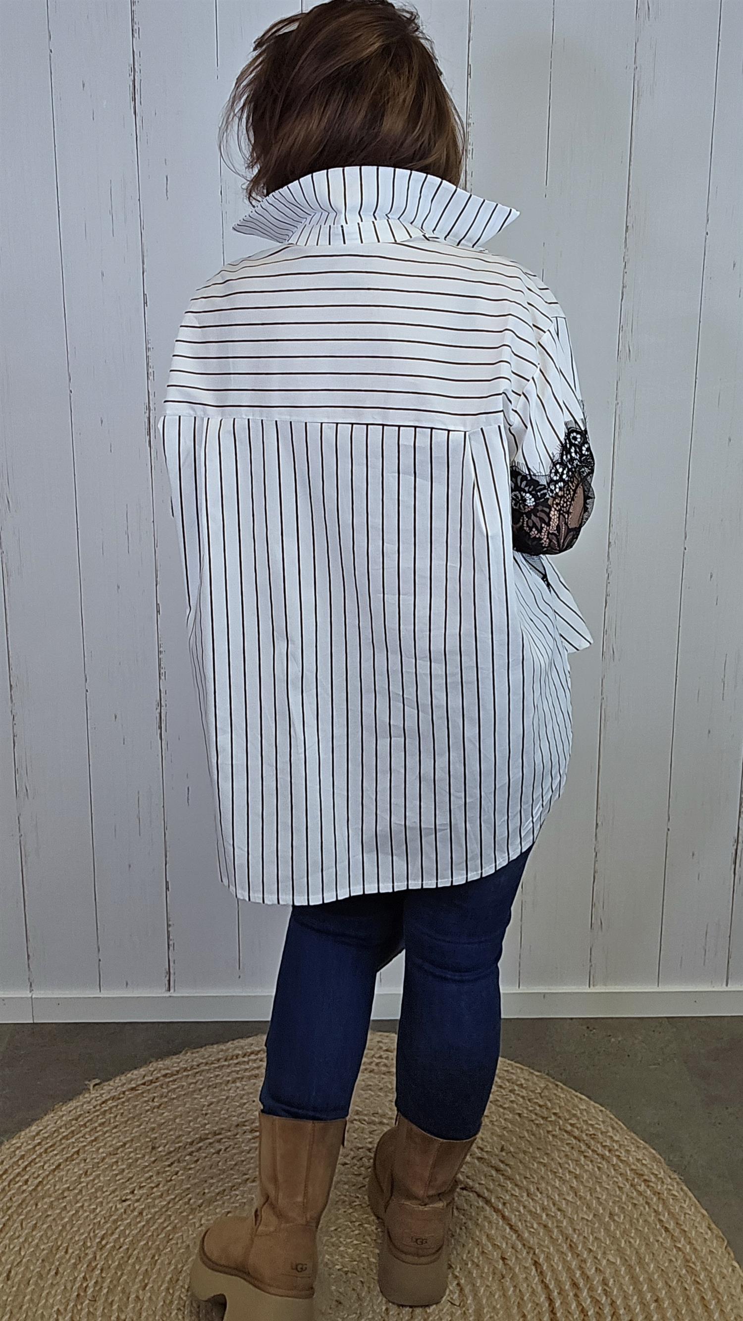 Lekker skjorte i bomull med smale, brune striper. Skjorten har påsydde svarte blonder midt foran som gir et elegant og unikt uttrykk. De lange ermene er også dekorert med svarte blonder for en gjennomført, feminin detalj. Den har krage og er designet med litt lengre lengde bak for en flatterende passform.