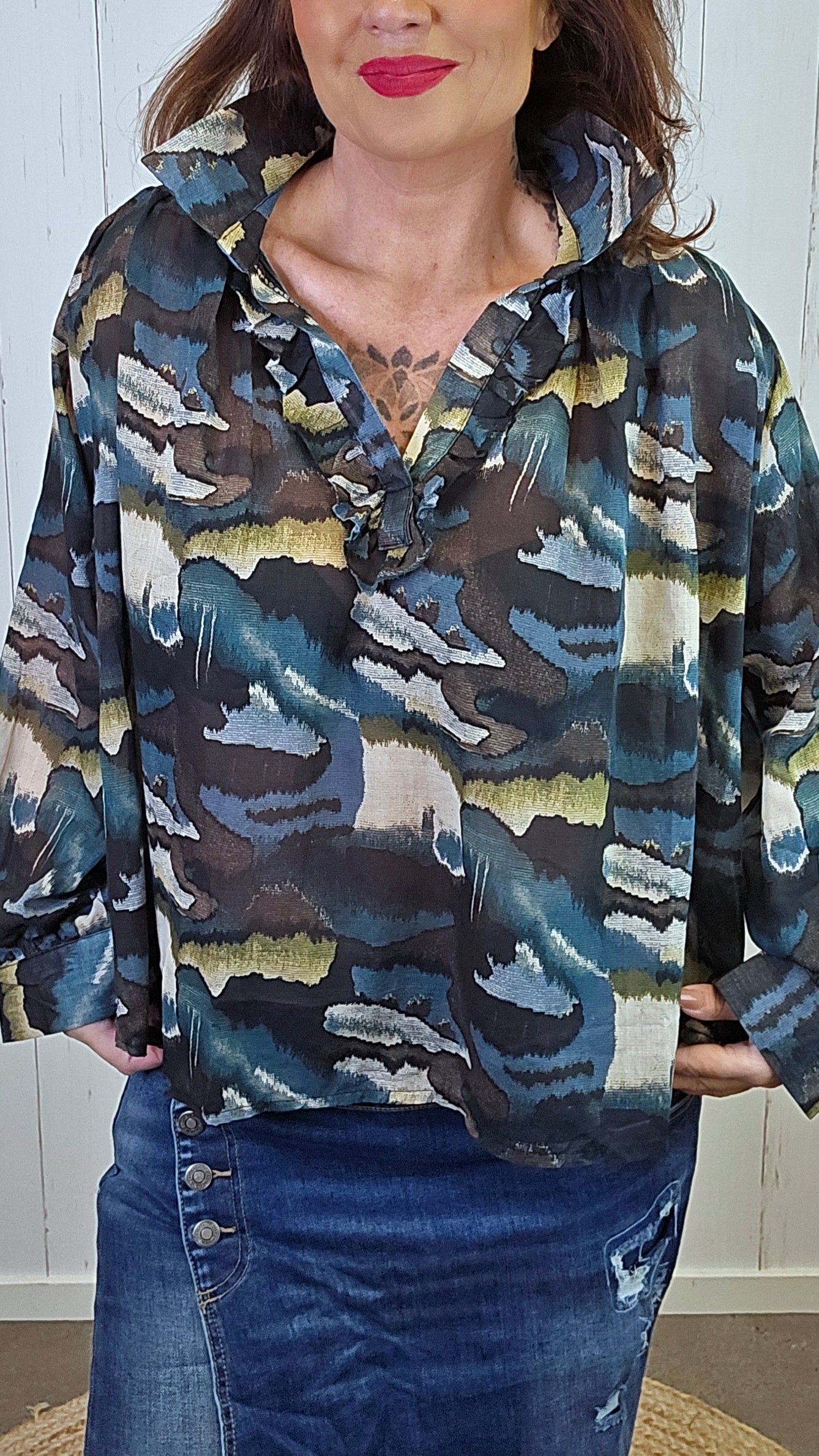 En tynn og lett bluse med vakker v-hals med krage, dekorert med fine volanger som gir et feminint og elegant uttrykk. Blusen har påsydde volanger langs halsåpningen og nedover fronten, noe som skaper et delikat og eksklusivt preg. Den har lange ermer og et nydelig print som gjør den perfekt både til hverdags og til mer pyntede anledninger.