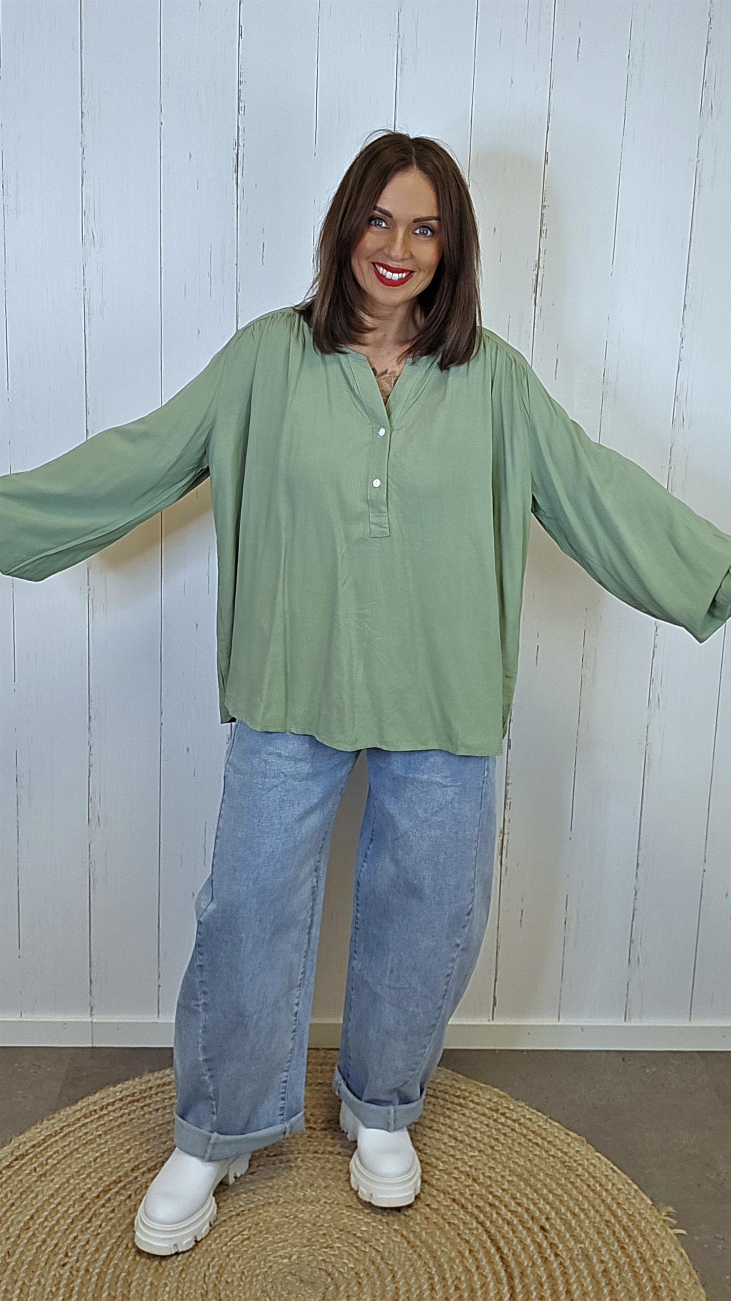 Så snygg skjorte bluse med extra god vidde. Så fin på. Långa puffiga armar med strikk nederst. Blusen faller läckert i ryggen. Knappar I halsen.