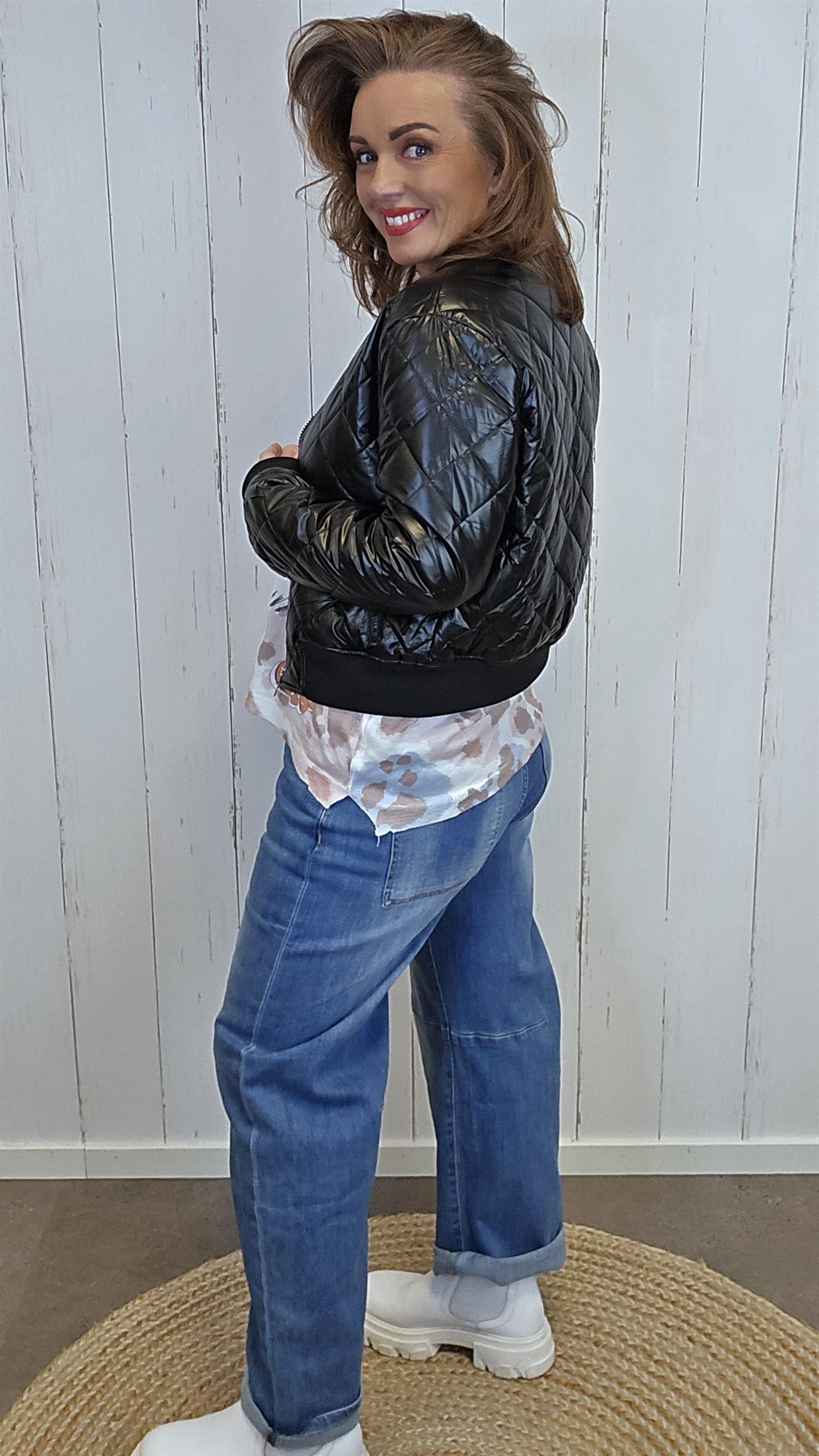 En lett og trendy quiltet jakke med blank finish og bomberfasong. Modellen har ribbestrikket hals, mansjetter og linning, samt glidelås i front. Jakken har to glidelåslommer og en komfortabel, rett passform som gjør den enkel å bruke til både hverdags og fritid. Normal I str.