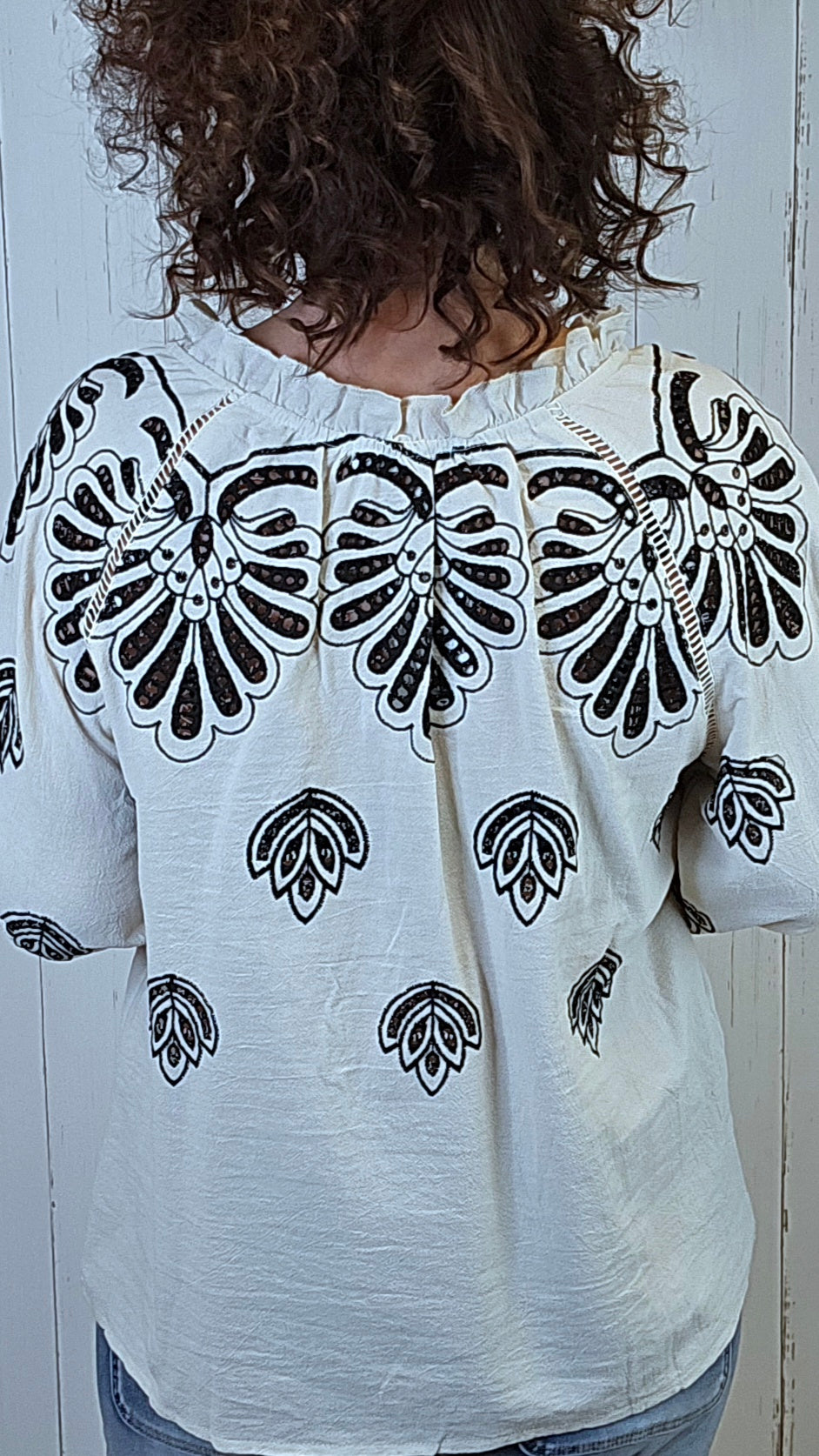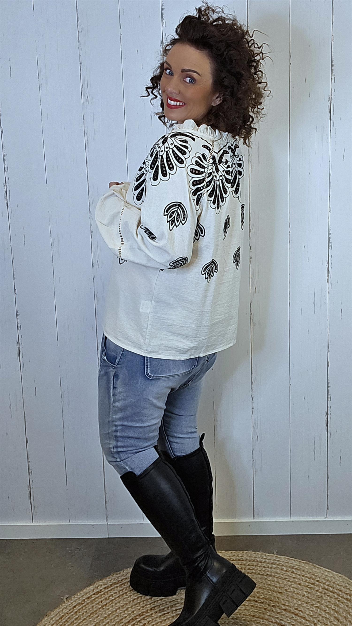 En vakker bomullsbluse med brodert mønster i sort som gir et bohemsk og eksklusivt uttrykk. Modellen har knyting i halsen, lett rynkede detaljer og vide ermer med dekorative utskjæringer. Stoffet er mykt, lett og behagelig, perfekt for både hverdag og ferielook.