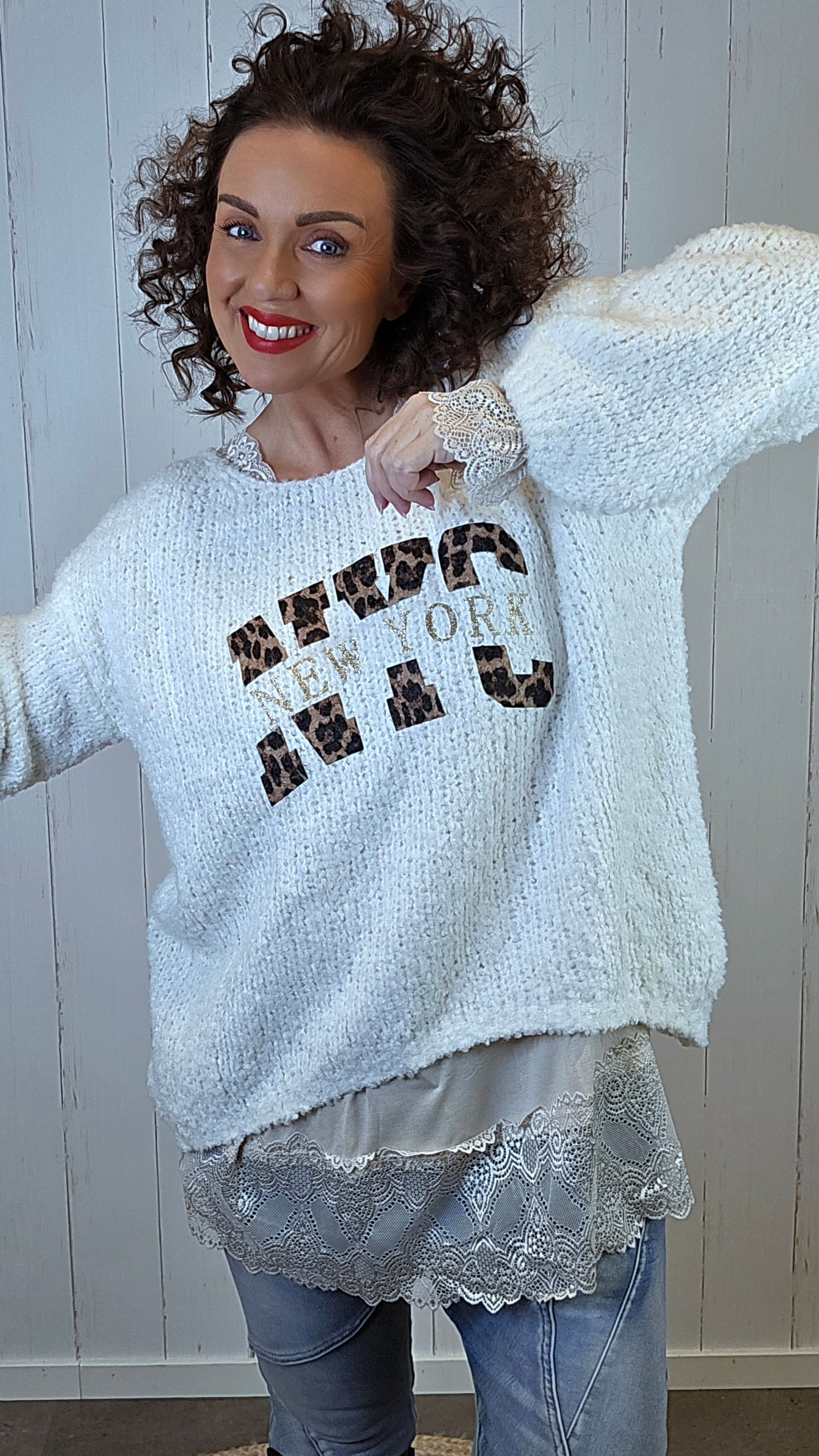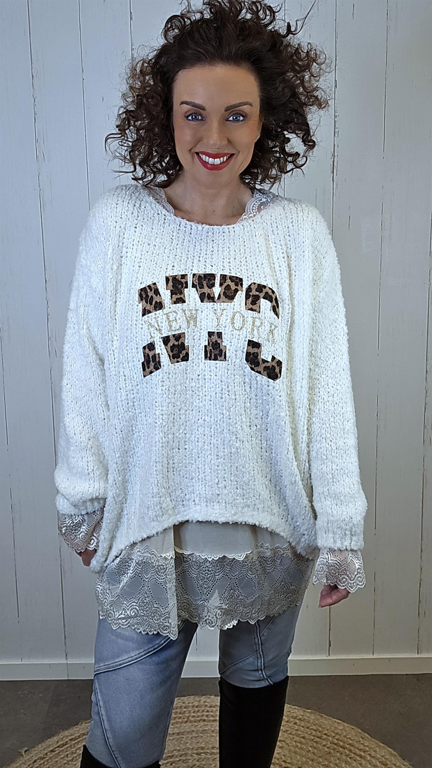 En myk og koselig strikkegenser med bouclé-struktur og avslappet passform. Modellen har et frontmotiv med leoparddetaljer og “New York”-tekst som gir et moderne og sporty uttrykk. De lange ermene og den luftige strikken gjør den både varm og behagelig å bruke.