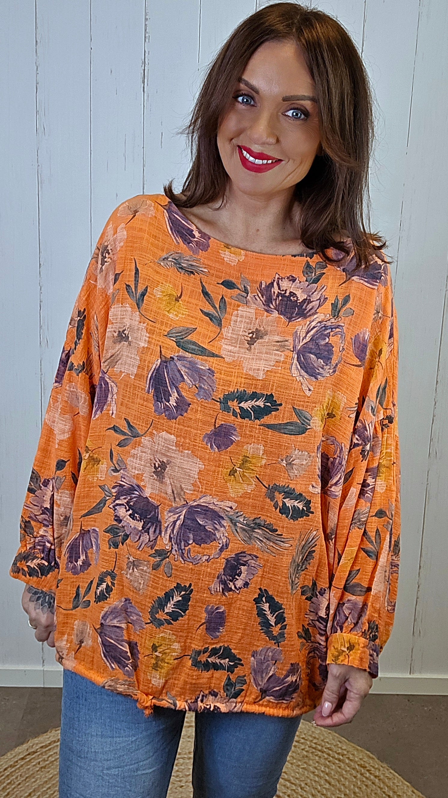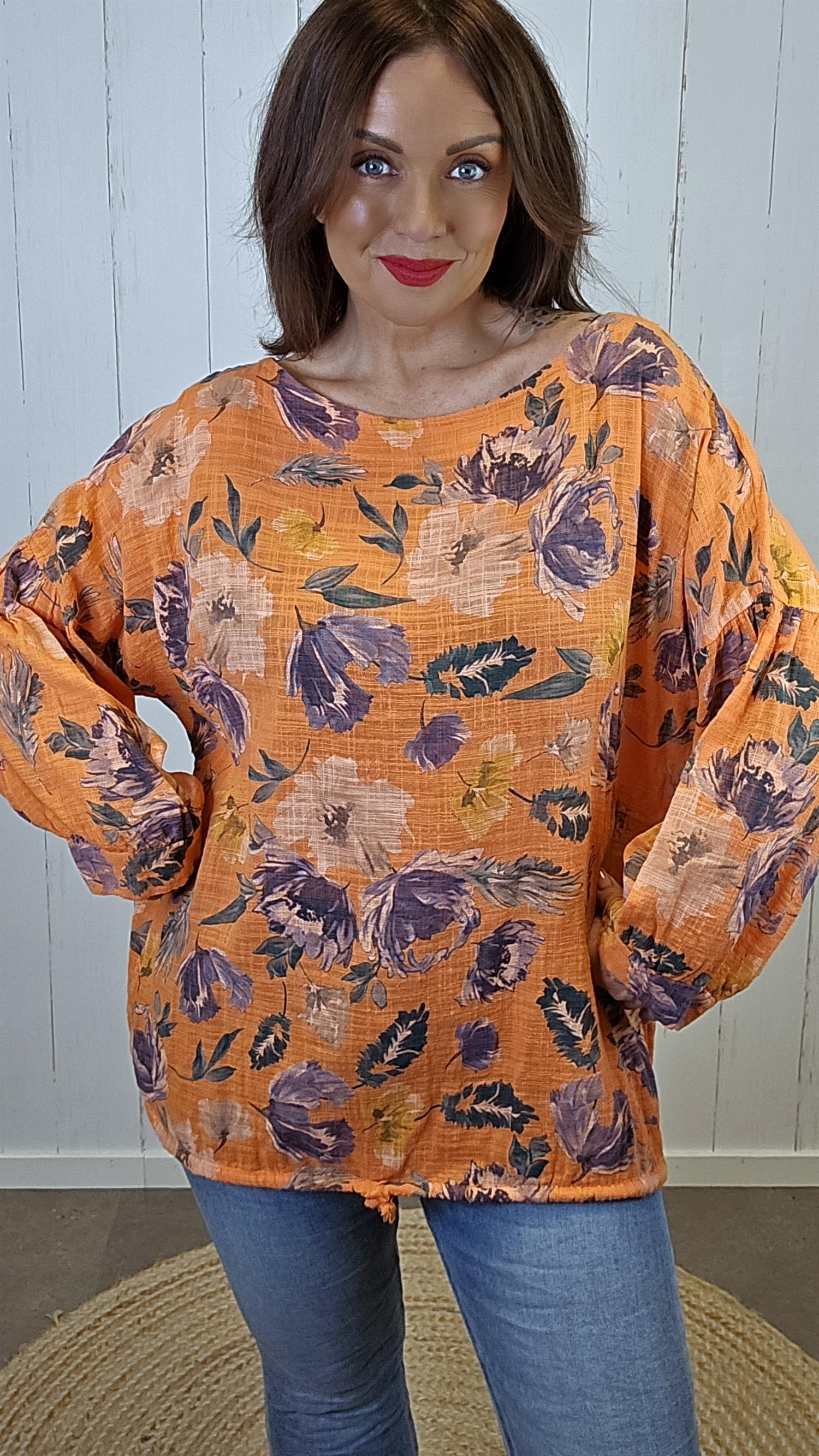 En lett og løs topp i 100 % bomull med vakkert blomsterprint i varme toner. Modellen har avslappet passform og justerbar snøring nederst som gjør det mulig å tilpasse fasongen. Ermene er vide og gir et luftig og behagelig uttrykk.