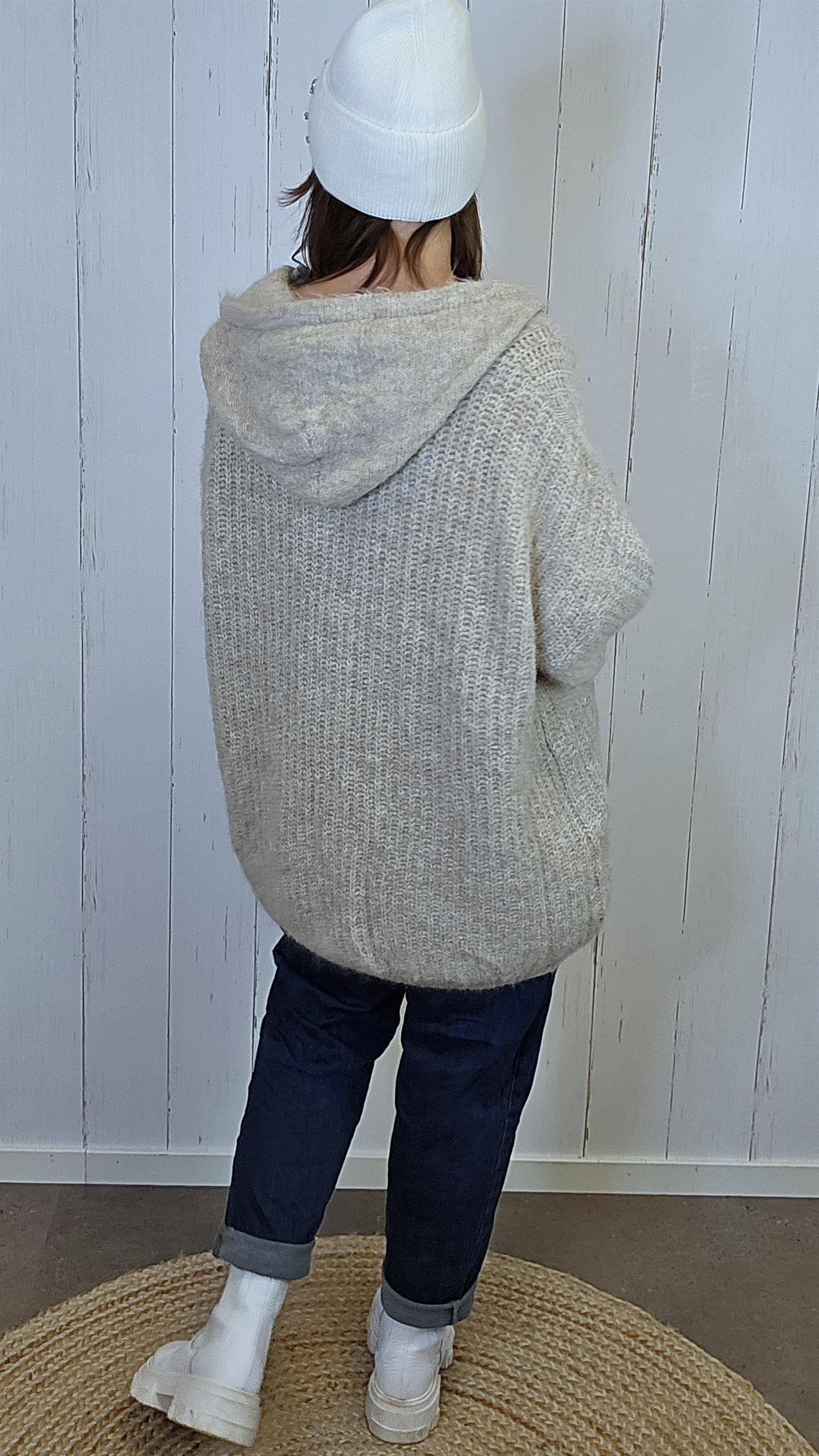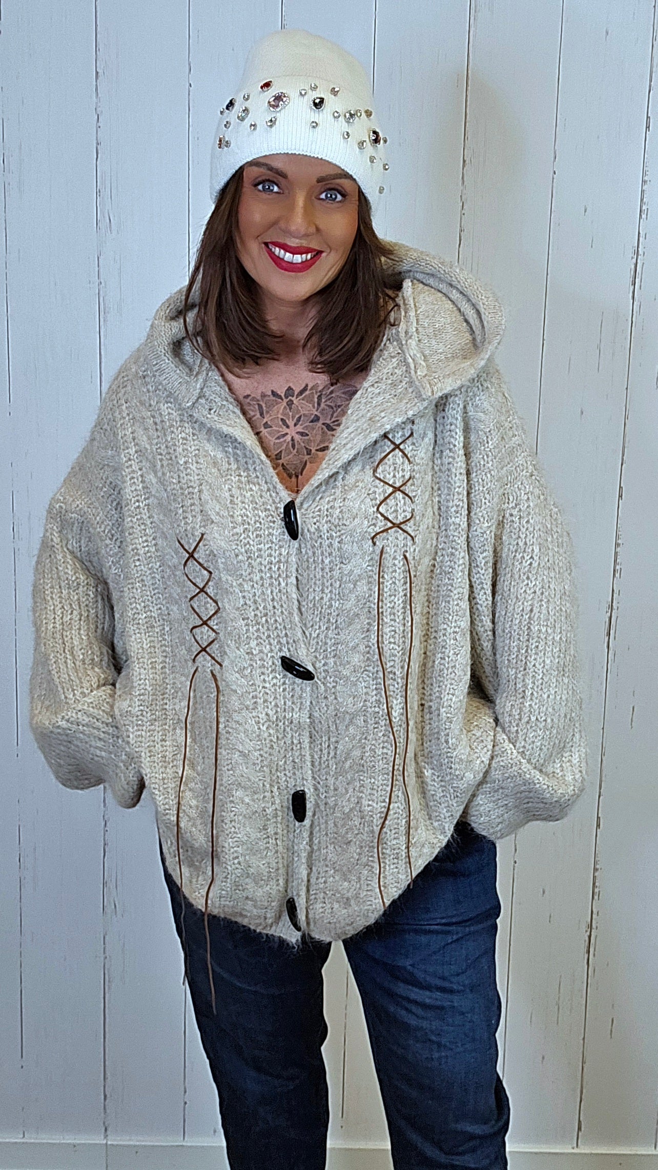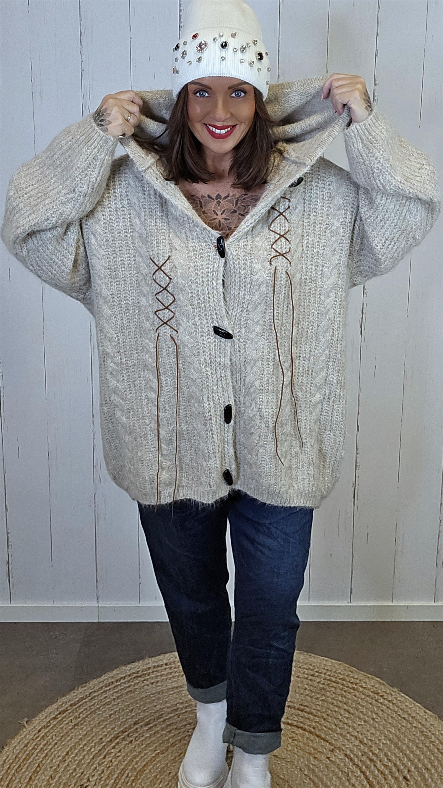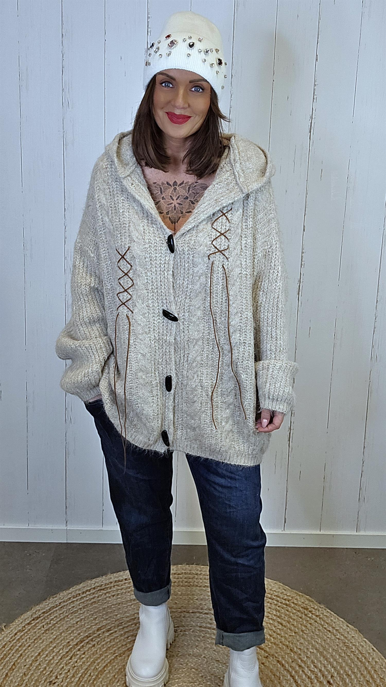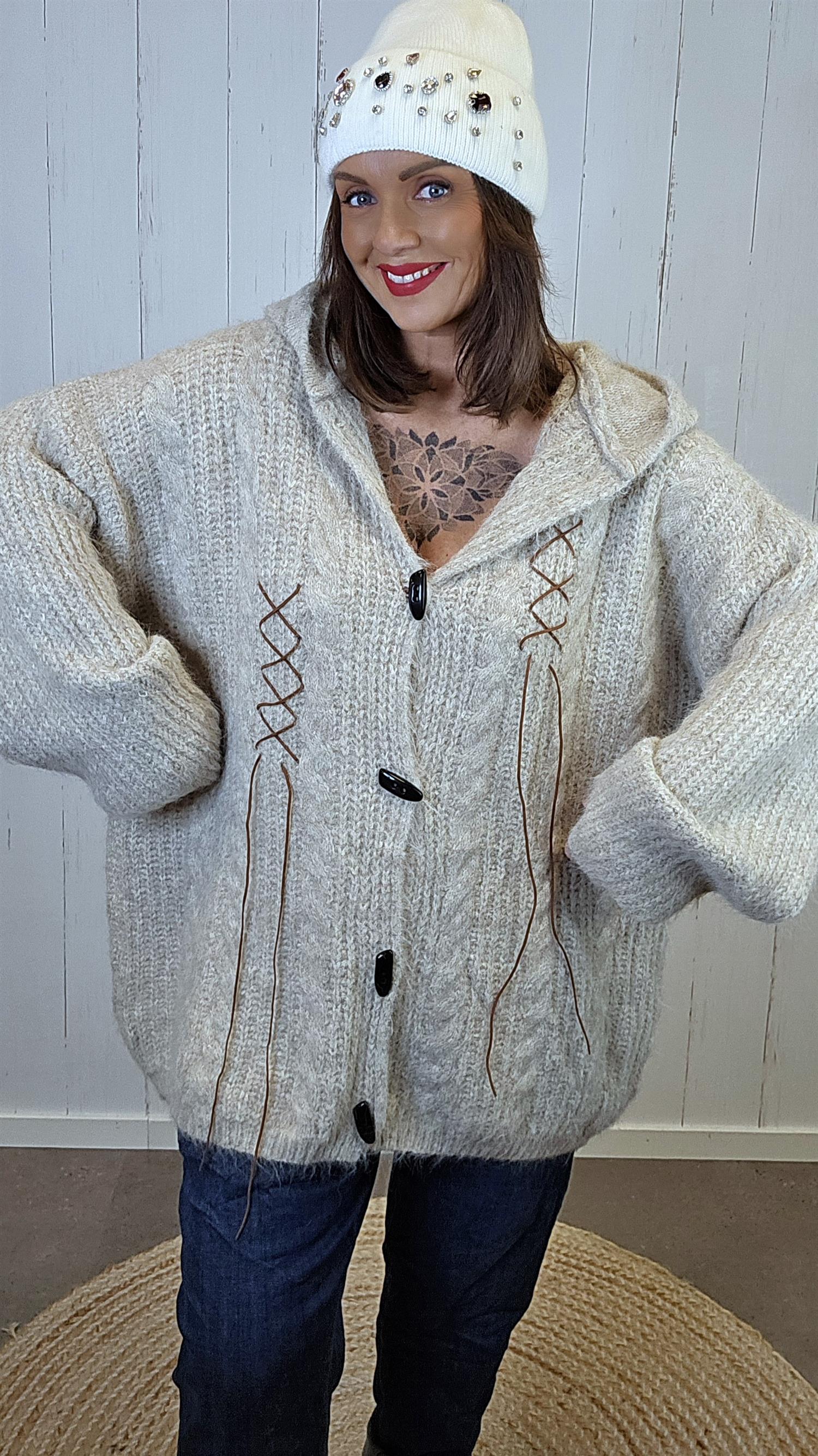 En lun og myk strikket jakke med hette og spennende detaljer i front. Runa-jakken har store sorte knapper og dekorative lærreimer sydd inn som unike kontraster i designet. Den grove strikken gir plagget et håndlaget preg, mens hetten tilfører en avslappet og moderne touch. En deilig jakke som holder deg varm, samtidig som den ser eksklusiv ut.