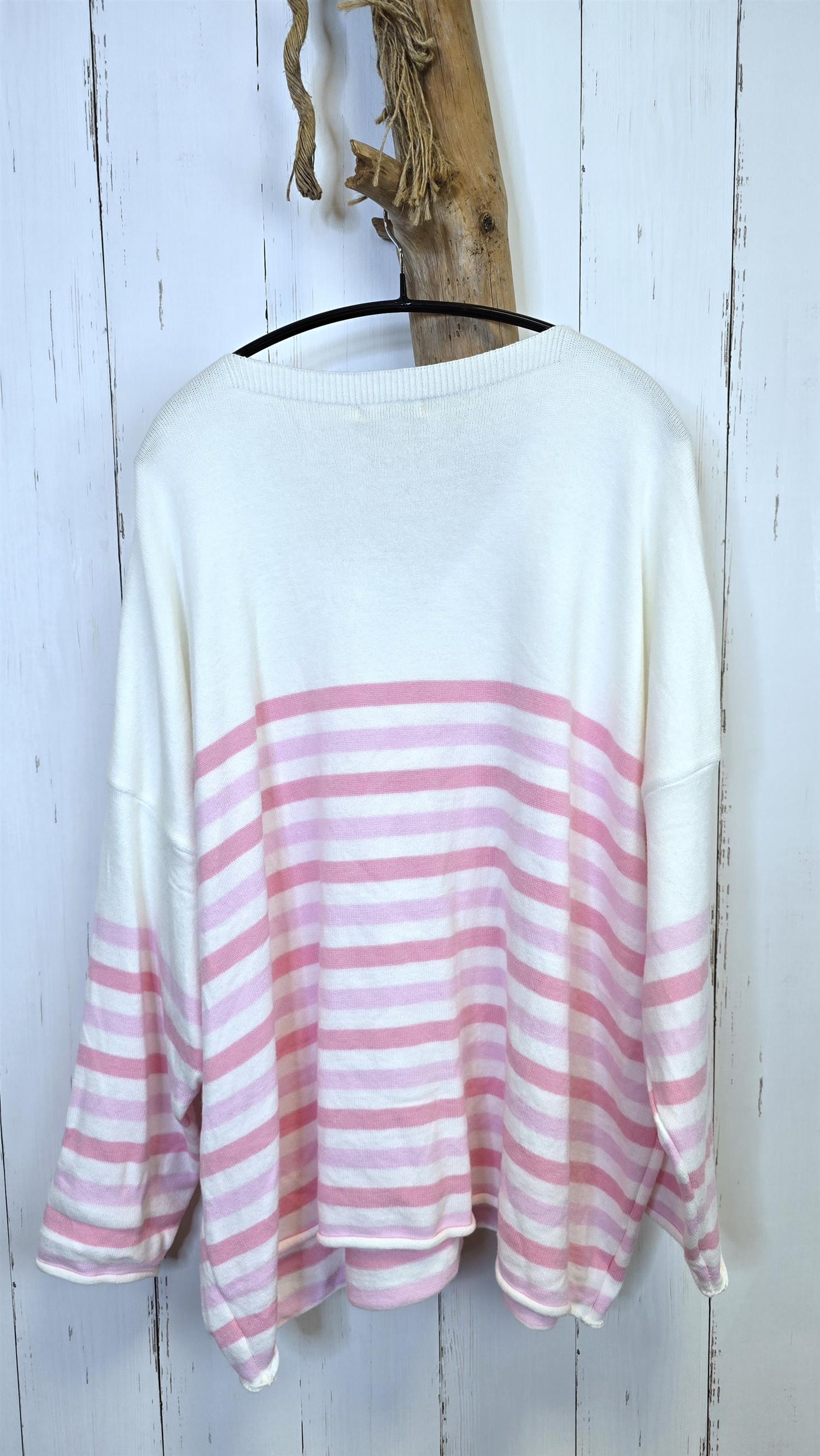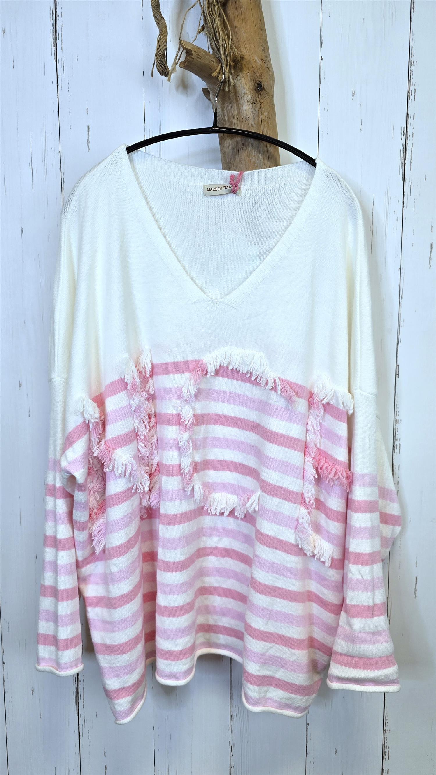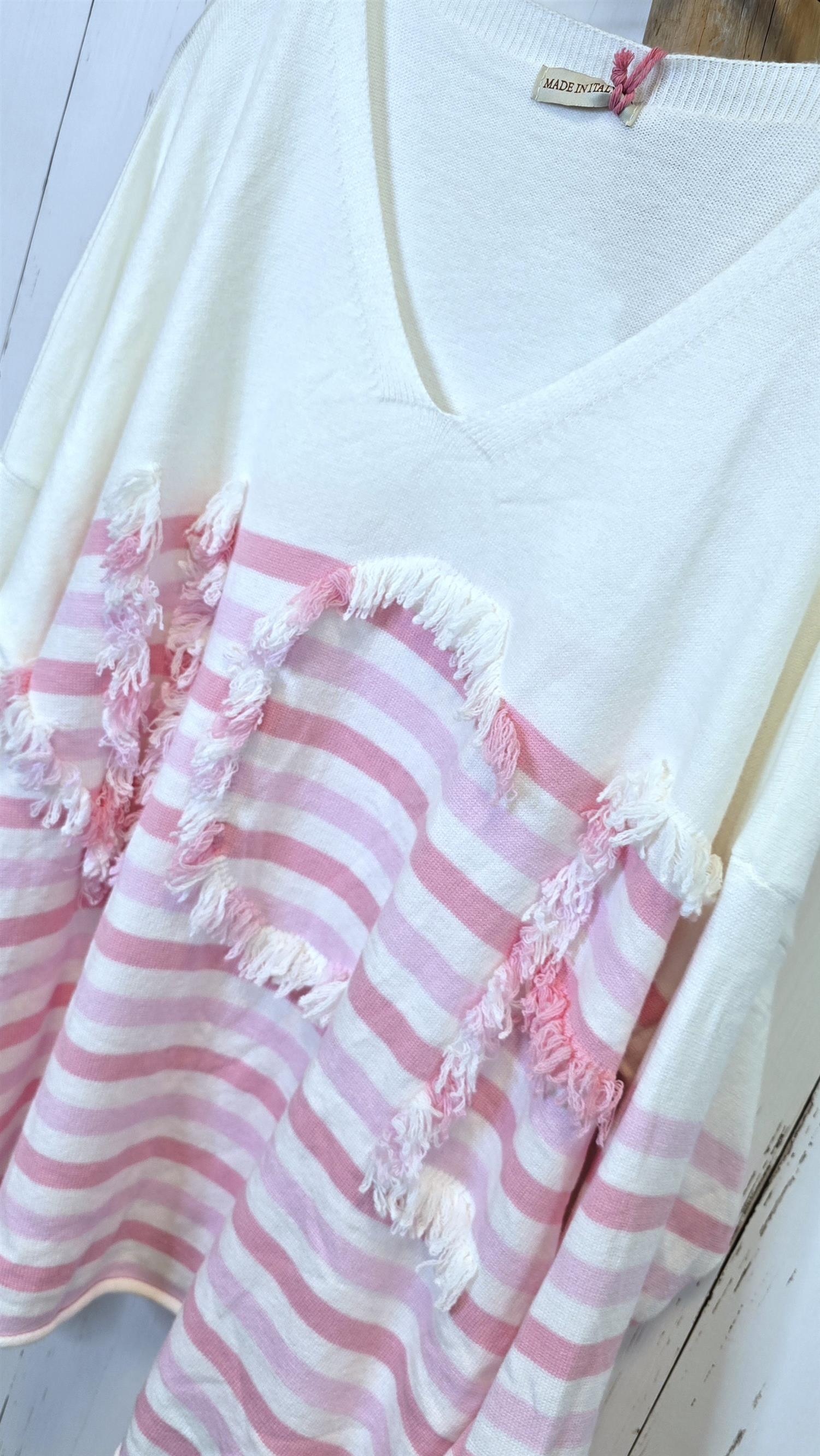Myk og behagelig strikkegenser med dekorativt frynsemønster på fremsiden som former ordet “NICE”. Genseren har en flatterende V-hals, avslappet passform og et stilrent stripemønster i offwhite og beige toner. Frynsedetaljene gir plagget et unikt og lekent uttrykk, samtidig som stoffet føles lett og komfortabelt mot huden. Et perfekt statement-plagg som er like fint til hverdags som til en mer pyntet anledning.