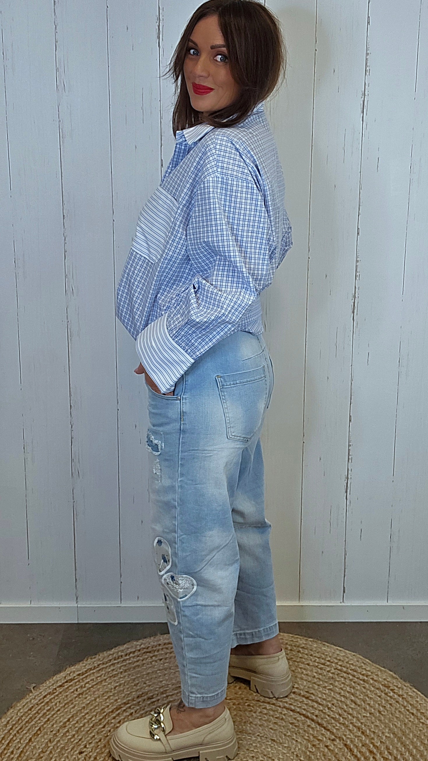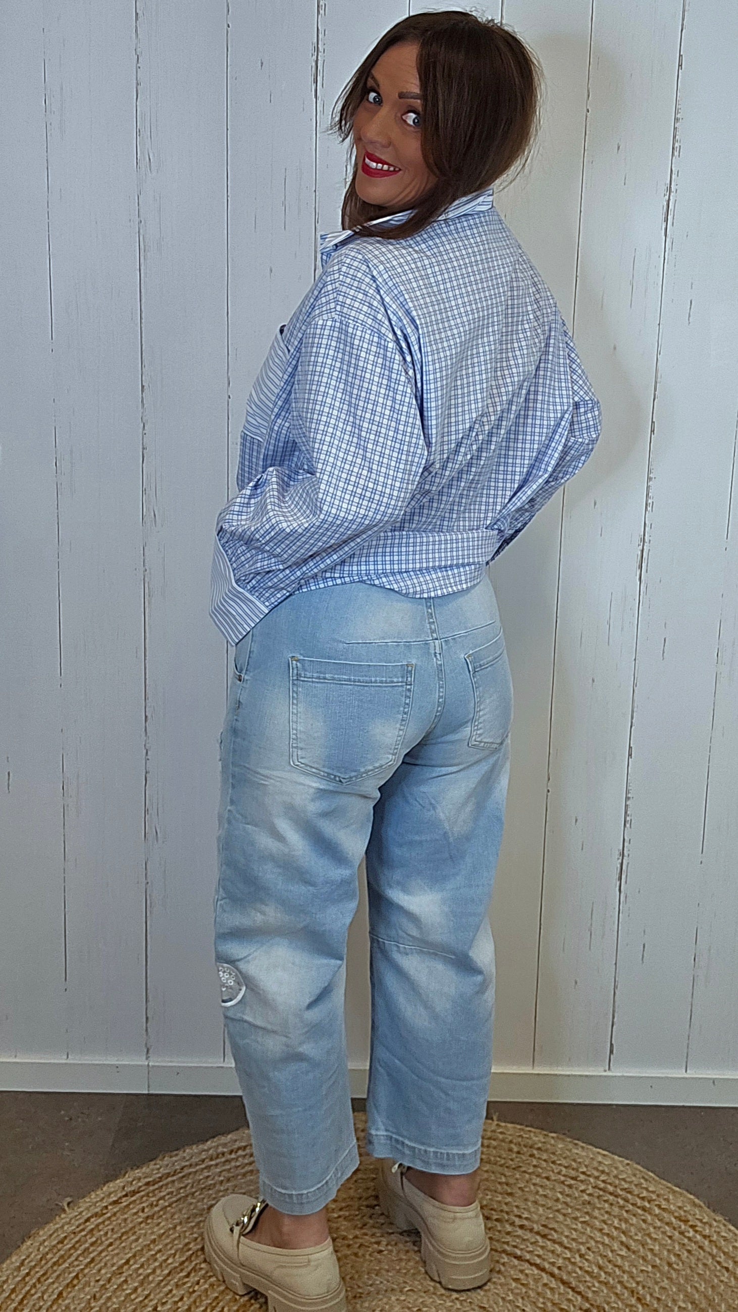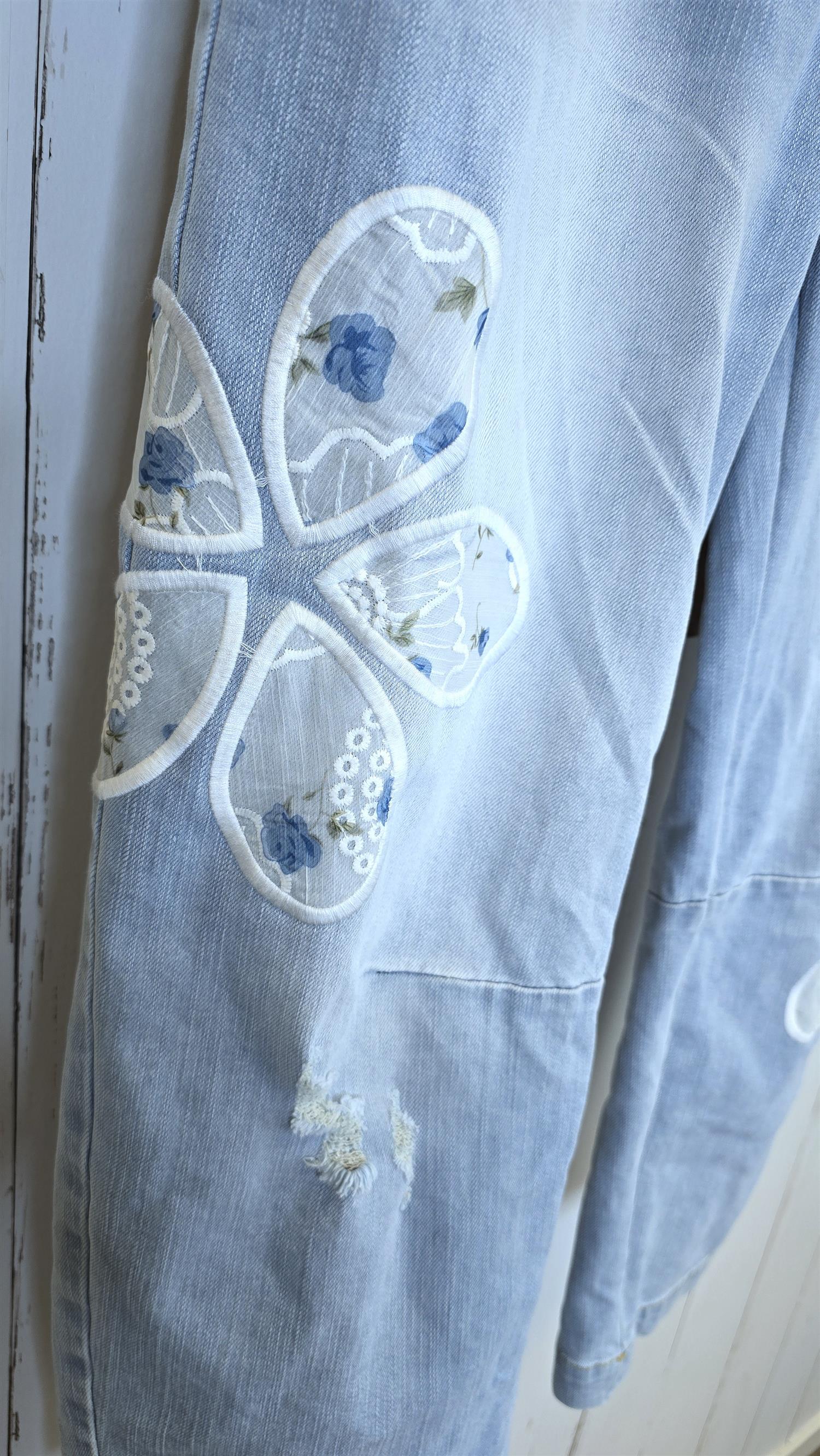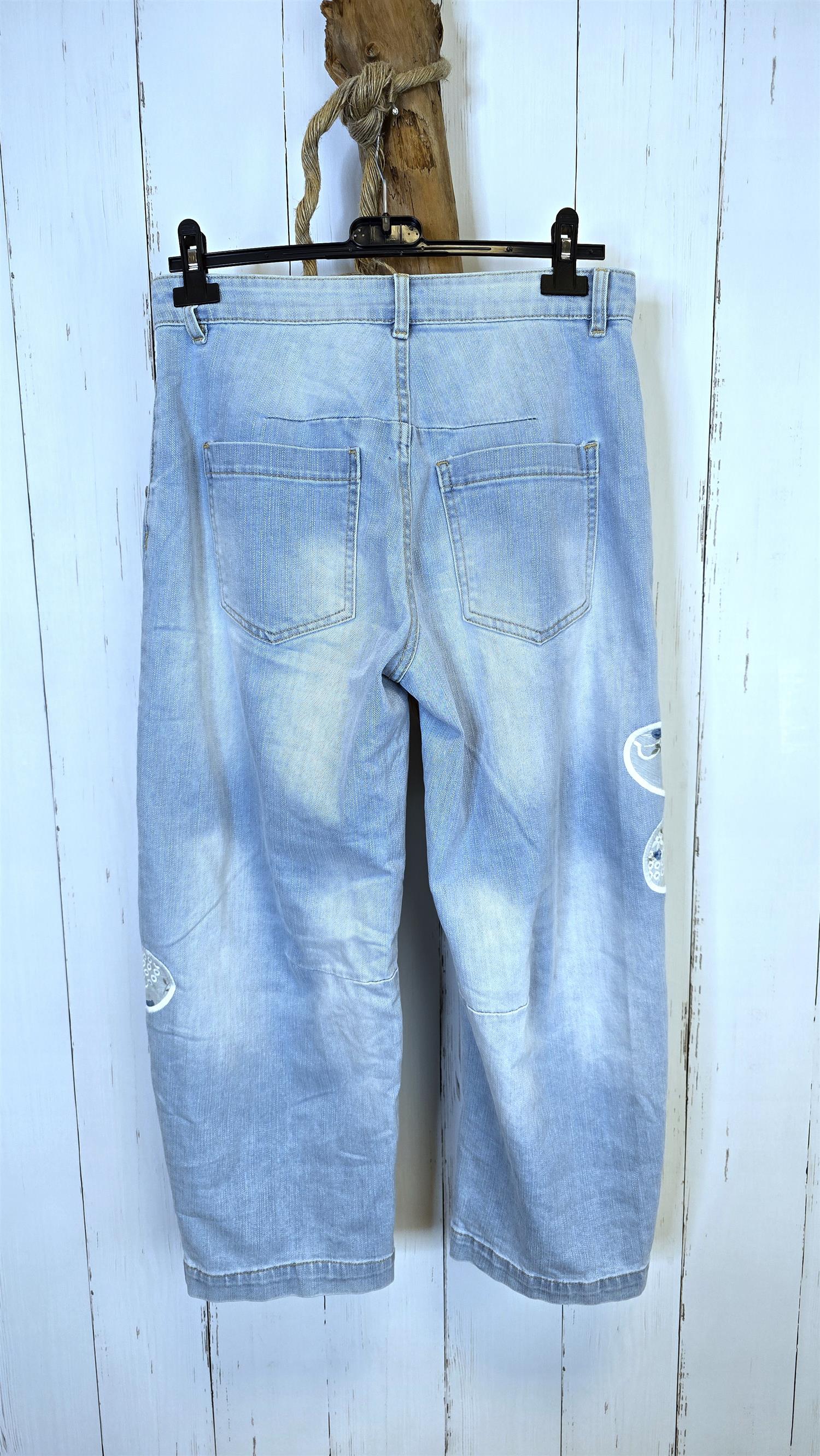 Superstilig jeans med litt ekstra vidde i lårene og en flatterende fasong. Modellen har fastere stretch som gir god komfort gjennom hele dagen. De påsydde blomsterdetaljene på bena gir jeansen et unikt og feminint uttrykk. Klassisk utforming med lommer i siden, lommer bak og glidelås i front. Liten I str pga av den er fastere i midjen. Liten I size. Ingen stretch I midjen.