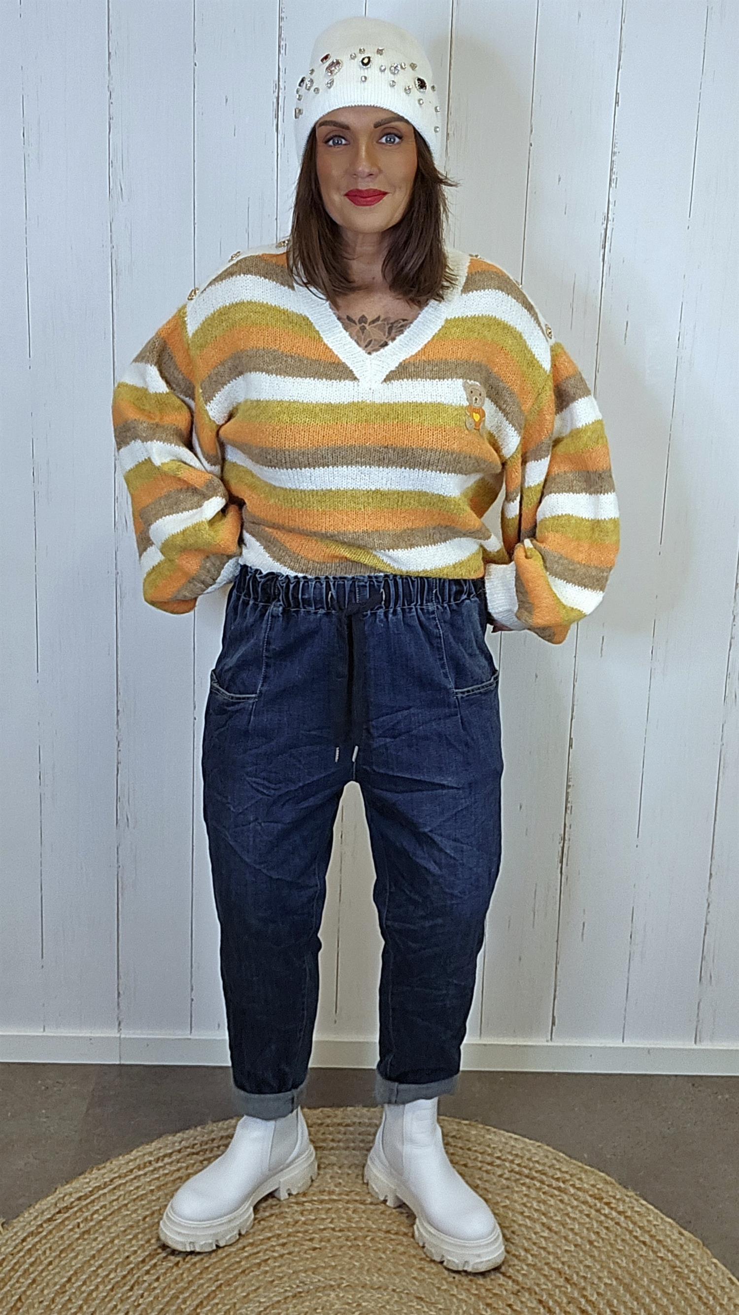 Superbehagelig jeans med strikk i livet som gir ekstra komfort og fleksibilitet. Modellen har dype lommer i front som både er praktiske og gir et pent uttrykk. Jeansen har god vidde, med ekstra romslighet over lårene, og kommer i en fin, mørkblå nyanse som er enkel å style til mange anledninger. En komfortabel hverdagsjeans med avslappet passform.
