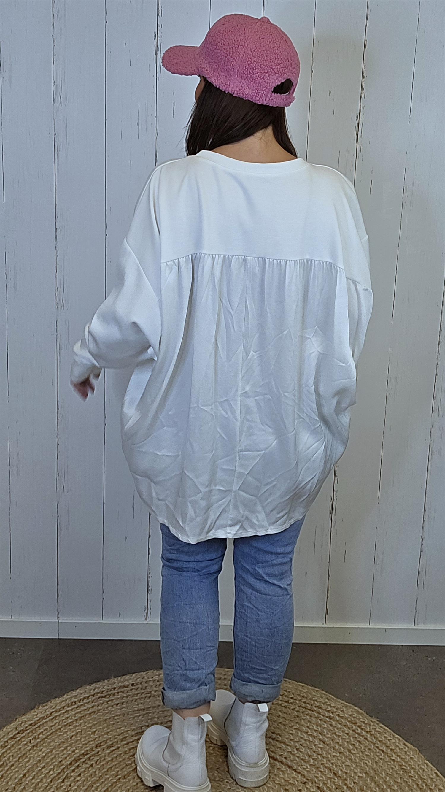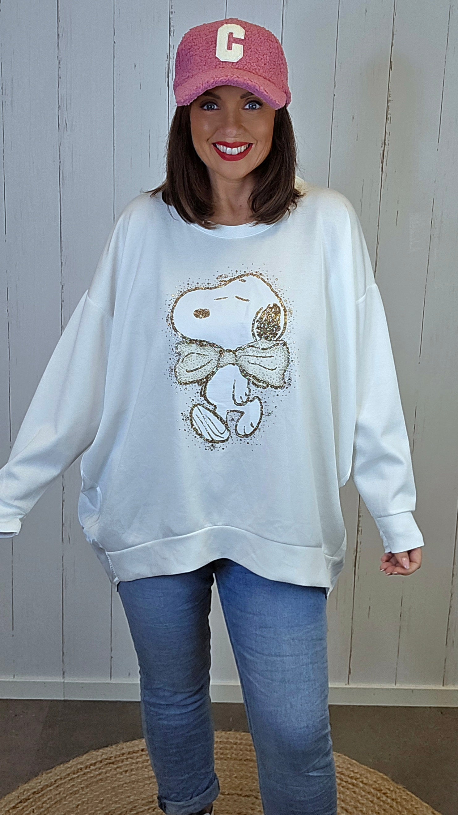 Myk og behagelig genser i lys offwhite tone med dekorativ Snoopy-illustrasjon på fronten. Motivet er pyntet med delikate steiner som gir et elegant og eksklusivt preg uten å bli for mye. Modellen har rund hals, lange ermer og et avslappet snitt med lengre bakstykke enn front. Stoffet er svært mykt på innsiden og føles komfortabel mot huden – perfekt til både hverdagsbruk og rolige dager.
