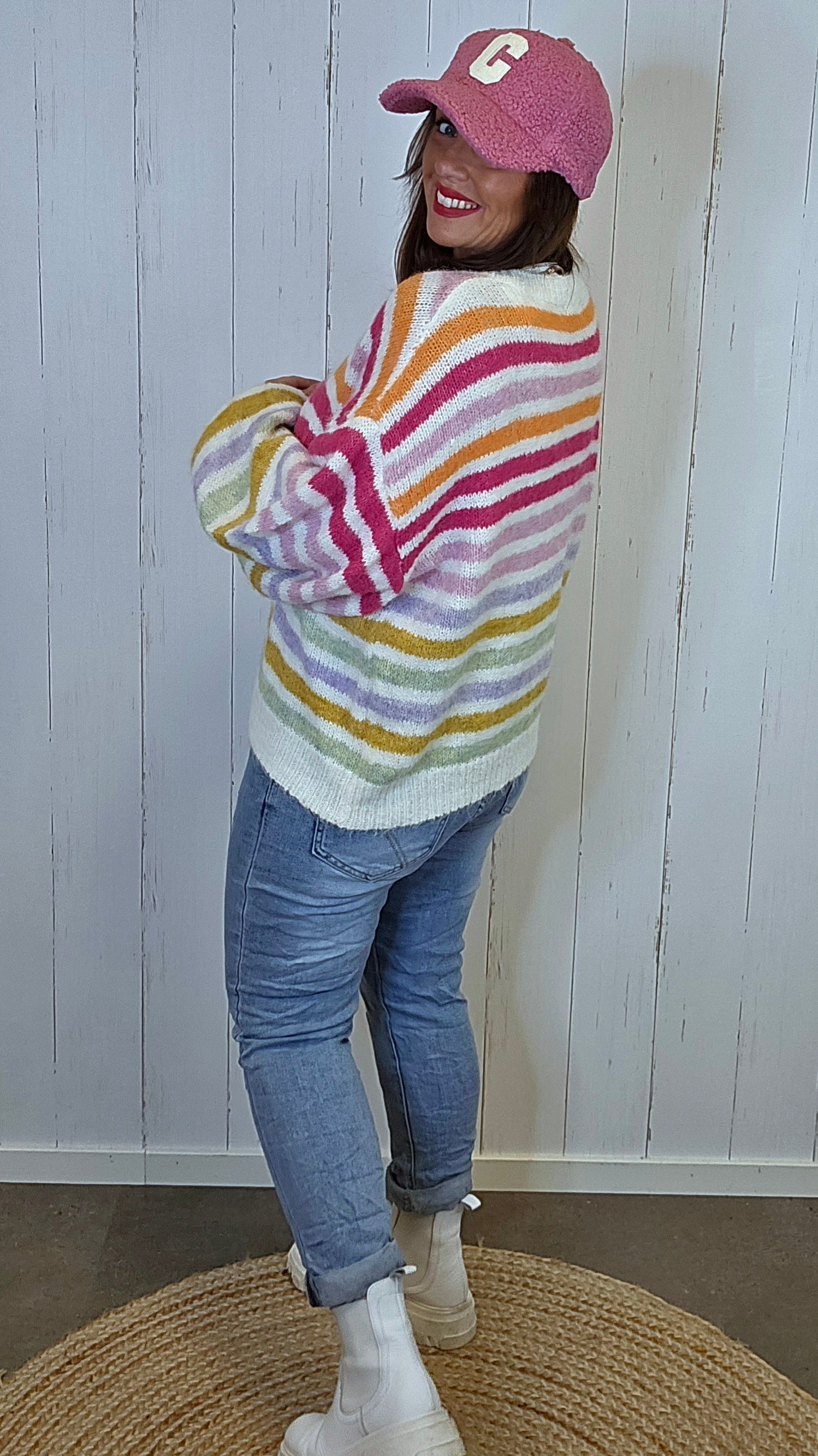 Myk og behagelig strikkegenser med lekent stripemønster i varme, delikate toner. Genseren har en feminin V-hals og et dekorativt brodert motiv i front med teksten “Chérie” og et lite hjerte, som gir plagget et sjarmerende og eksklusivt uttrykk. Passformen er avslappet, med god vidde over bysten og komfortable ermer. En deilig genser som både varmer og løfter antrekket.
