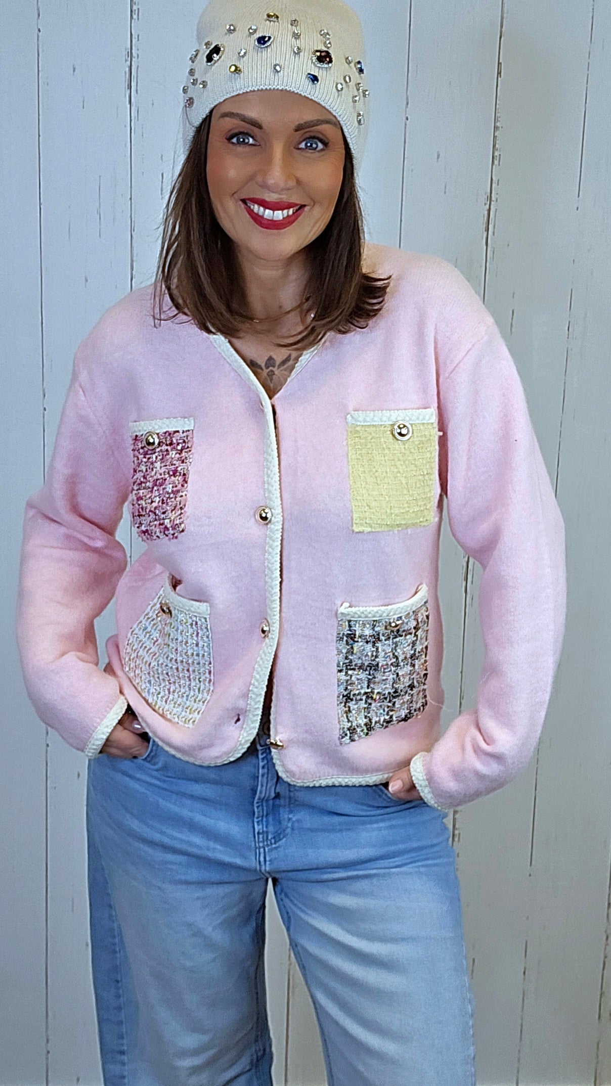 Kort og superfin jakke i myk, strikket kvalitet med elegante lappede detaljer i front. Modellen har rund hals og dekorative knapper som gir et feminint og sofistikert uttrykk. Den korte lengden gir en lett og moderne silhuett, samtidig som materialet føles behagelig og mykt mot huden.