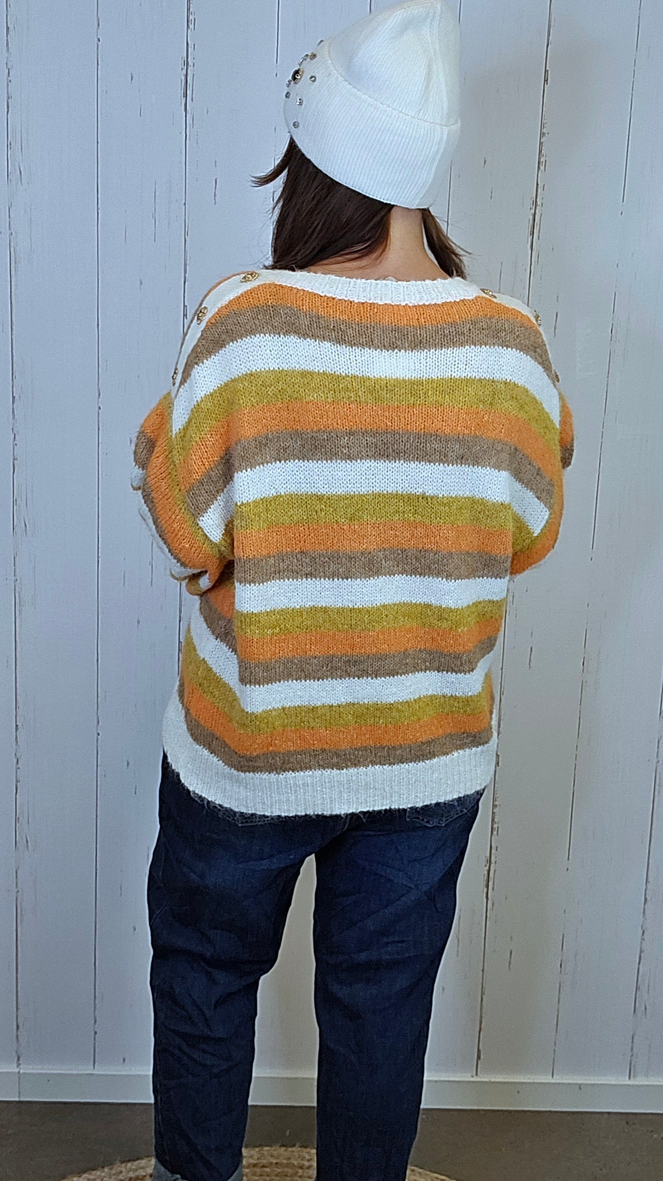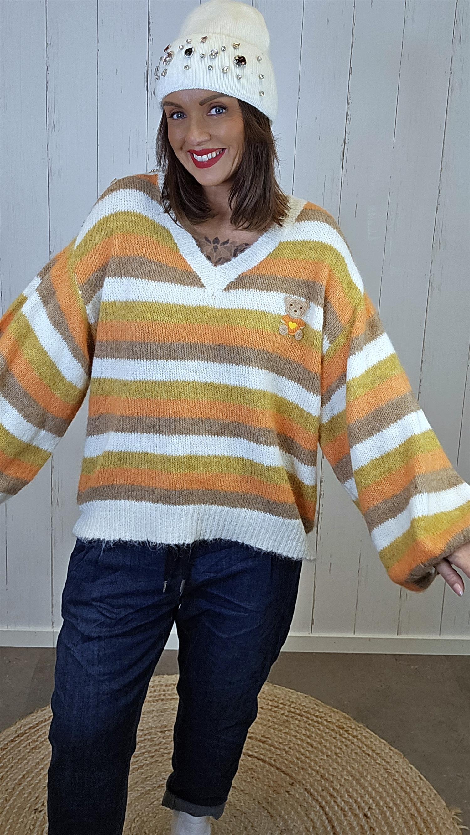 Myk og behagelig strikkegenser med klassisk V-hals og et delikat stripemønster i lune nyanser av krem, brun, oliven og orange. Genseren har en avslappet passform og er svært behagelig på kroppen. På venstre bryst sitter en liten dekorativ teddy som gir et lekent uttrykk, og langs skuldrene er det påsatt fine metallblomster som tilfører det lille ekstra. En genser som kombinerer komfort med unike detaljer.