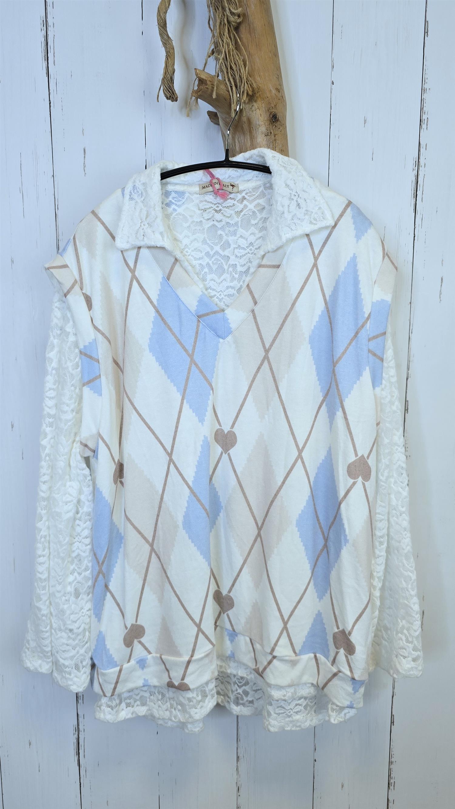 Dette er et 2-i-1-plagg som består av en myk vest med argylemønster og en blondetopp med krage på innsiden. Plaggene er separate og kan tas fra hverandre, men selges samlet som én vare. Resultatet er et gjennomført og litt mer pyntet uttrykk, samtidig som det er komfortabelt i bruk. Vesten har V-hals, mens blondetoppen gir et delikat lag med blondeermer og krage som synes både i halsen og nederst.
