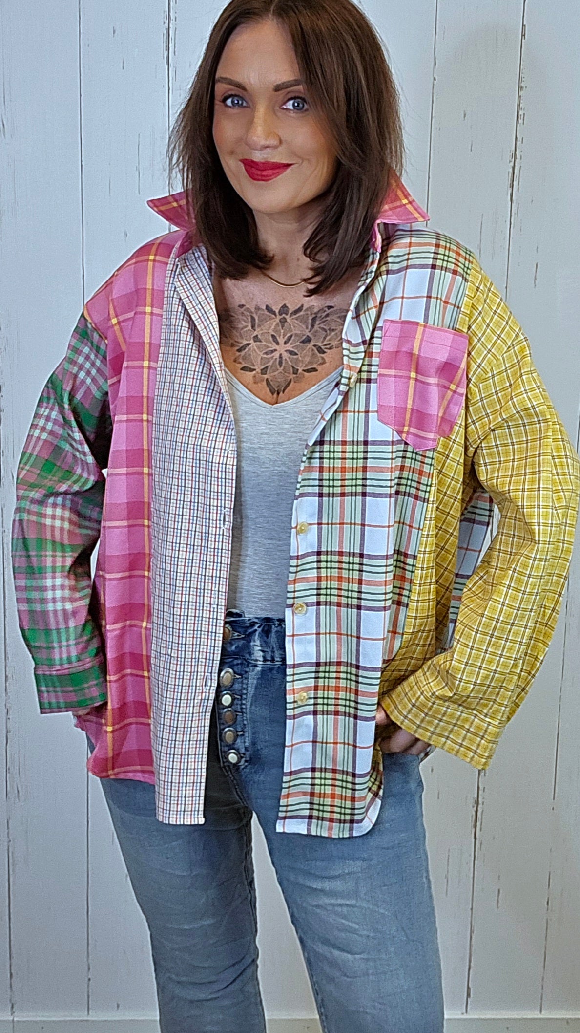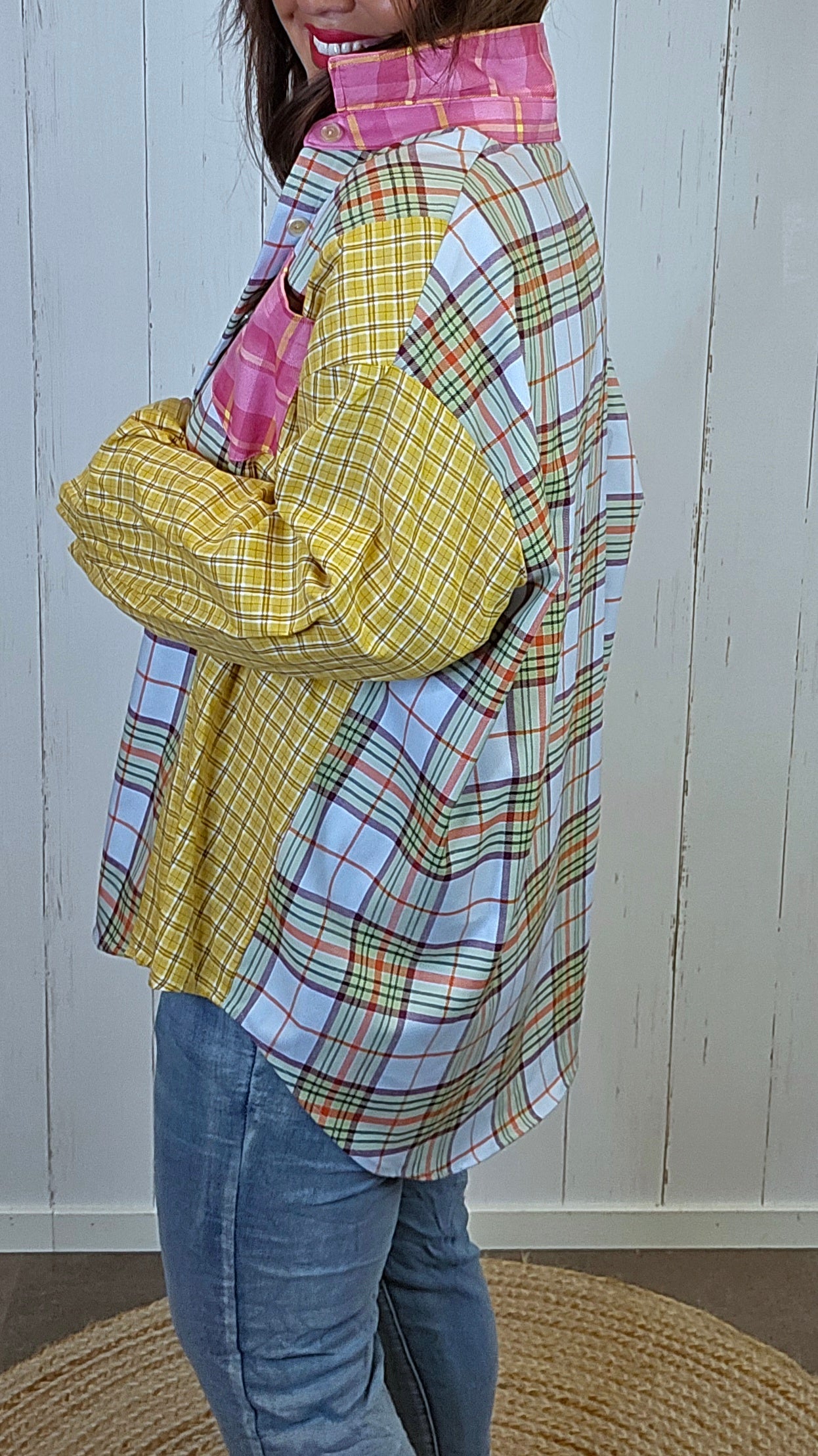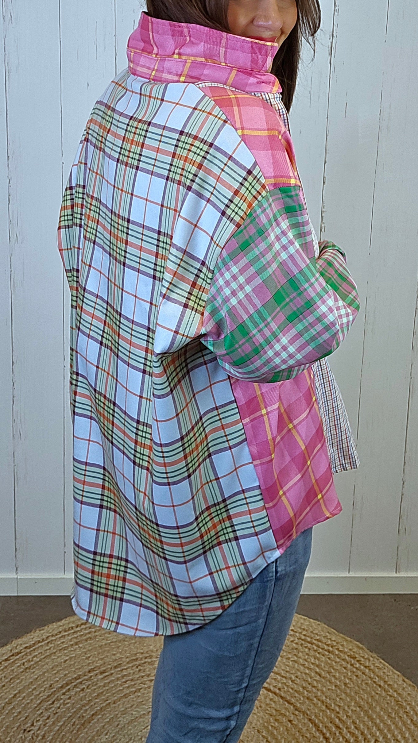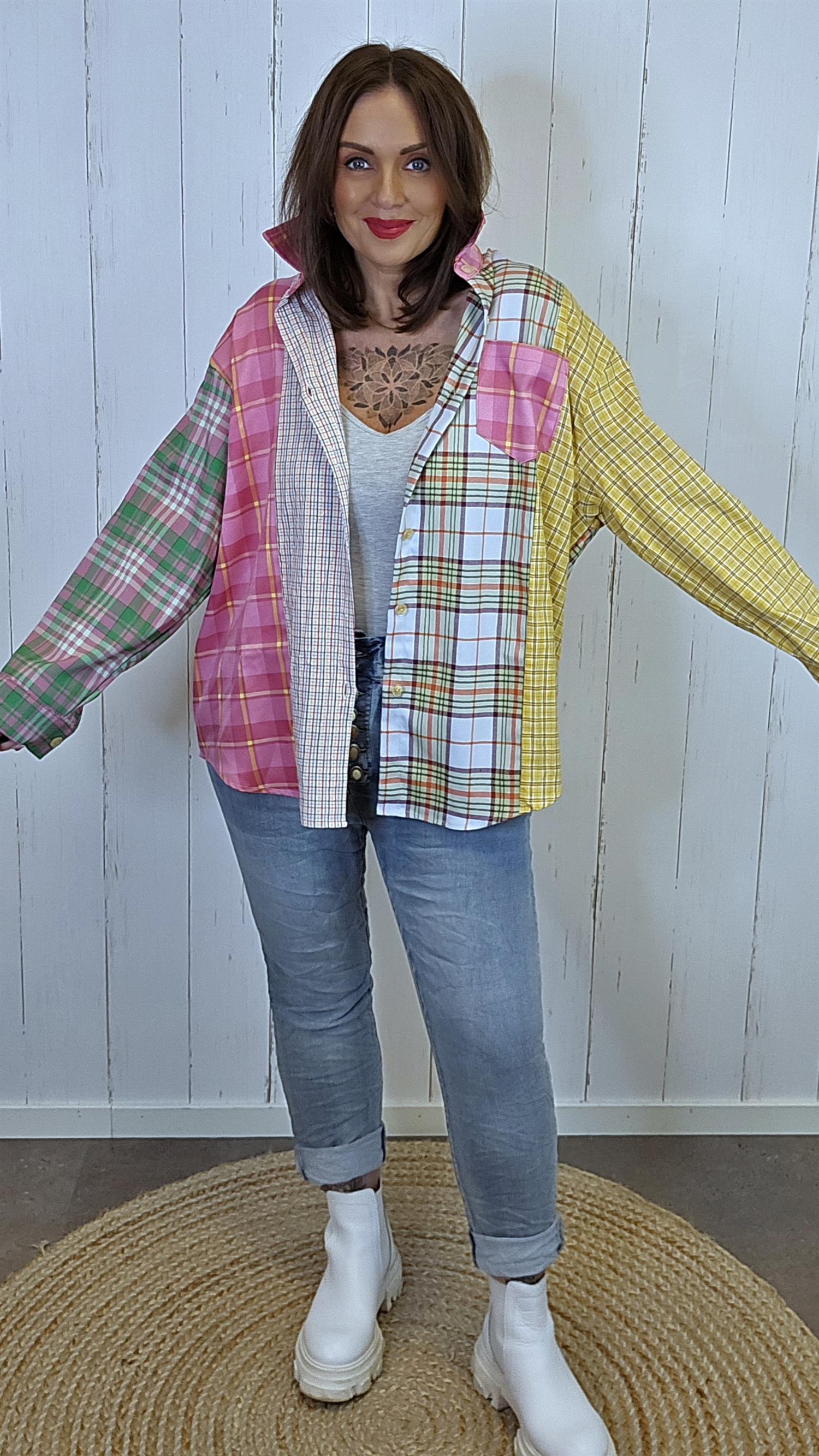 Kul, rutete baggy oversized skjorte med små ruter og mange friske farger som gir et levende og moderne uttrykk. Modellen har lange ermer med knapp i mansjetten og en avslappet passform som faller ledig på kroppen. Skjorten er kortere foran og lengre bak, noe som gir en fin silhuett og gjør den enkel å style både lukket og åpen.