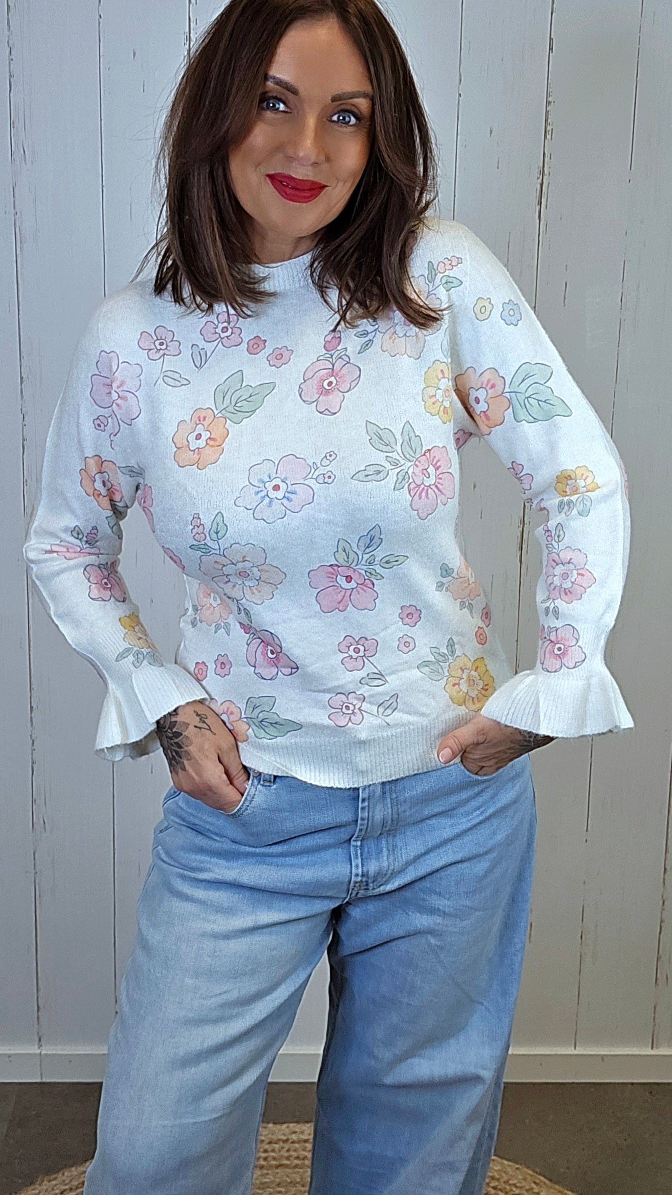 En enkel og smal strikkegenser med rund hals og et delikat uttrykk. Genseren har duse, fine blomster som gir et feminint preg. Ermene er lange og avsluttes med en lekker volang nederst, som gir en myk og elegant detalj. En nett modell som sitter pent til og er behagelig å bruke.