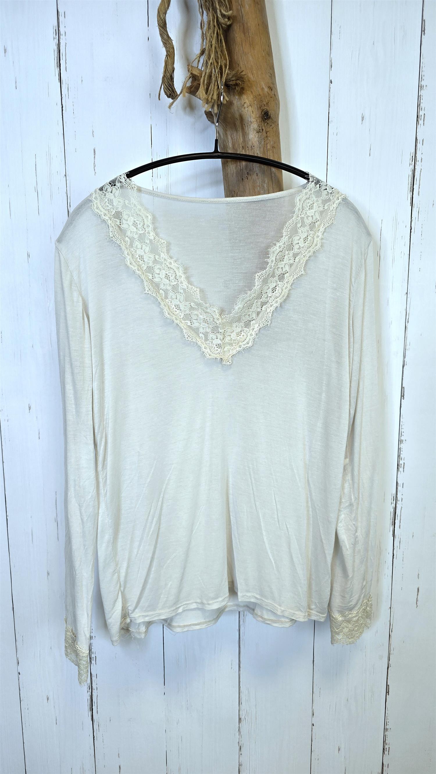Myk og feminin blondetopp i en lett og behagelig kvalitet. Toppen har en delikat V-hals med vakker blondekant som gir et elegant uttrykk, samt lange ermer med blondedetaljer nederst. Stoffet faller pent og føles ekstra mykt mot huden, noe som gjør den komfortabel å bruke både til hverdag og mer pyntede anledninger.