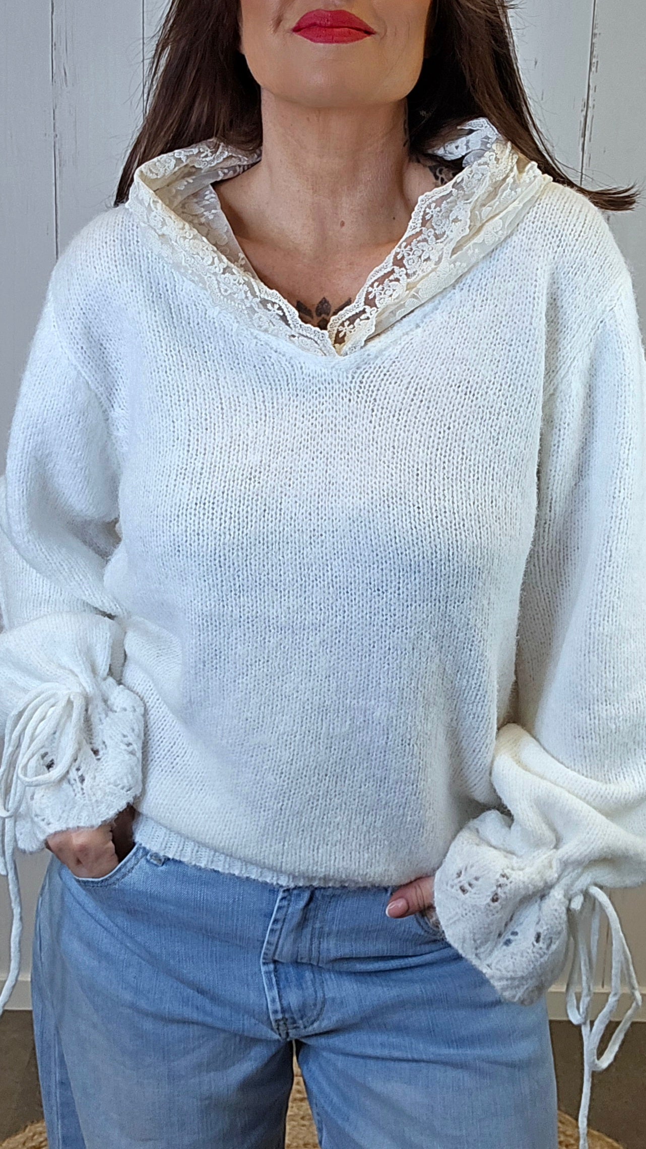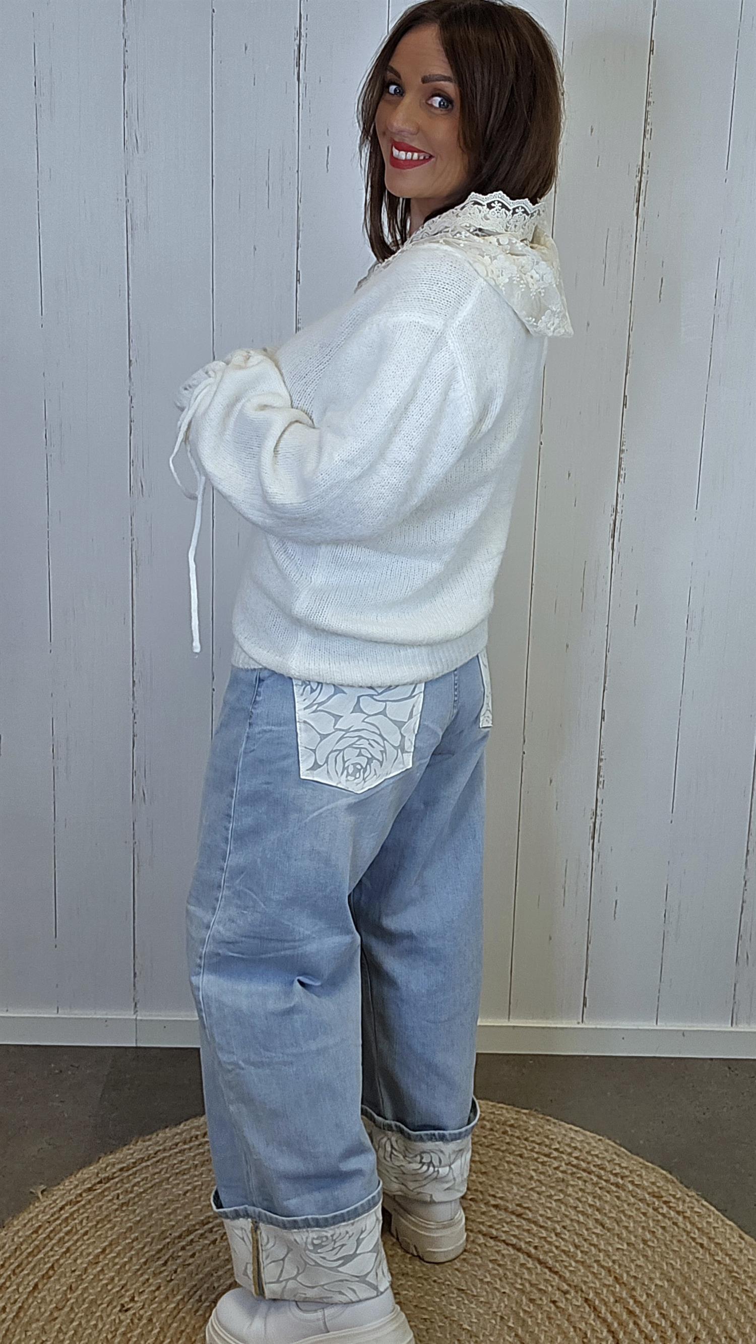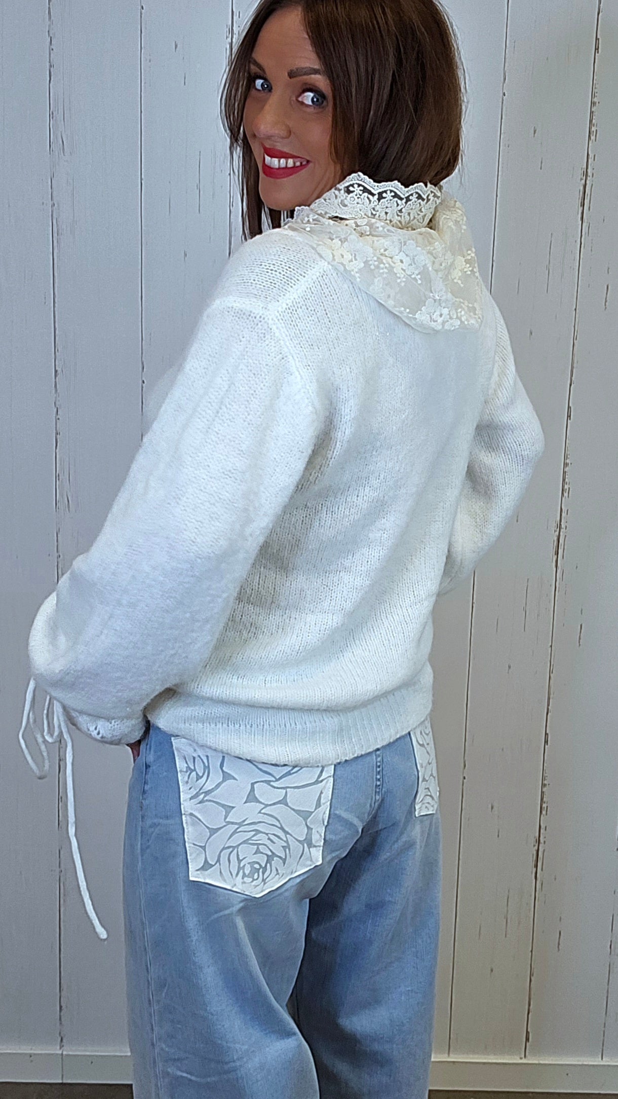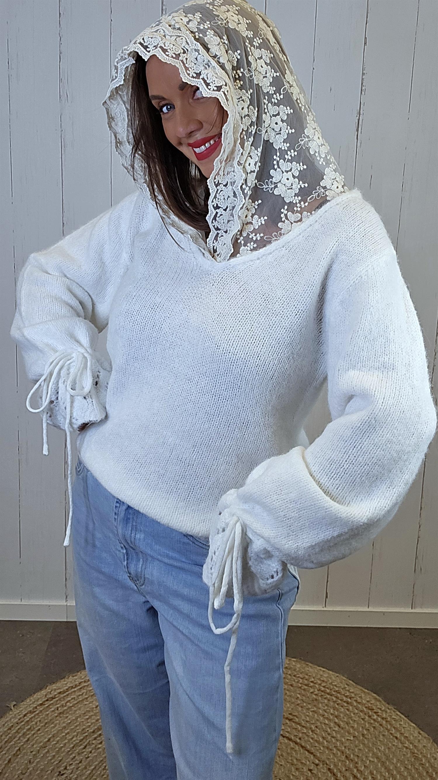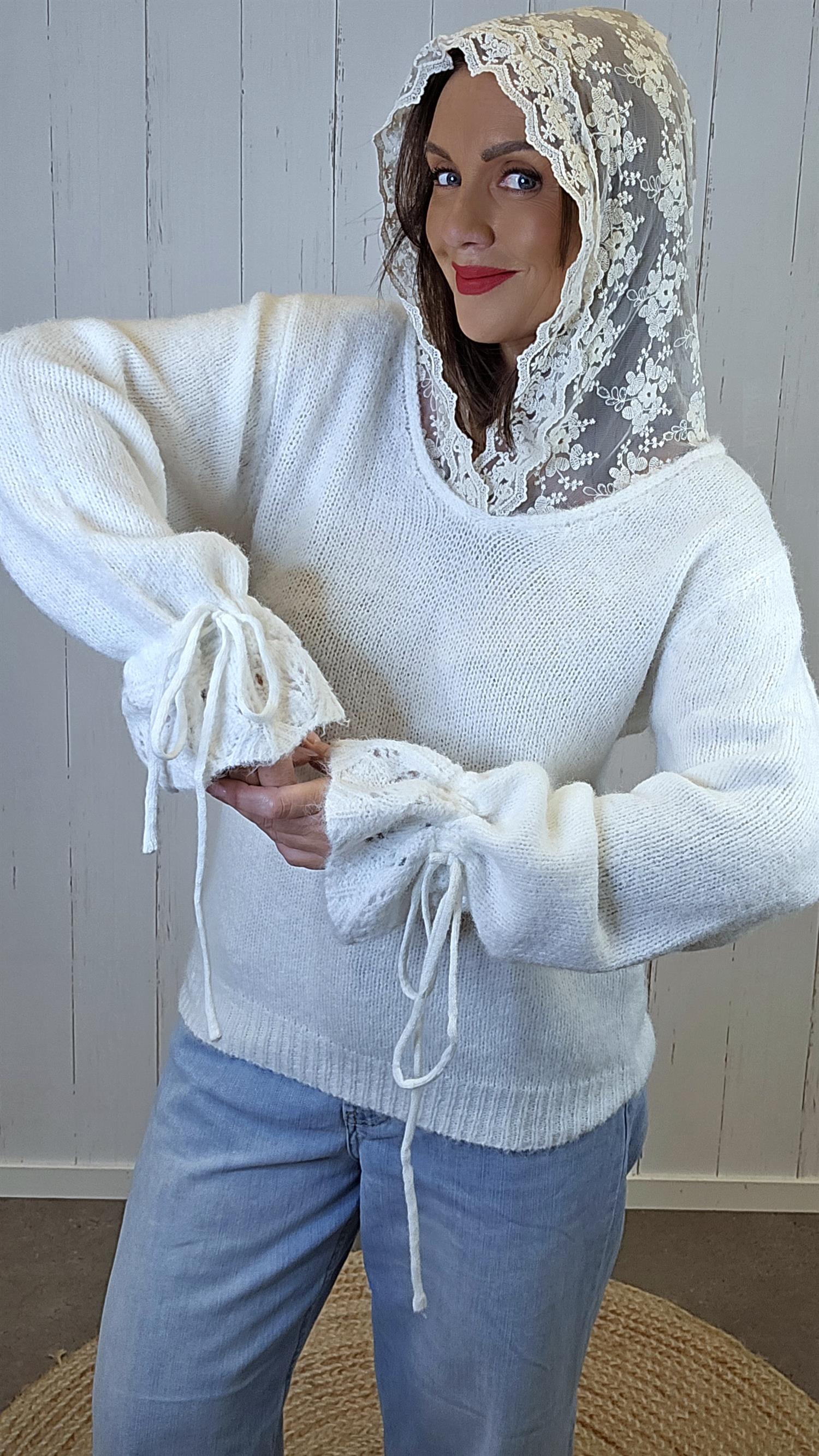 En myk og behagelig genser med et eksklusivt uttrykk, løftet av en påsydd hette i blonder som gir plagget et feminint og unikt preg. Genseren har lange ermer med god lengde, og nederst på ermene er det et dekorativt strikkemønster kombinert med snøring som gir fine detaljer og karakter. Passformen er komfortabel og lett, samtidig som materialet oppleves varmt og mykt mot huden.