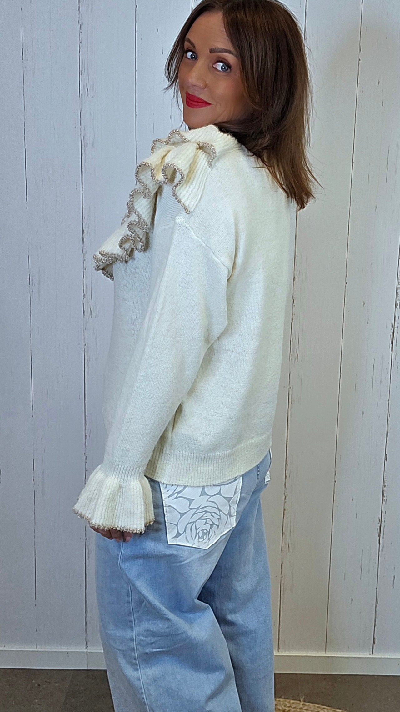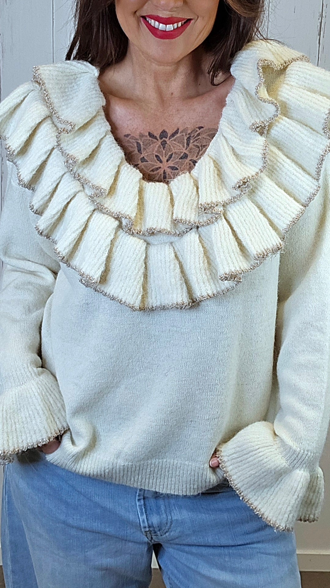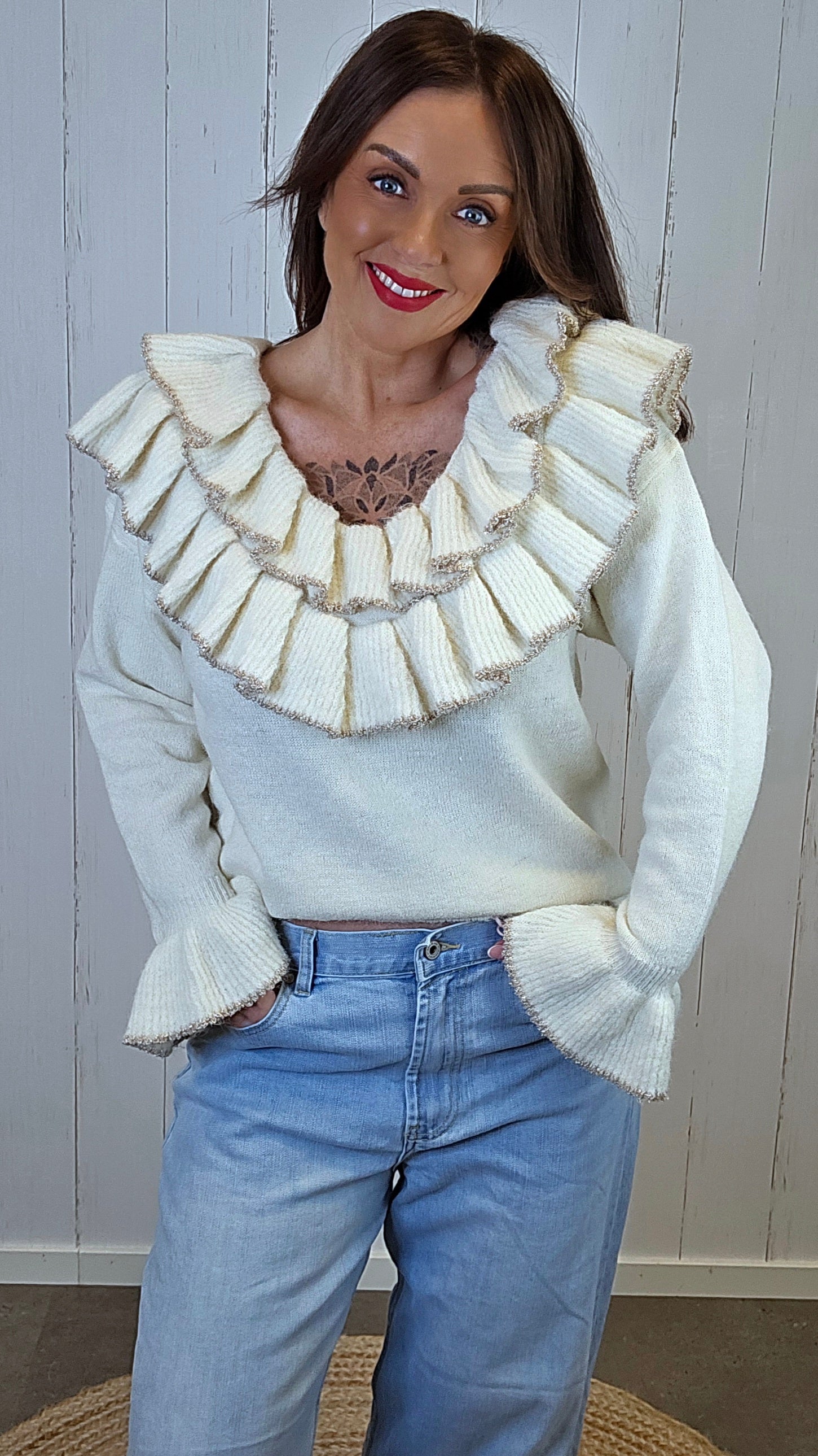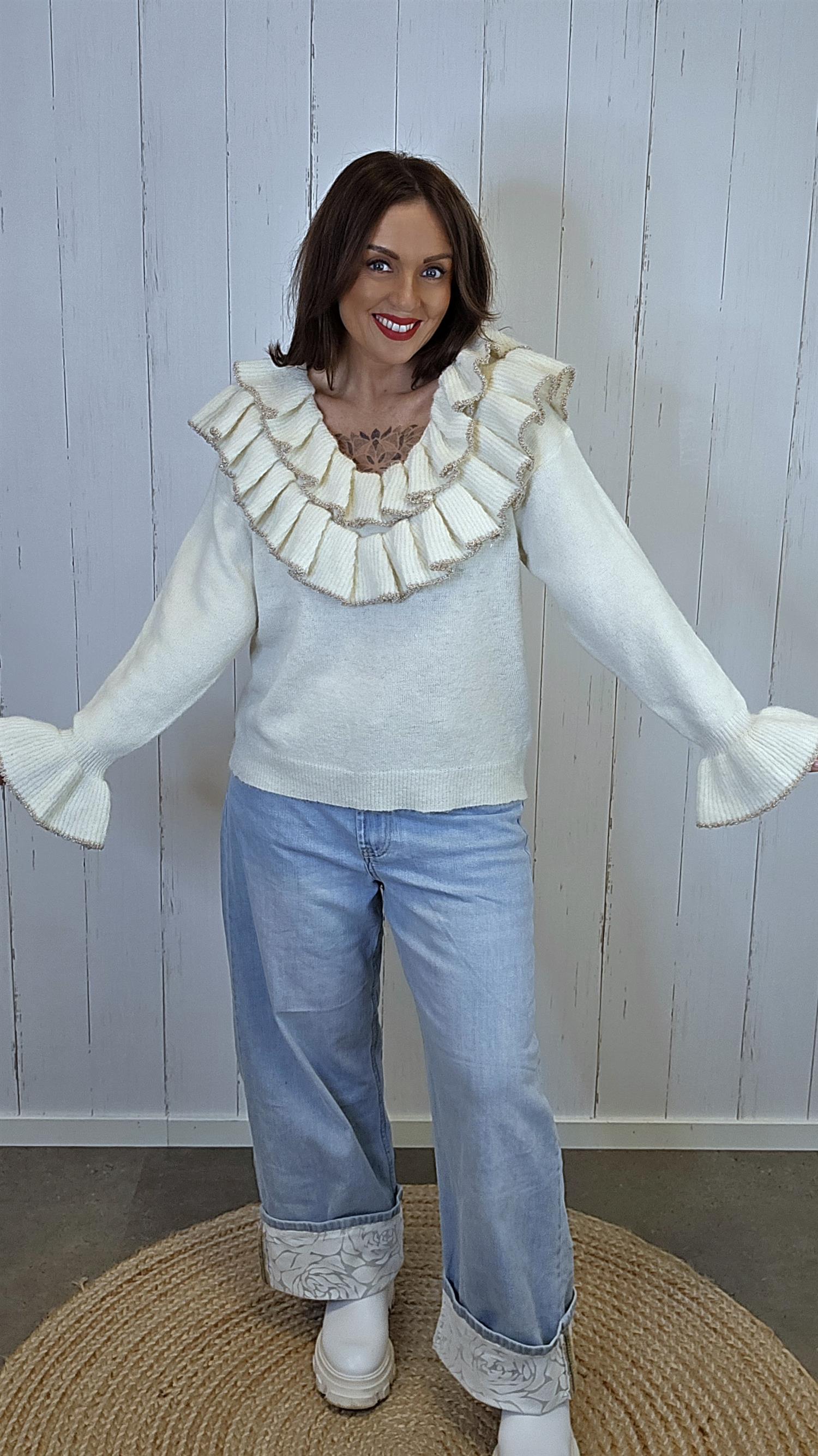 Rålekker strikkegenser med ekstra store volangdetaljer rundt halsen. Den har en dyp rund hals som gir et feminint og eksklusivt uttrykk. Volangkanten er dekorert med et subtilt innslag av gullglitter som gir det lille ekstra. Genseren har lange ermer med bred, markant volang nederst, som skaper en elegant og iøynefallende silhuett. Myk og behagelig kvalitet med lett struktur i strikken.