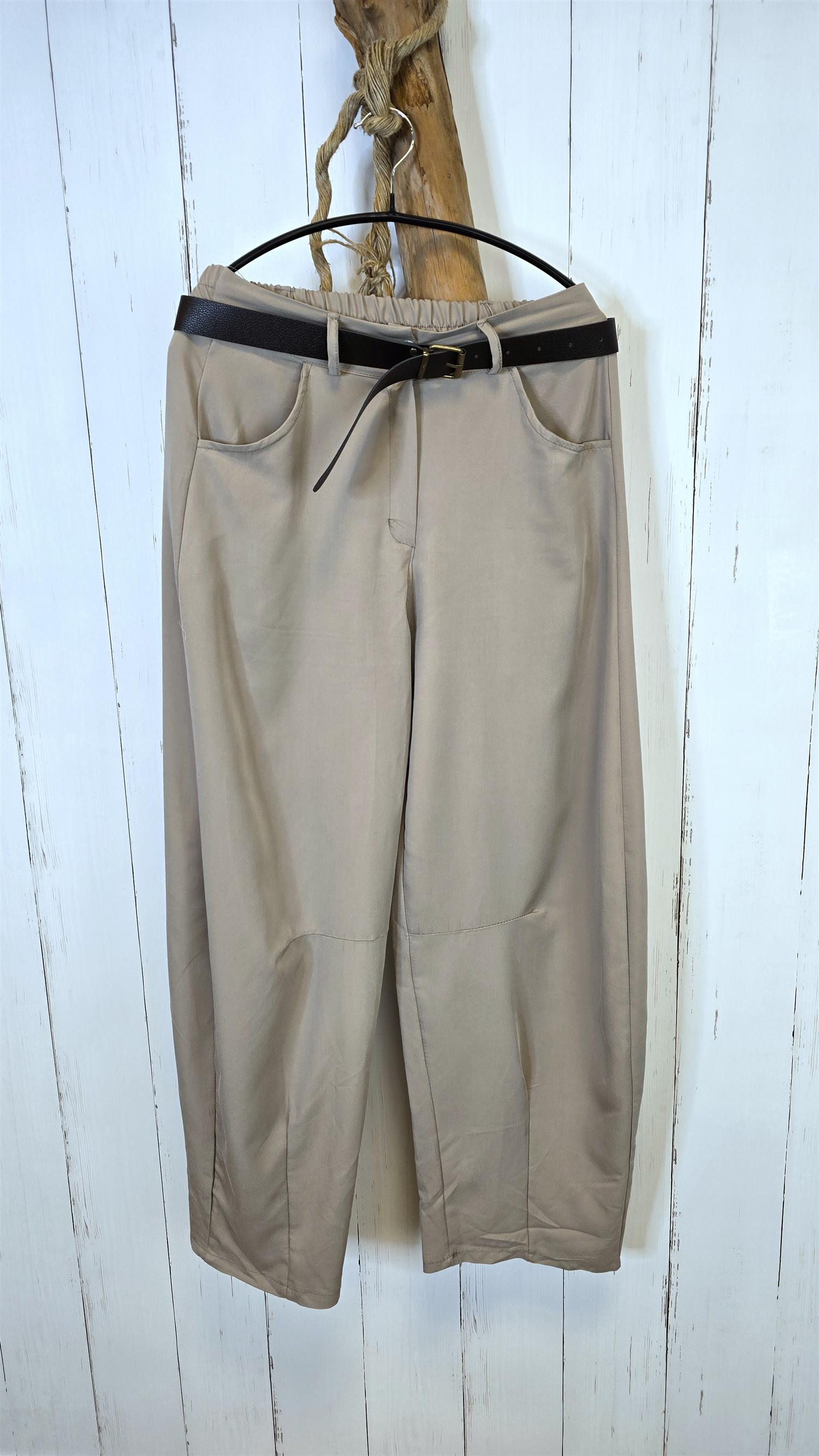 Lekker og anvendelig bukse med komfortabel passform og fine detaljer. Buksen har strikk bak i linningen som gir god bevegelighet og en flatterende passform, kombinert med glidelås og knapp i front for et rent uttrykk. Den kommer med et brunt belte som følger med. Fasongen er lett barrel-ben, noe som betyr at den er litt romsligere over lårene og smalner pent ned mot ankelen.