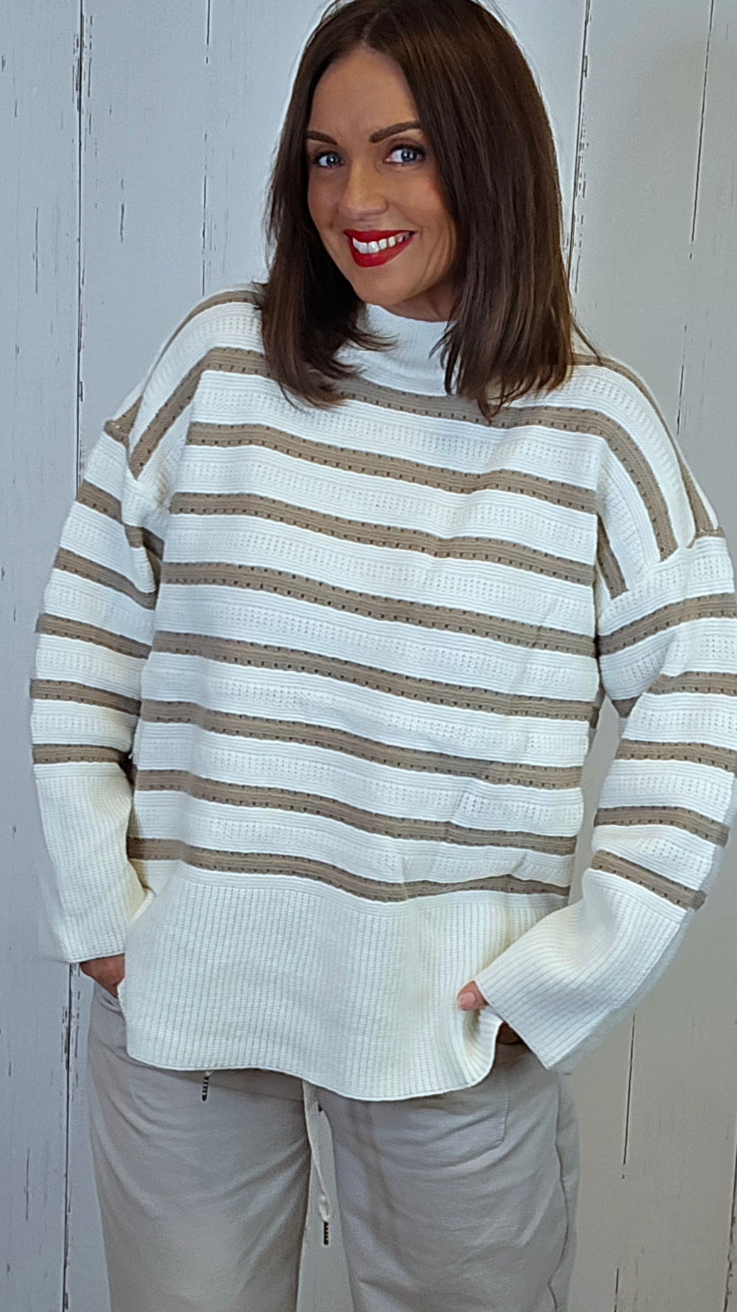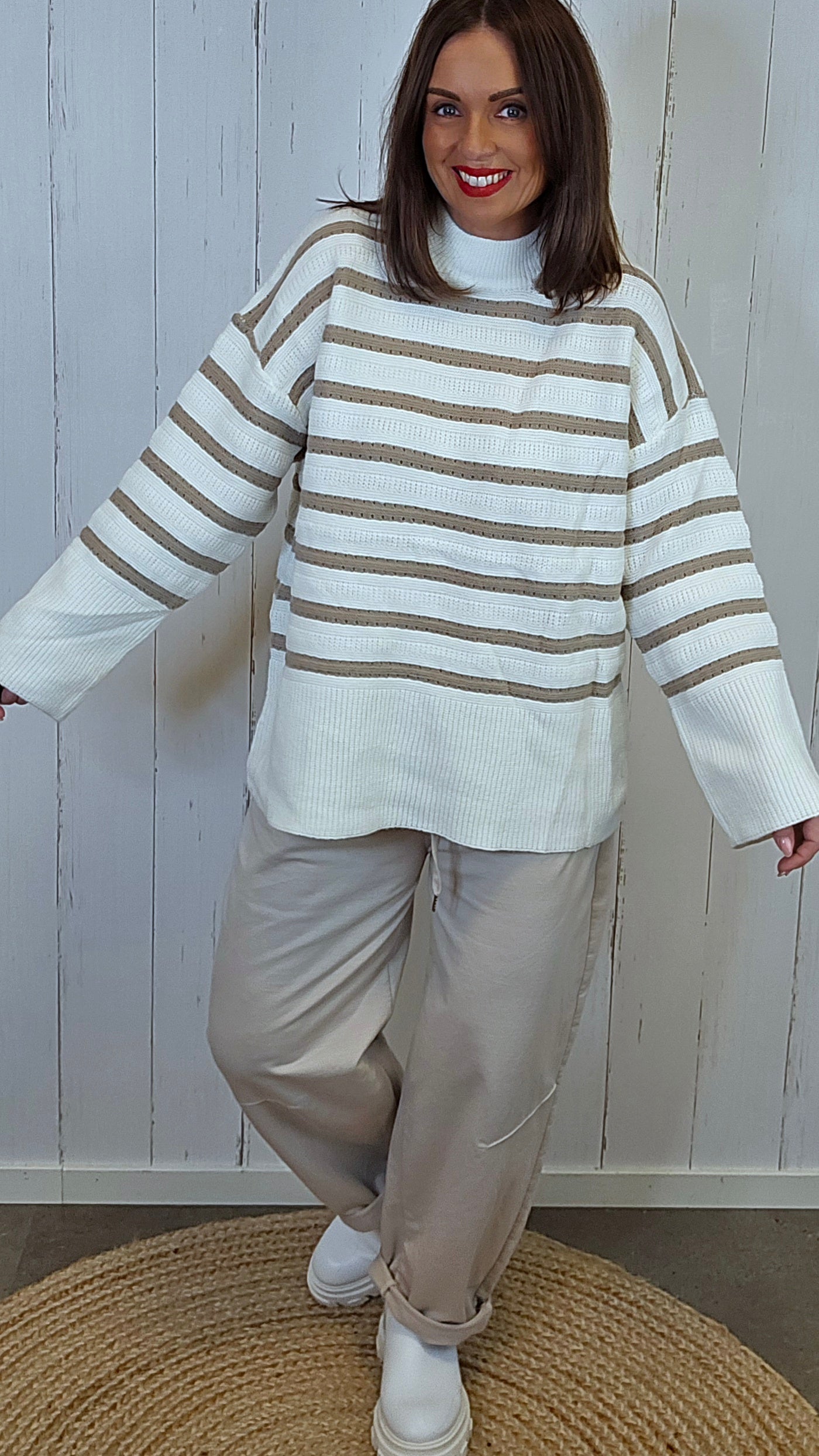 En lun og behagelig genser med halvhøy, ribbestrikket hals som gir et mykt og avslappet uttrykk. Genseren har fine striper i en dus taupe farge mot en kremfarget bunn, noe som gir et lyst og delikat helhetsinntrykk. Ermene er lange og vide, med ribbet avslutning nederst, som gir en fin balanse mellom komfort og form. Også nederst på selve genseren er det ribbestrikket kant som gjør at den faller pent på kroppen.