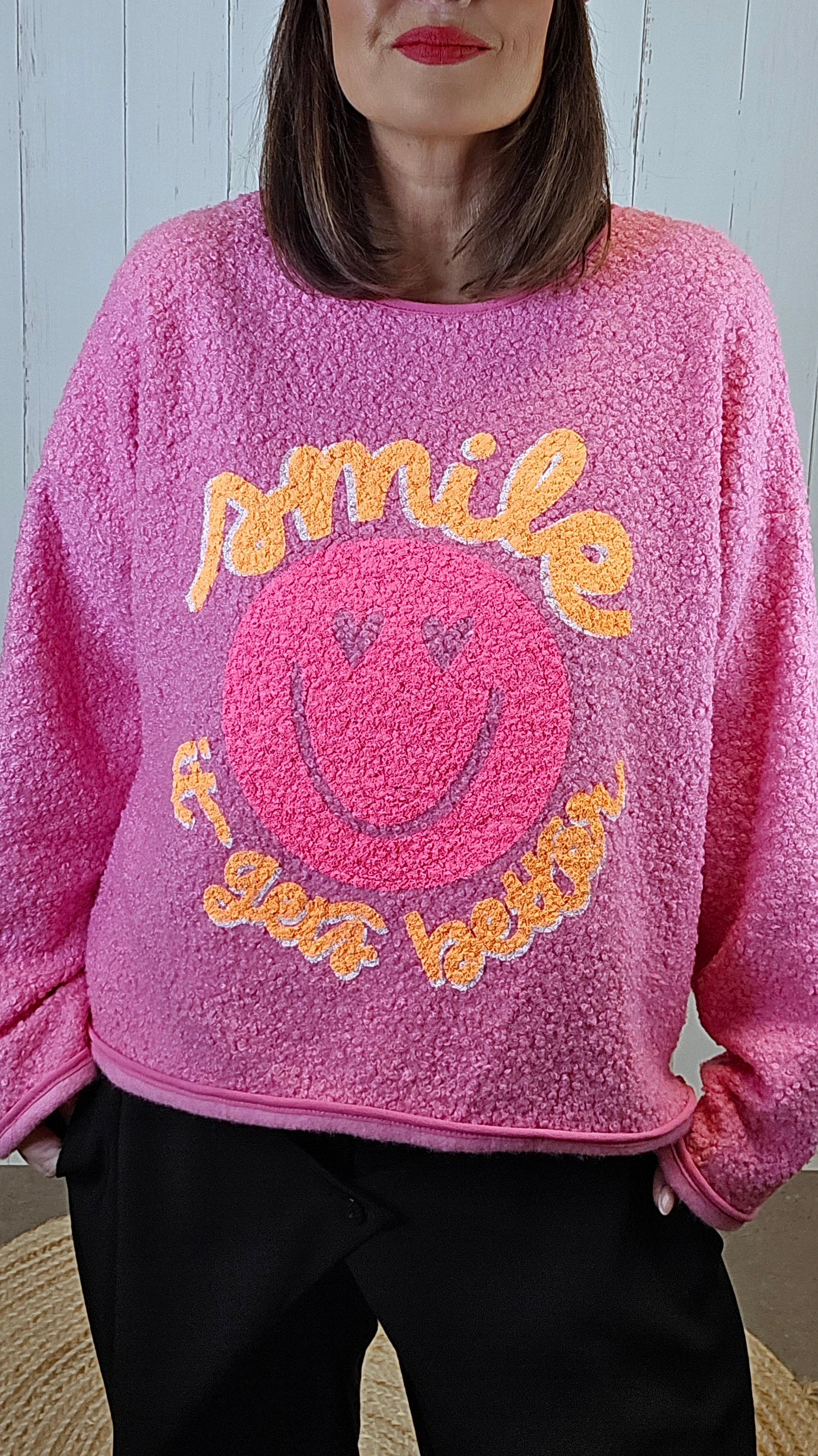 En myk og deilig teddygenser i knallrosa farge som gir et lekent og positivt uttrykk. Genseren har rund hals og lange ermer, og er ekstra behagelig å ha på. I front har den et fargetrykk med teksten “Smile, It Gets Better” og et smile-symbol i midten som gir plagget en glad og inspirerende vibe. Modellen er litt lengre bak enn foran, noe som gir et fint fall og ekstra komfort.