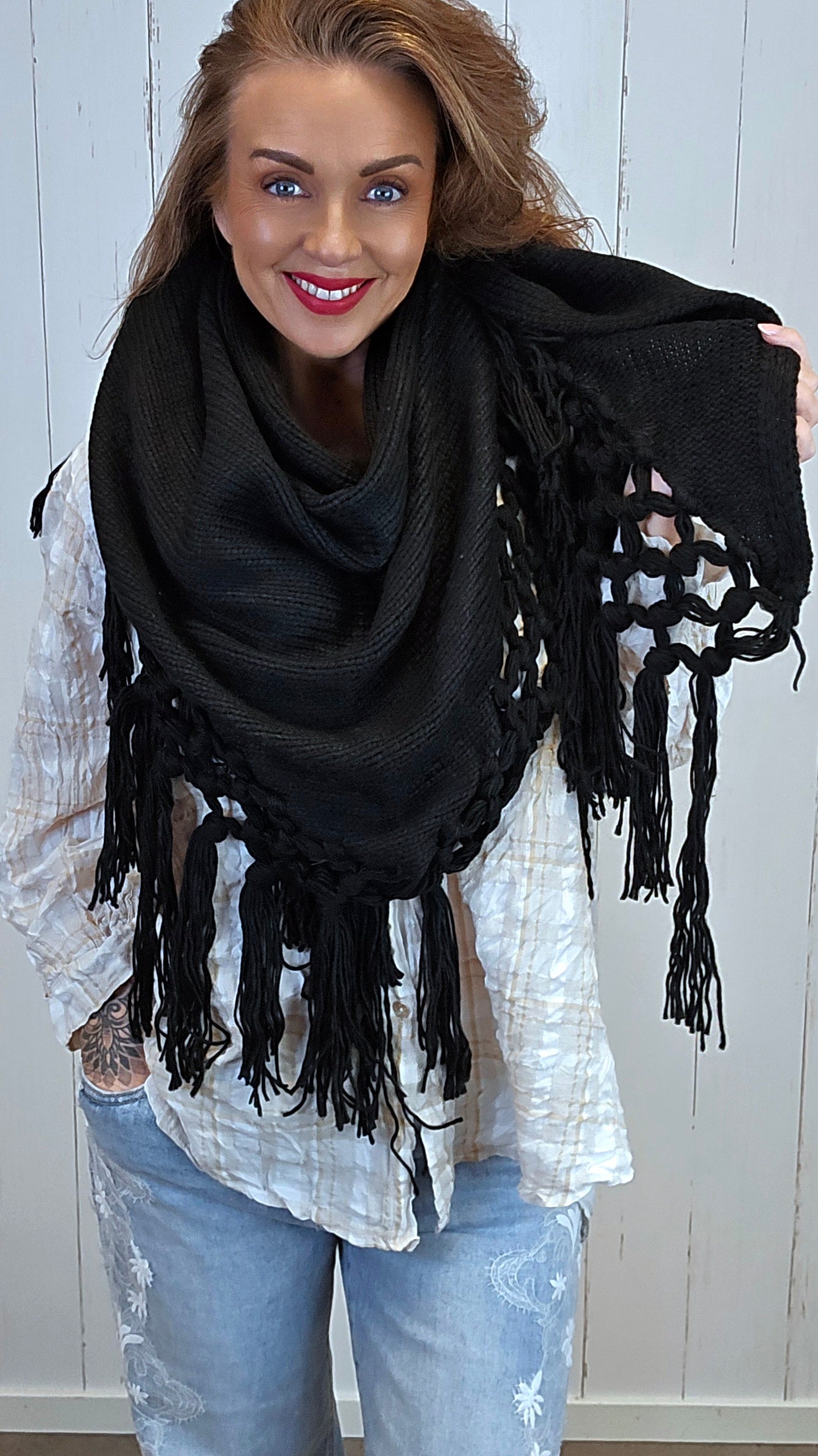 Et mykt og lett trekantskjerf med dekorative, knyttede detaljer og lange frynser langs kanten. Den brede trekantformen gjør det enkelt å style rundt skuldrene, som sjal, eller rundt halsen for et koselig og avslappet uttrykk. Perfekt som et ekstra lag på kjølige dager.