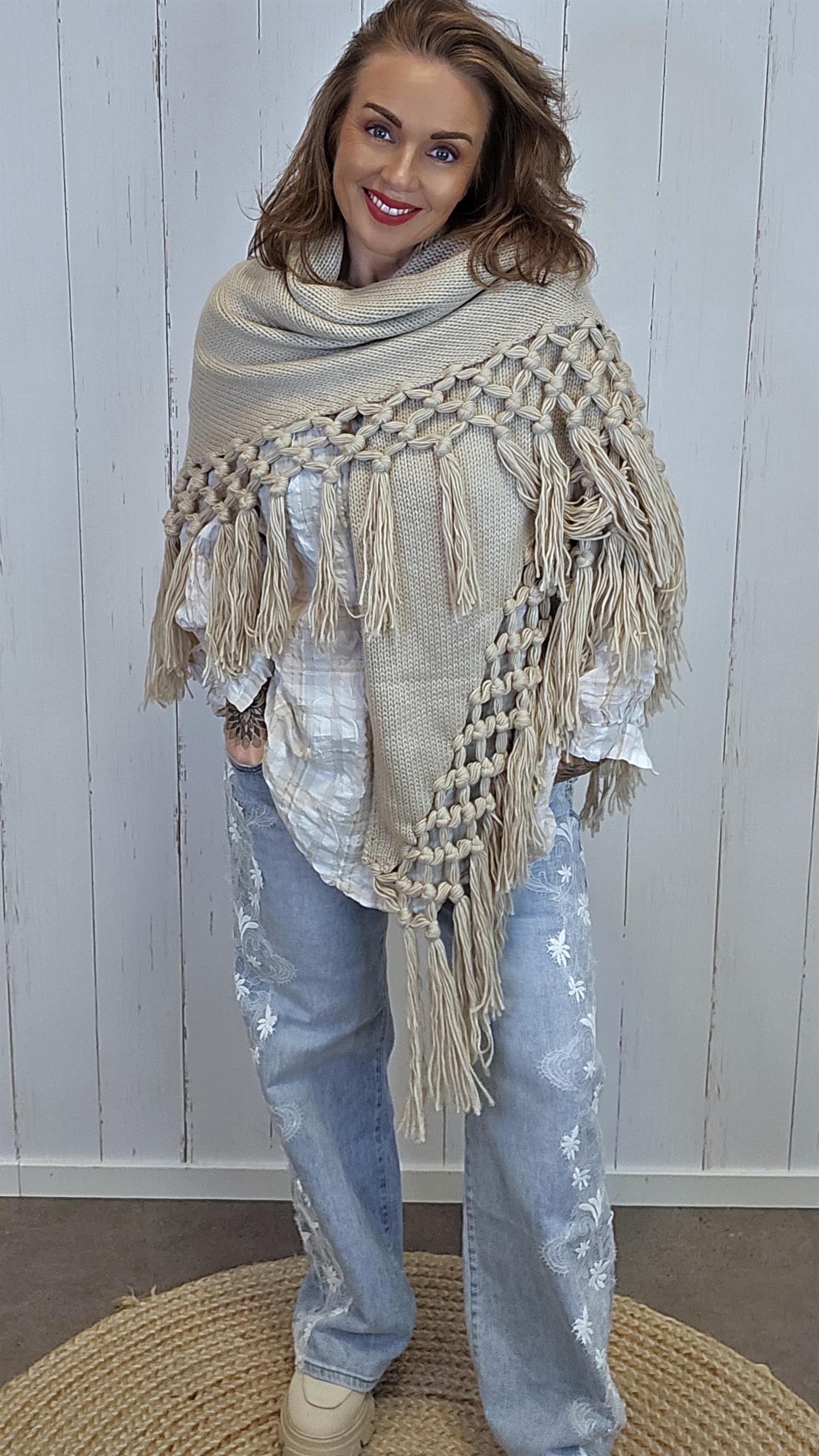 Et mykt og lett trekantskjerf med dekorative, knyttede detaljer og lange frynser langs kanten. Den brede trekantformen gjør det enkelt å style rundt skuldrene, som sjal, eller rundt halsen for et koselig og avslappet uttrykk. Perfekt som et ekstra lag på kjølige dager.