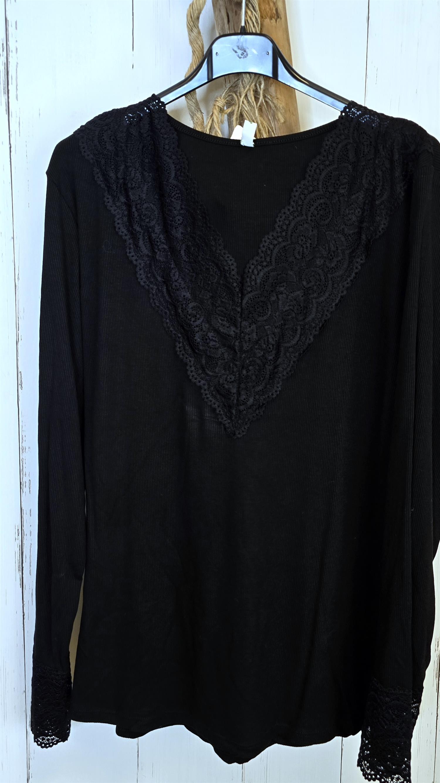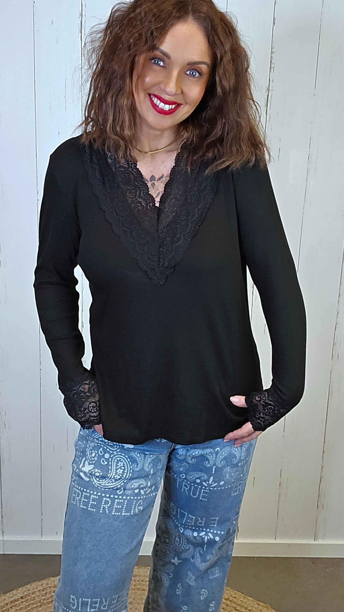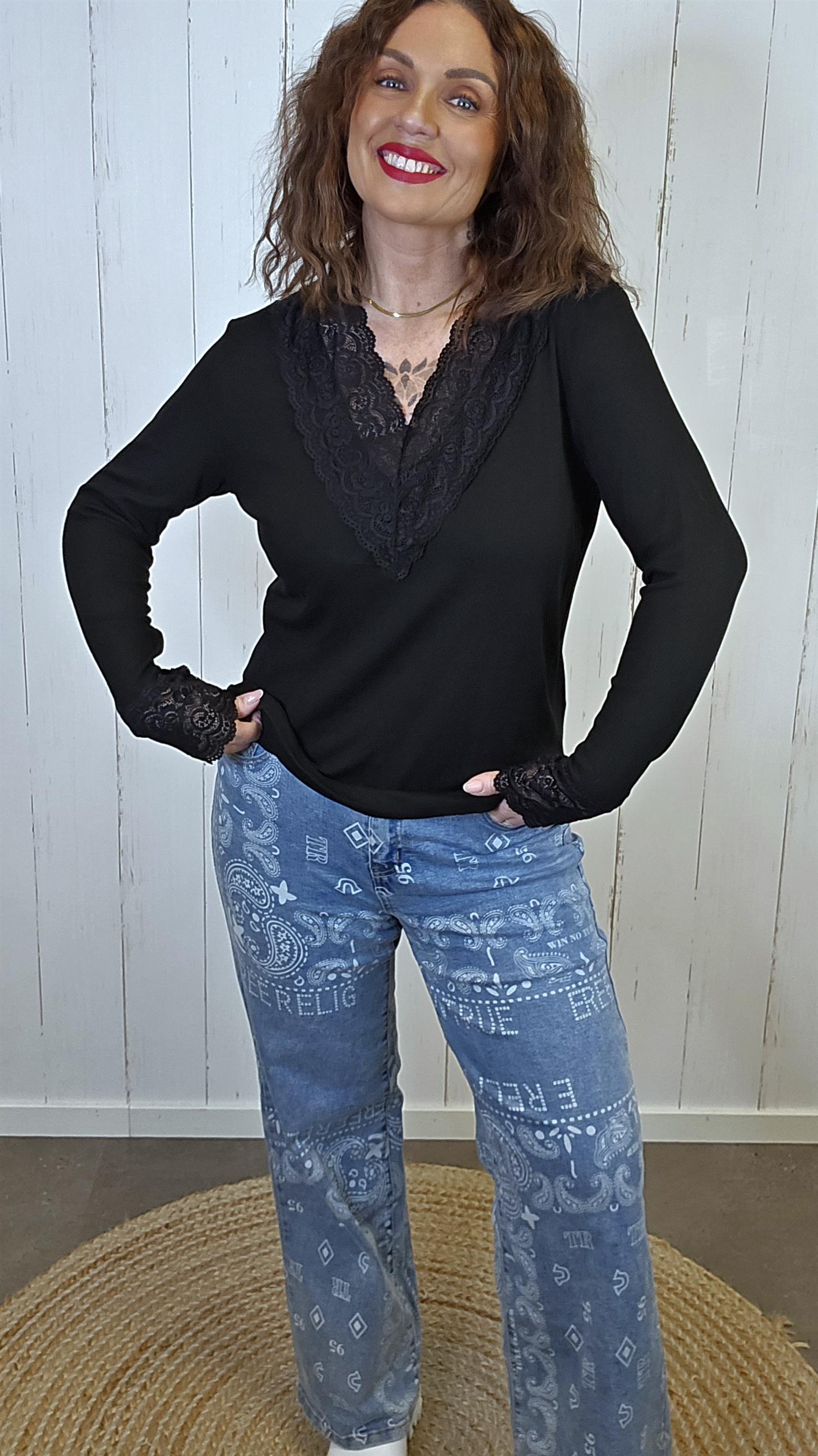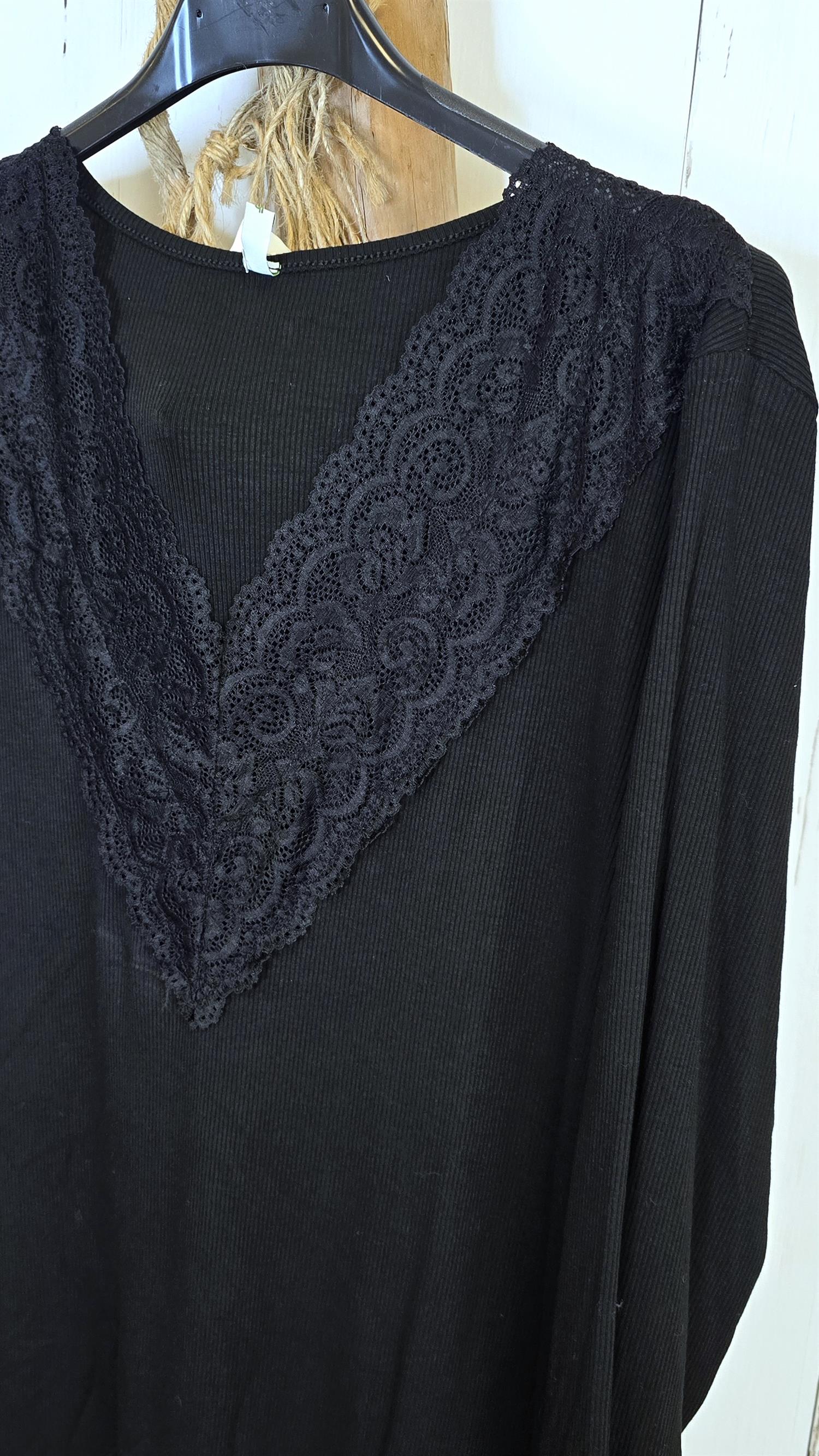 Alva er en feminin og anvendelig topp i myk, ribbestrikket kvalitet med vakre blondepartier. Den har en elegant V-formet blonde på brystet som gir et delikat uttrykk, samt matchende blonder nederst på ermene. Toppen sitter pent inntil uten å føles stram, og er like fin alene som under jakker og strikk.