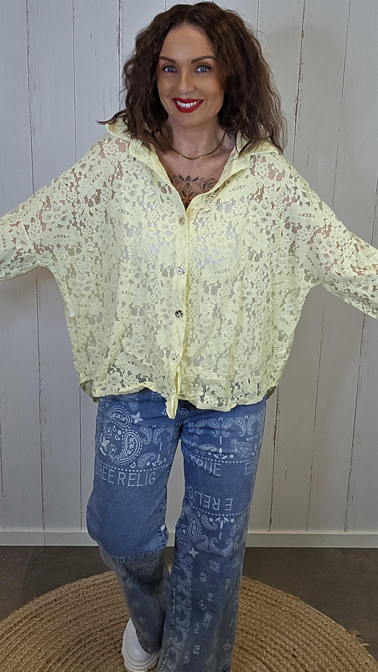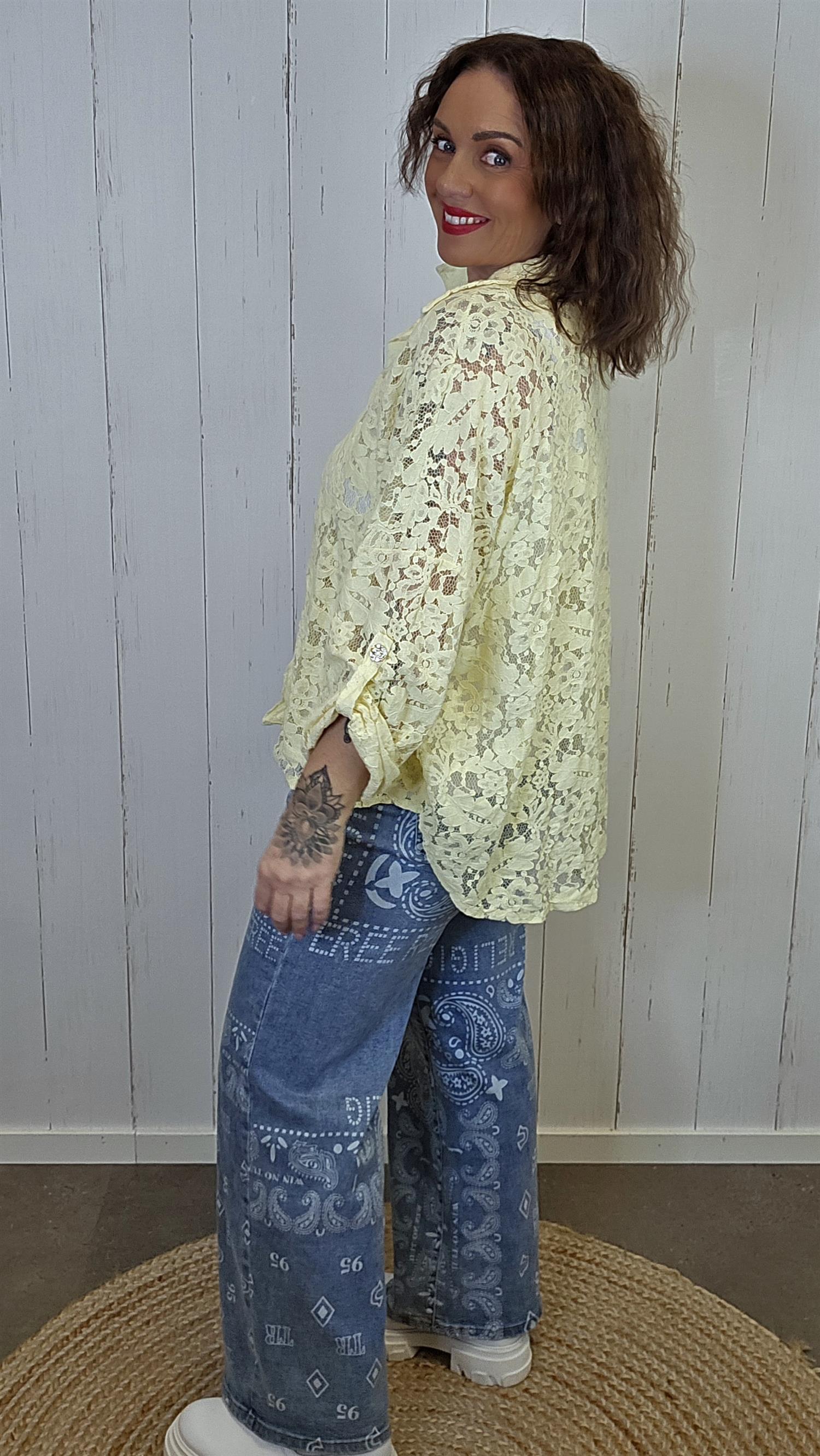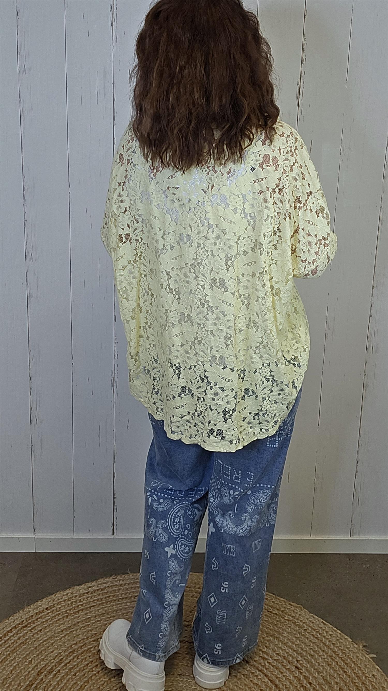 Lett og feminin blondeskjorte i delikat , laget i myk blonde med blomsterstruktur. Modellen har klassisk krage, knappelukking i front og en lett avrundet avslutning nederst. Ermene kan brettes opp og festes med knapp og hempe, noe som gir et mer avslappet uttrykk når ønskelig. Luftig og behagelig på, perfekt både til hverdags og mer pyntede anledninger.