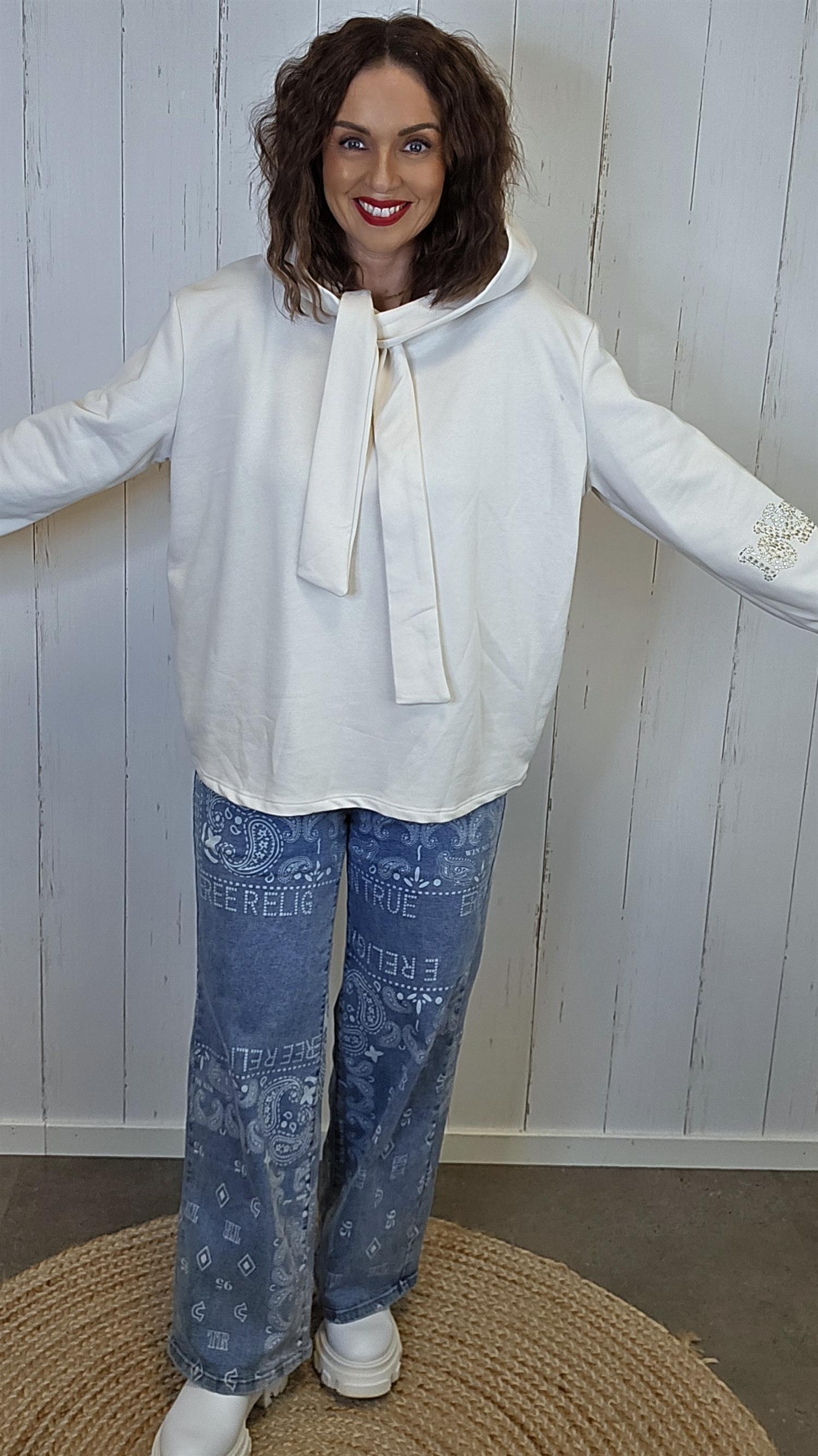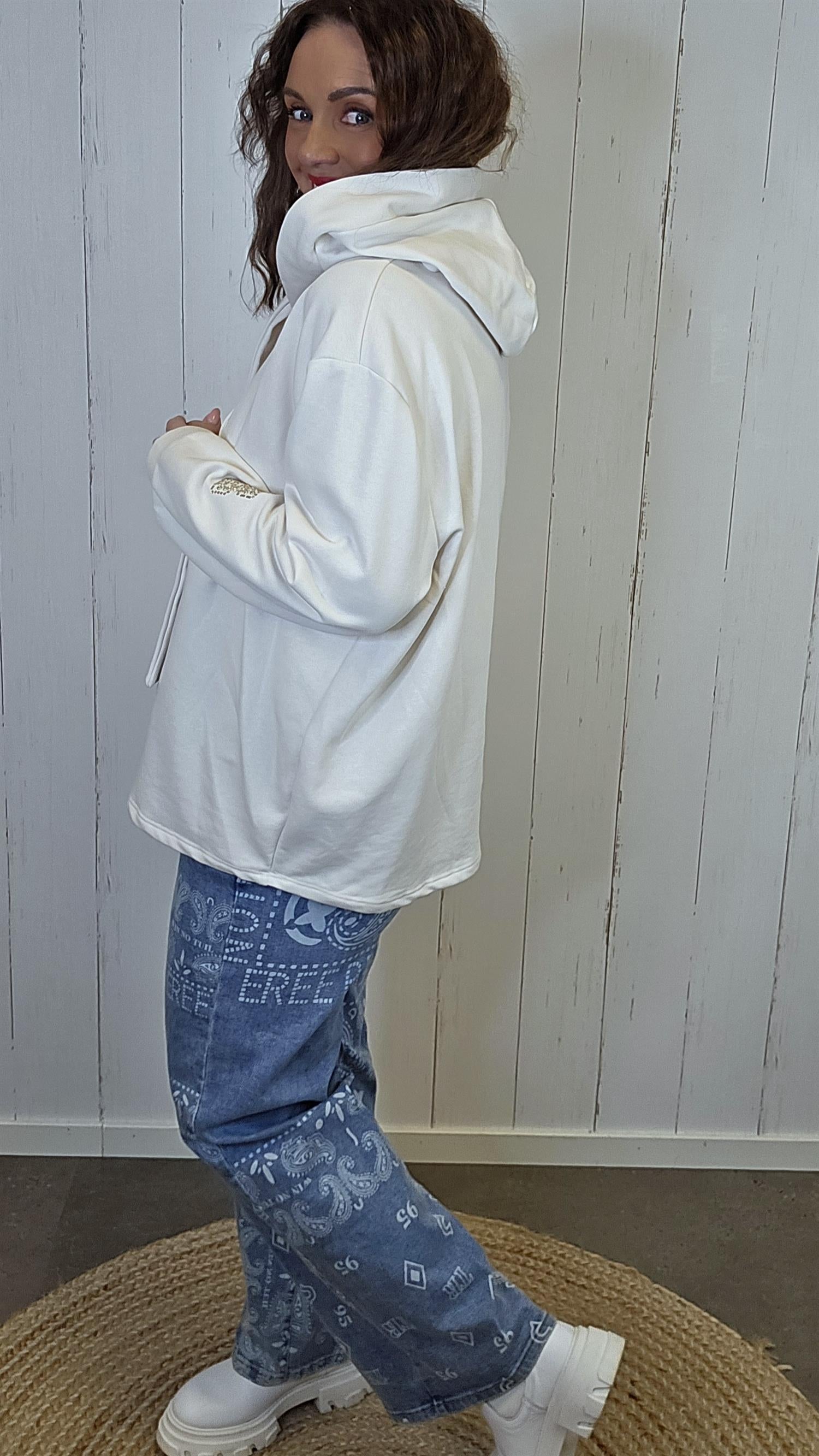 Myk og behagelig hettegenser i bomull med en feminin og gjennomført detalj i front. Modellen har hette og en dekorativ knytemulighet som gir et søtt og litt annerledes uttrykk. På den ene armen er det pyntet med teksten LOVE i en kombinasjon av små diamanter og gullfargede detaljer, som gir plagget det lille ekstra. Avslappet passform som er komfortabel i bruk.