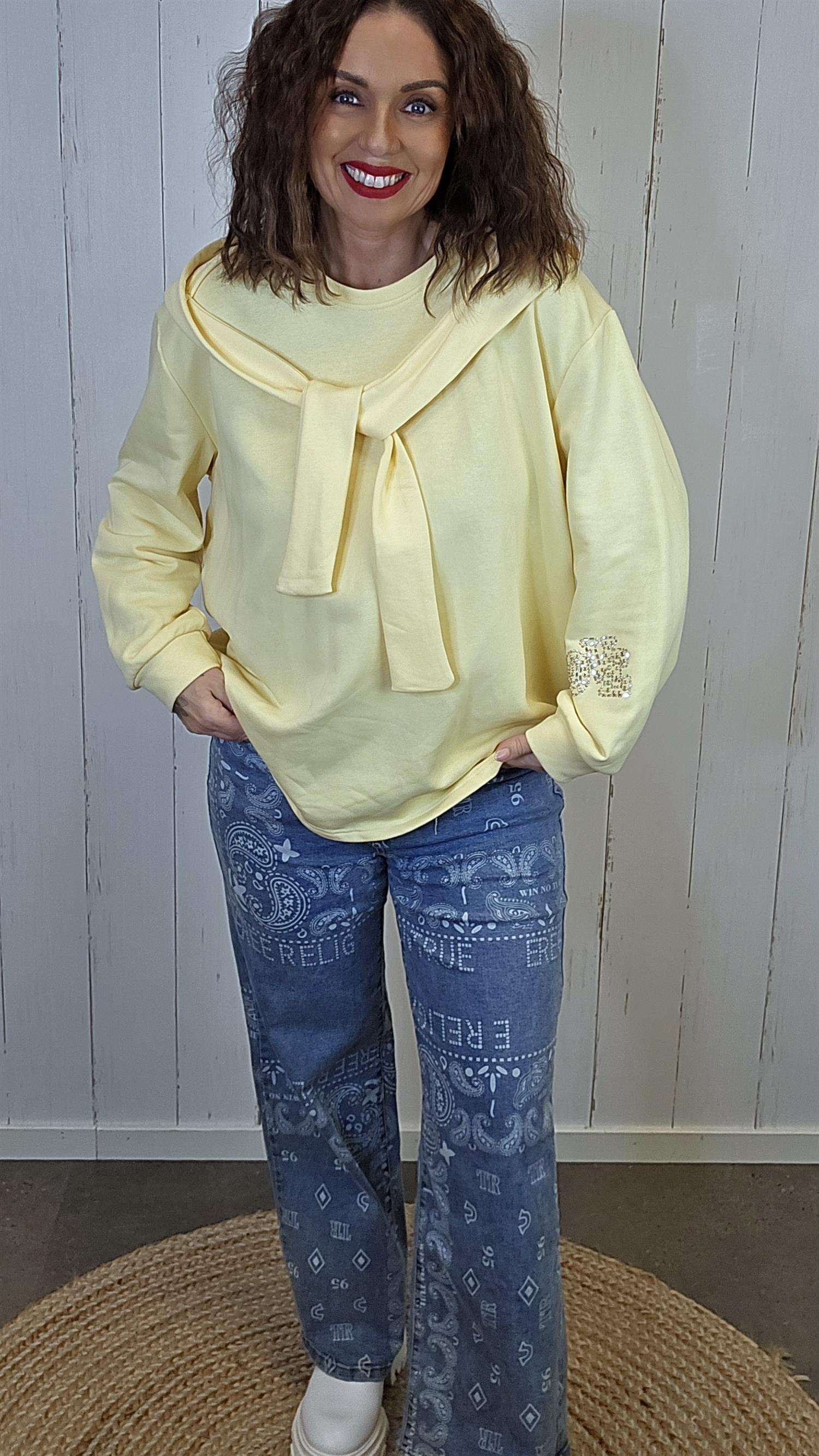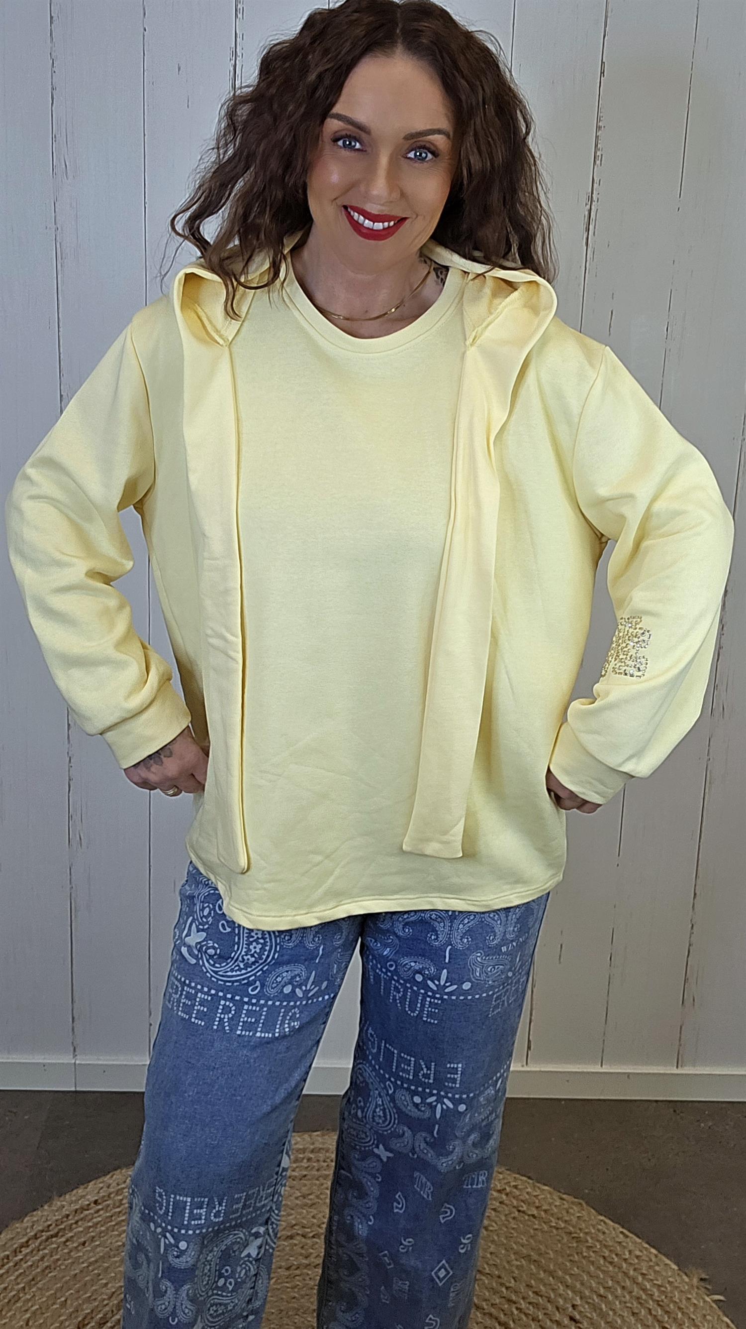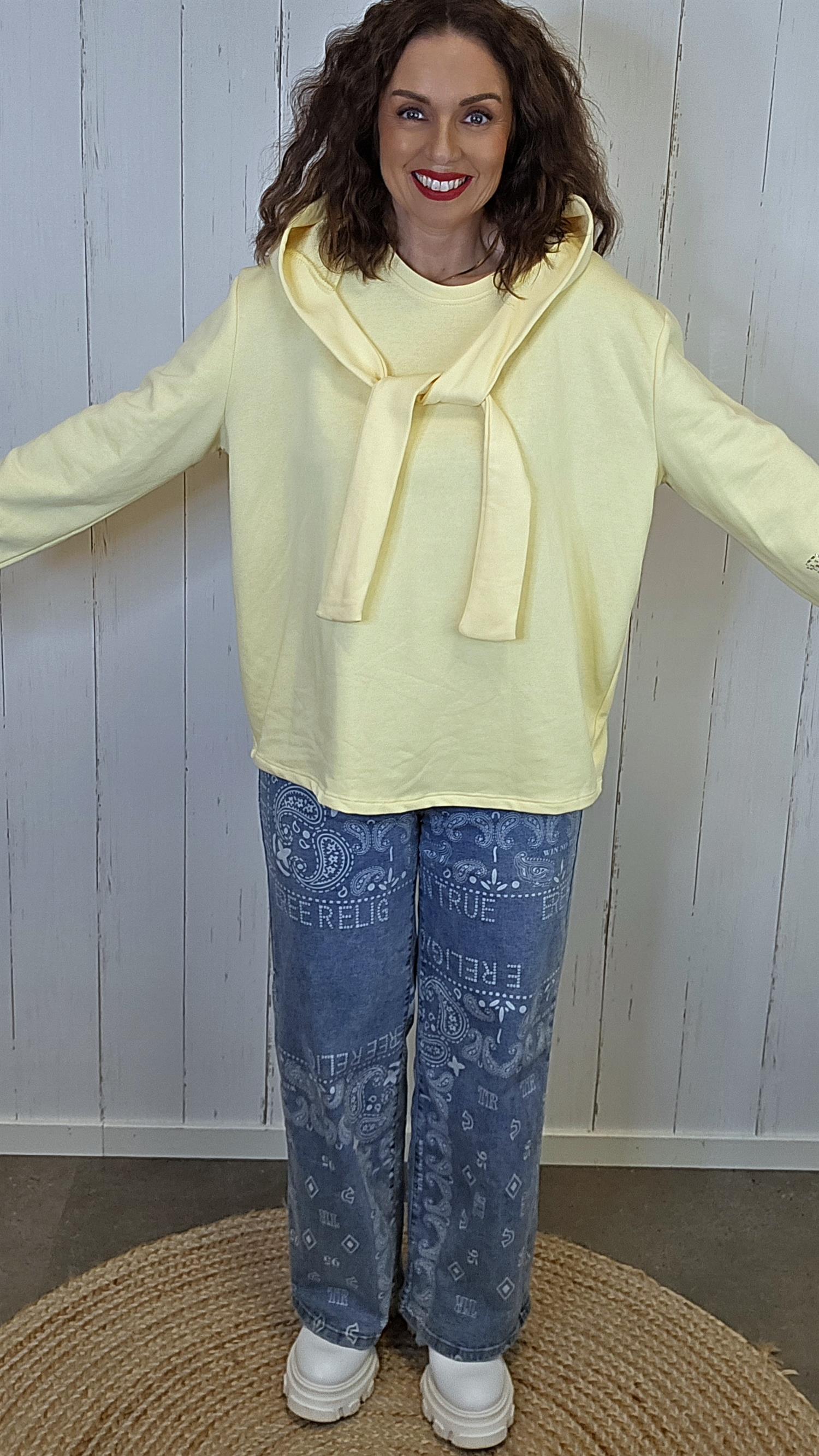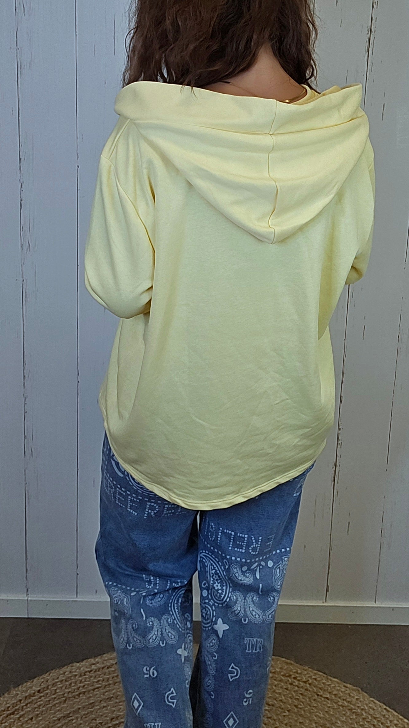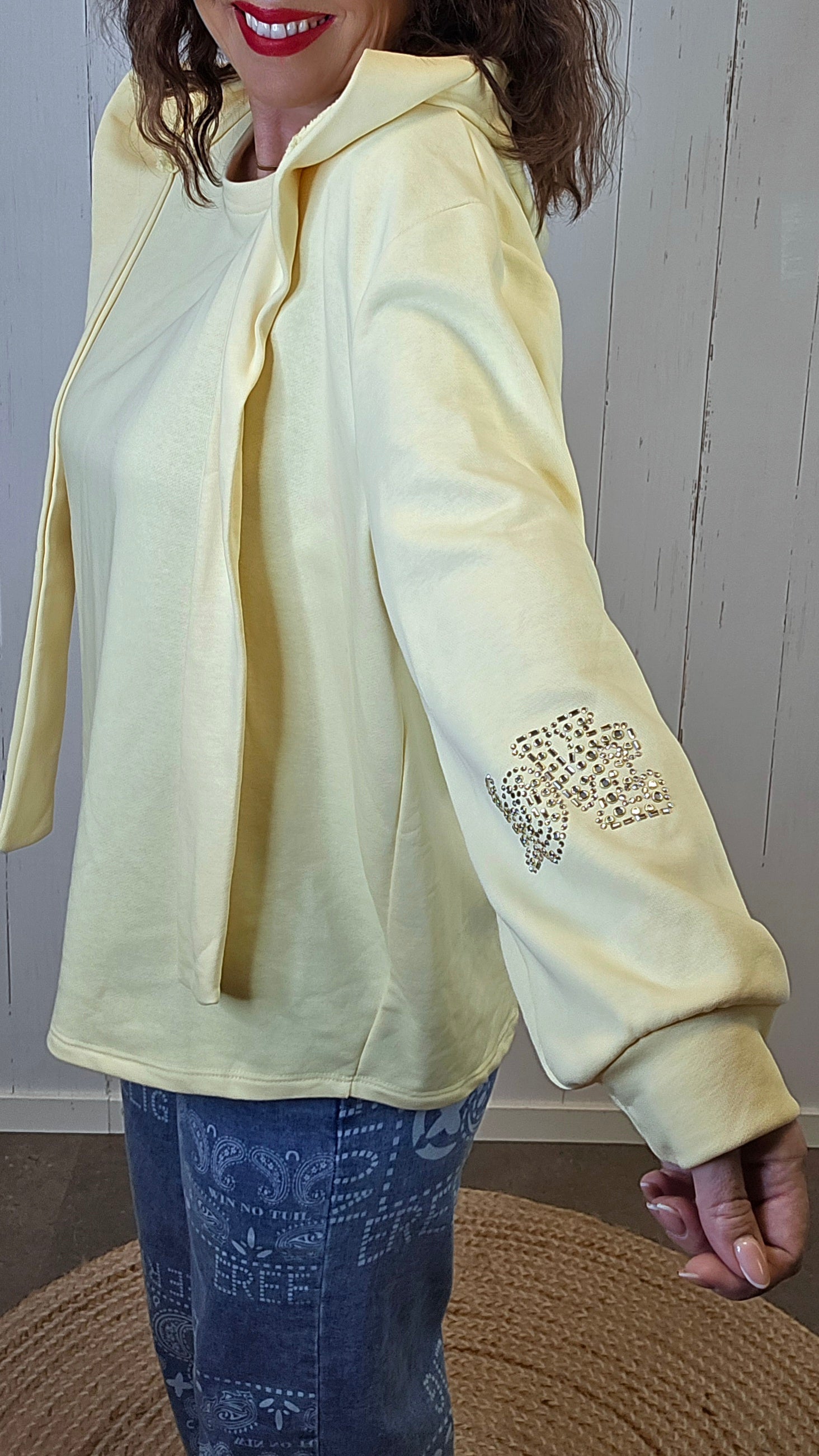 Myk og behagelig hettegenser i bomull med en feminin og gjennomført detalj i front. Modellen har hette og en dekorativ knytemulighet som gir et søtt og litt annerledes uttrykk. På den ene armen er det pyntet med teksten LOVE i en kombinasjon av små diamanter og gullfargede detaljer, som gir plagget det lille ekstra. Avslappet passform som er komfortabel i bruk.