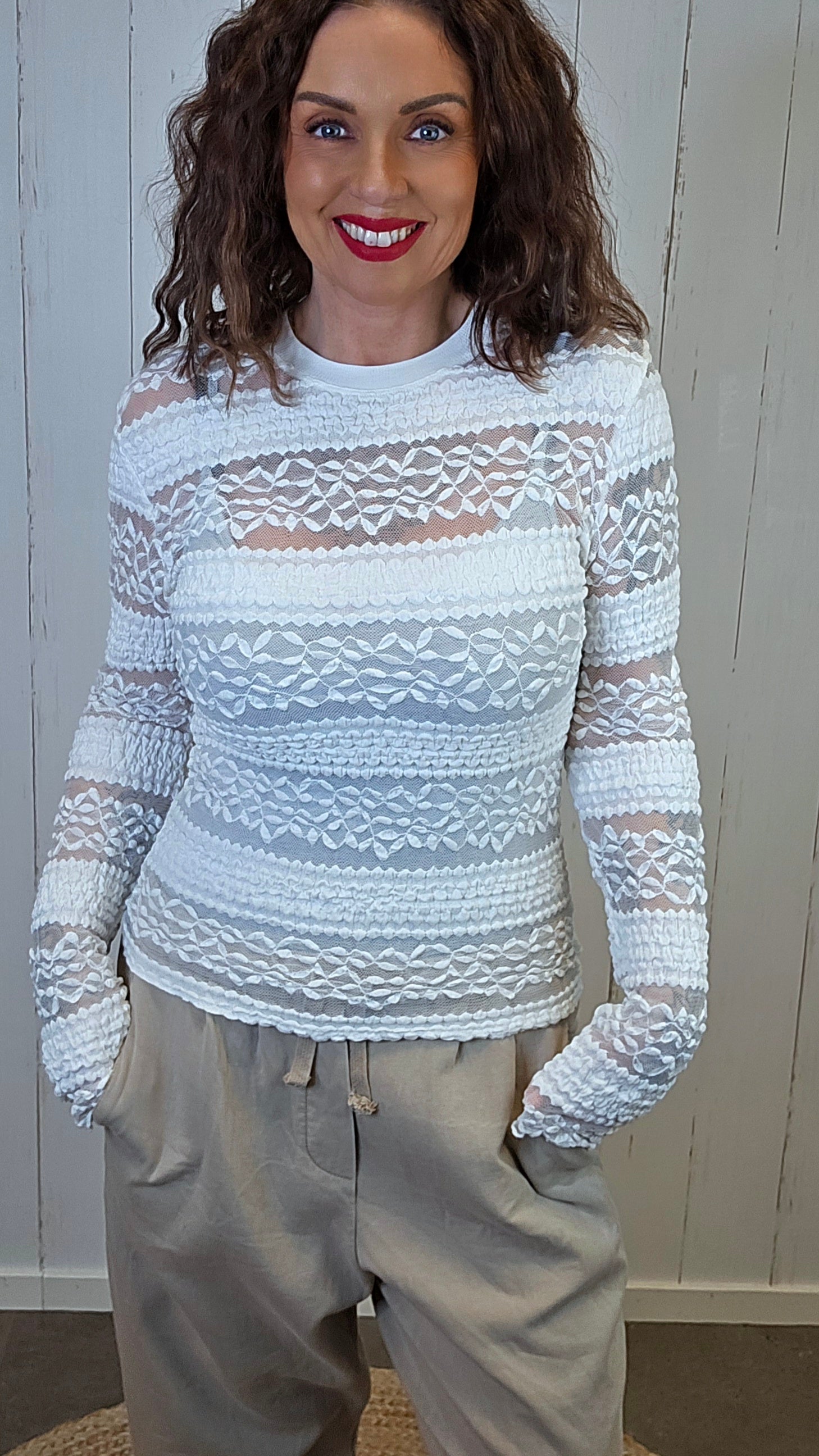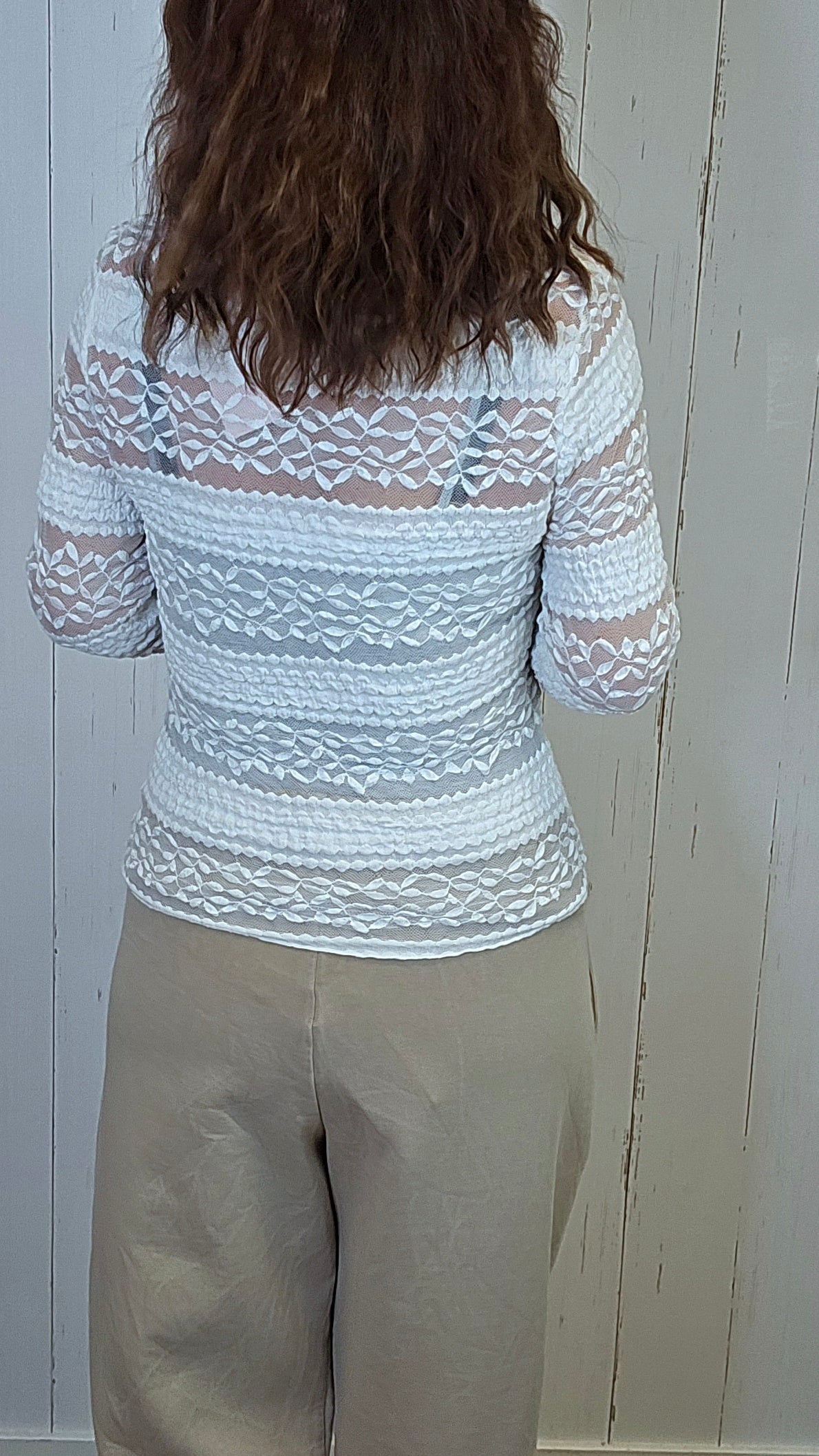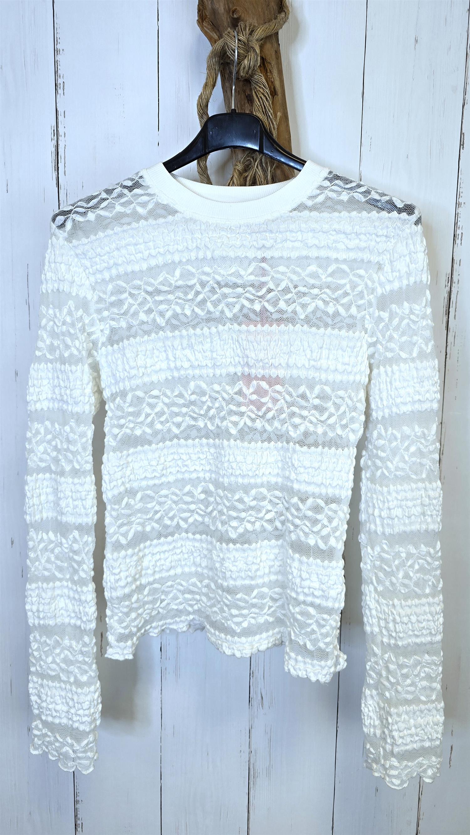 Delikat og feminin topp i transparent blonde med strukturert overflate og dekorative bølgemønstre. Modellen har lange ermer og rund hals, og gir et lett og elegant uttrykk. Stoffet er elastisk og følger kroppen fint, samtidig som det føles mykt og behagelig mot huden. Perfekt alene eller lag-på-lag under jakker, strikk eller vester.