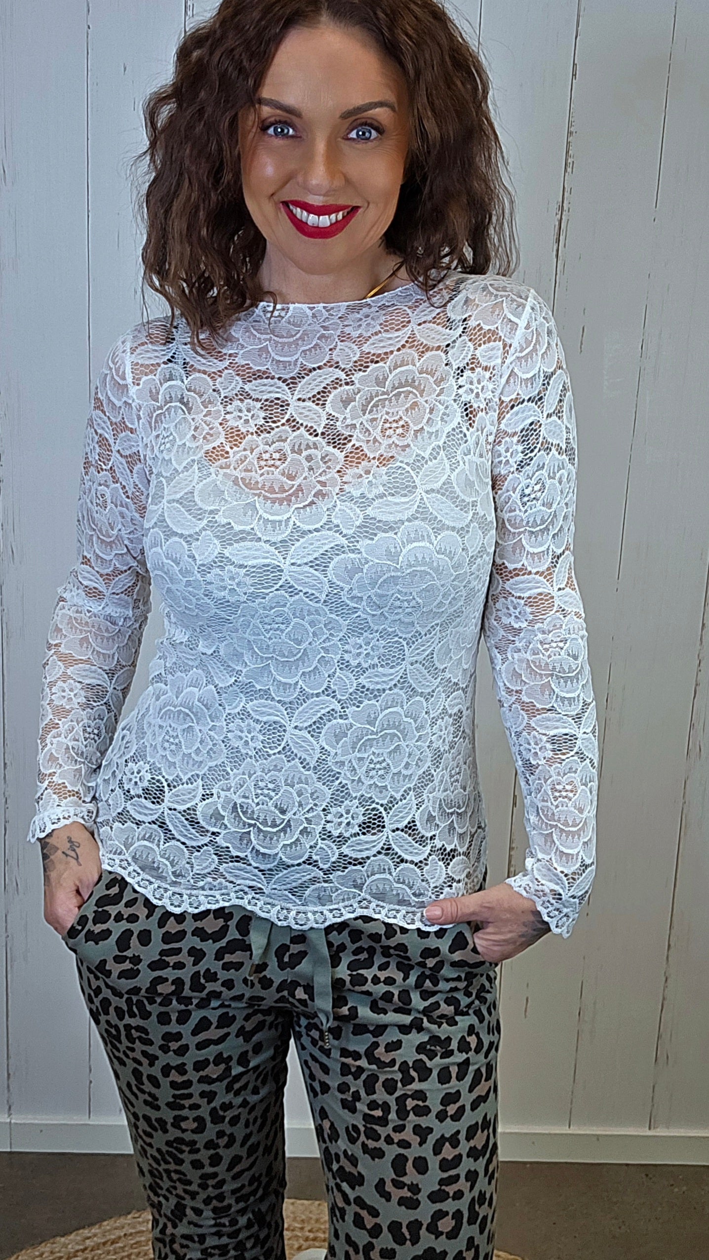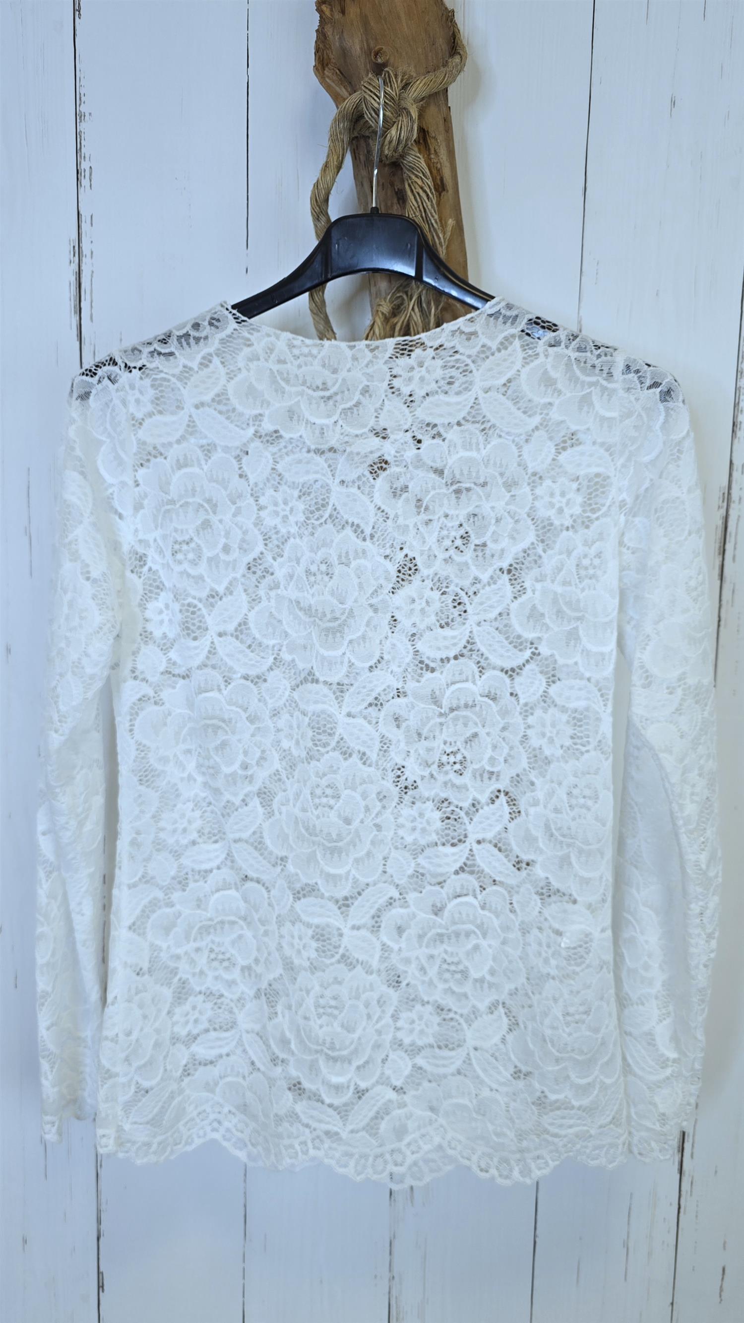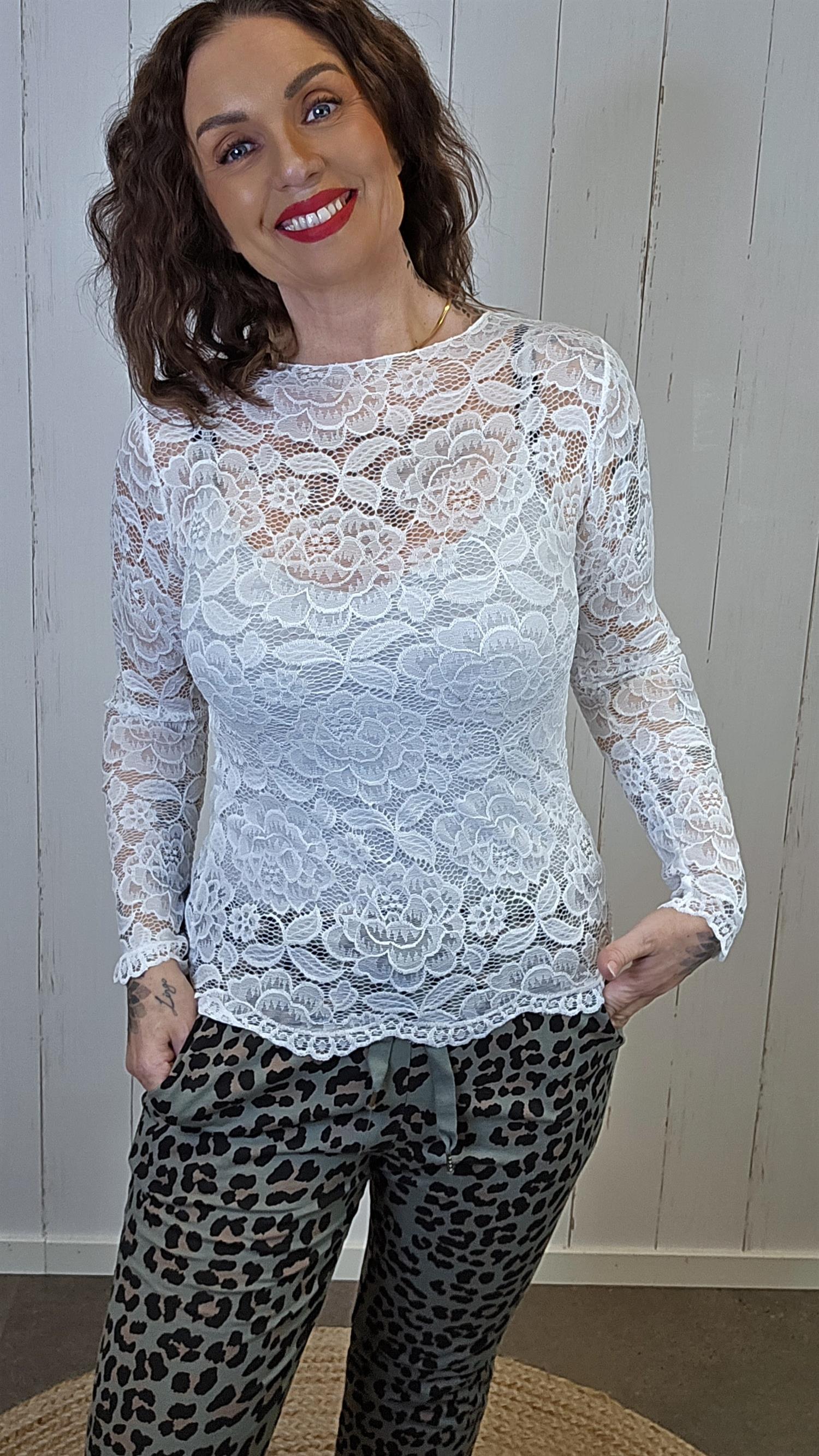 Elegant og tidløs blondetopp i myk, elastisk blonde med gjennomgående blomstermønster. Modellen har lange ermer og en rett, flatterende fasong som gjør den enkel å style både alene og som lag-på-lag. Den lette blonden gir et feminint uttrykk samtidig som stoffet er behagelig og smidig på kroppen.