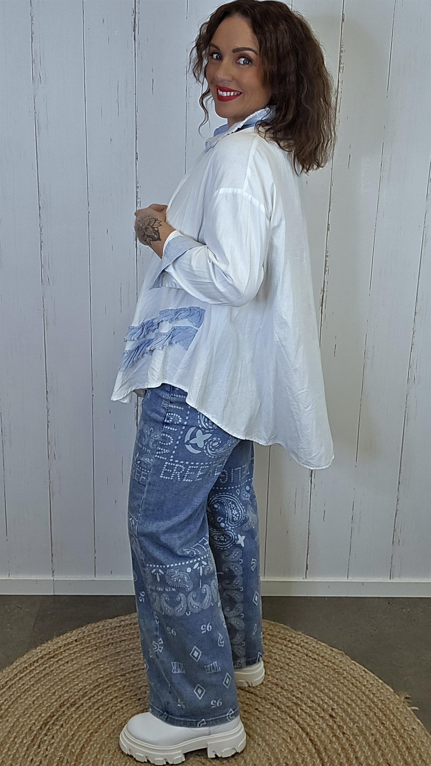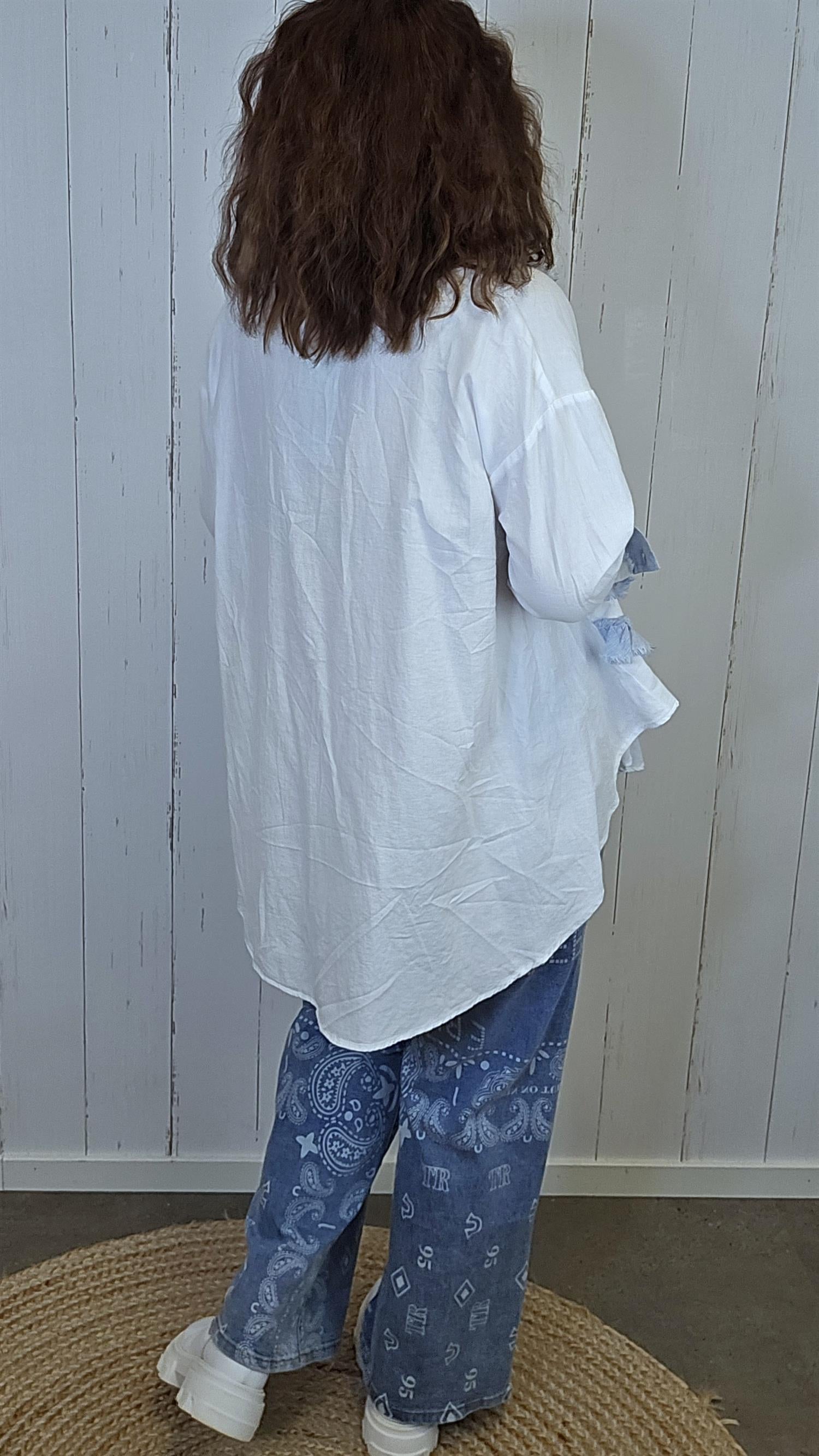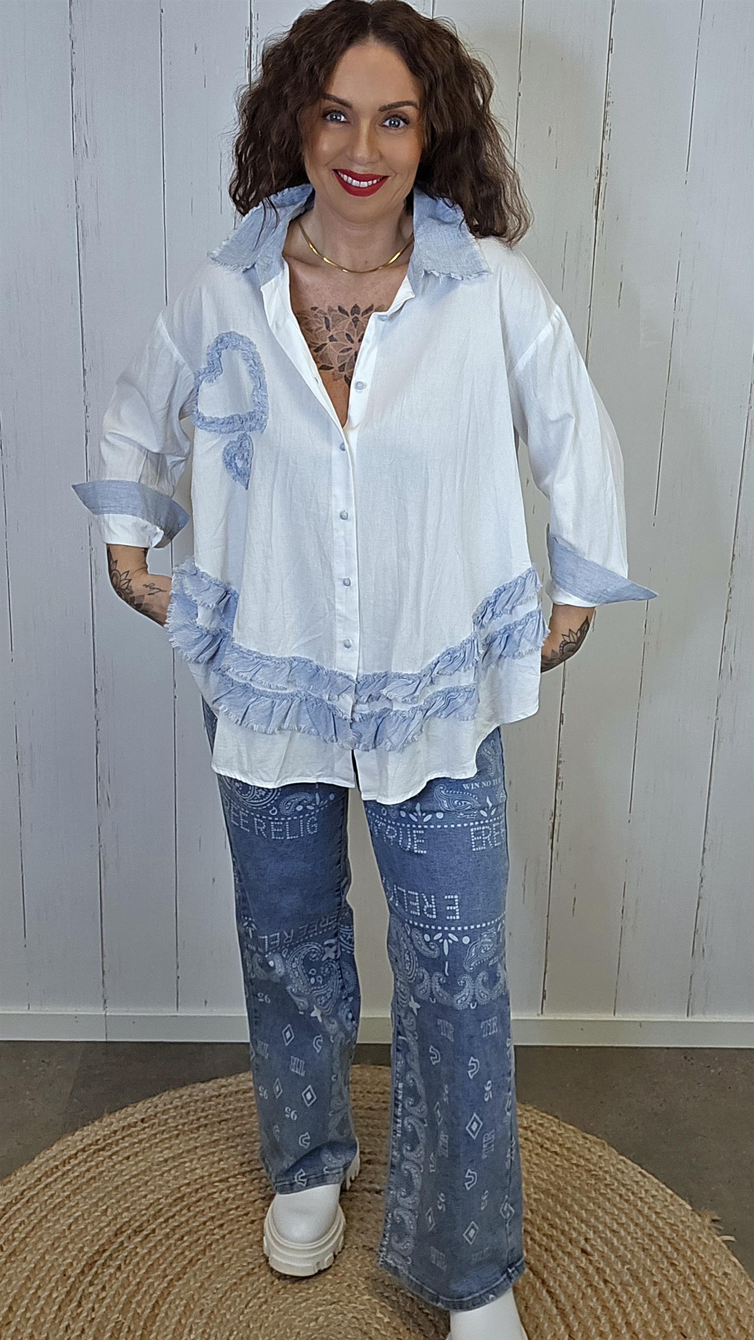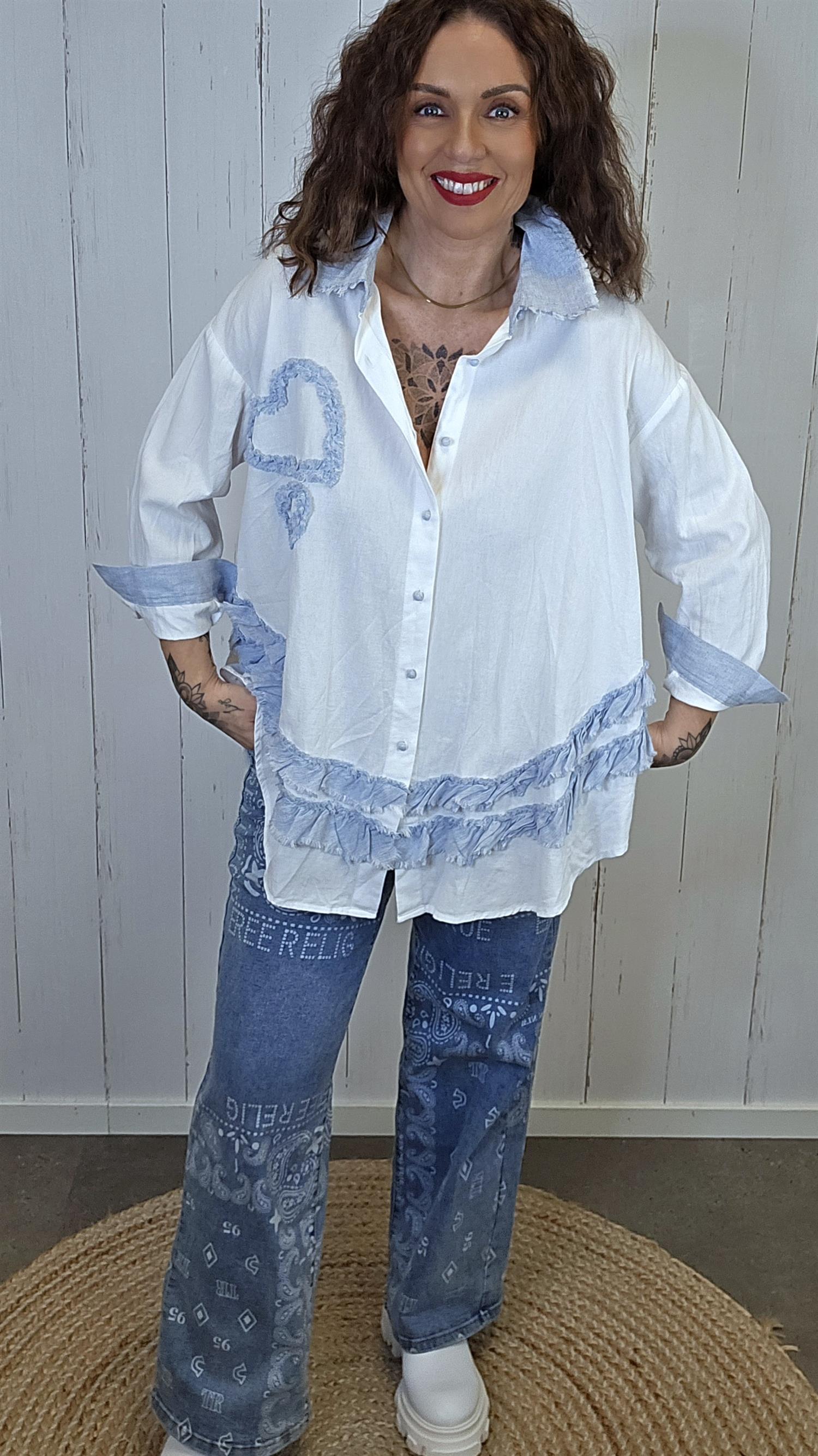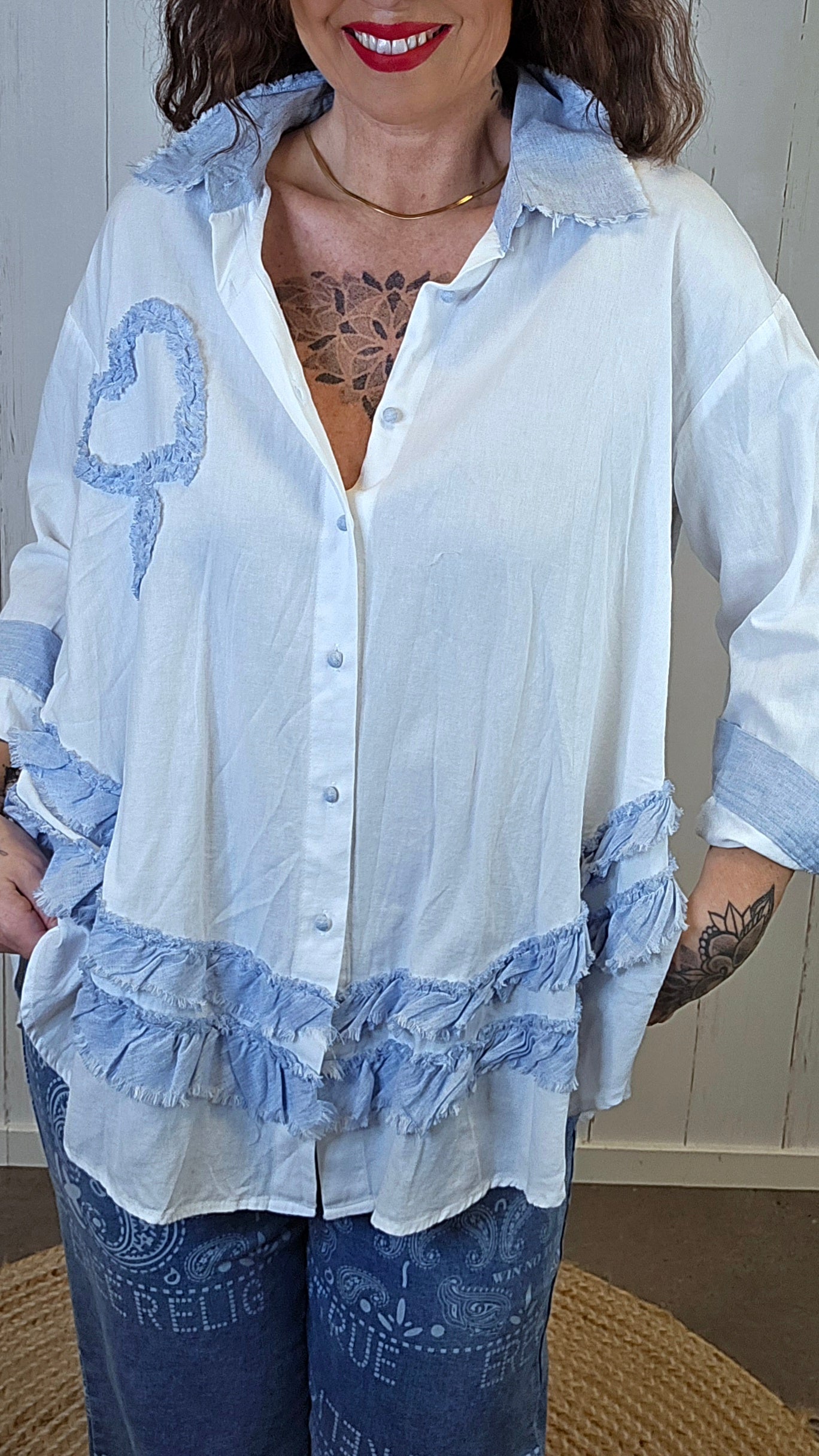 Lett og feminin skjorte med gjennomgående knappelukking og myke volangdetaljer nederst. Modellen har dekorative kontraster i lys denimblå linblanding på krage, mansjetter og volanger som gir et avslappet, men gjennomført uttrykk. På ermene er det knapp nederst, slik at de kan brettes opp og festes for en mer casual stil. Lengre bakstykke gir en flatterende og ledig passform.