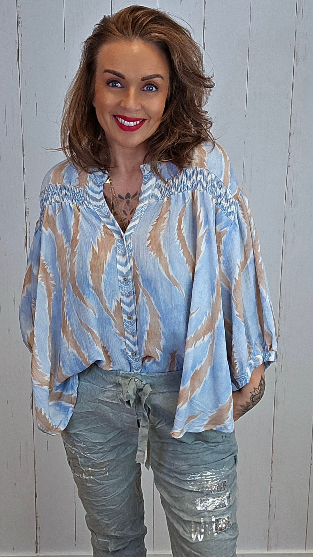 Denne skjorteblusen har et lett og luftig uttrykk med mykt fall. Den har knappelukking i front og en flatterende V-formet åpning øverst. Skuldrene er dekorert med en lett rynket søm som gir ekstra bevegelse i stoffet, og ermene har god vidde med elastisk avslutning nederst. Et behagelig og anvendelig plagg som passer godt både til hverdag og mer pyntede anledninger.