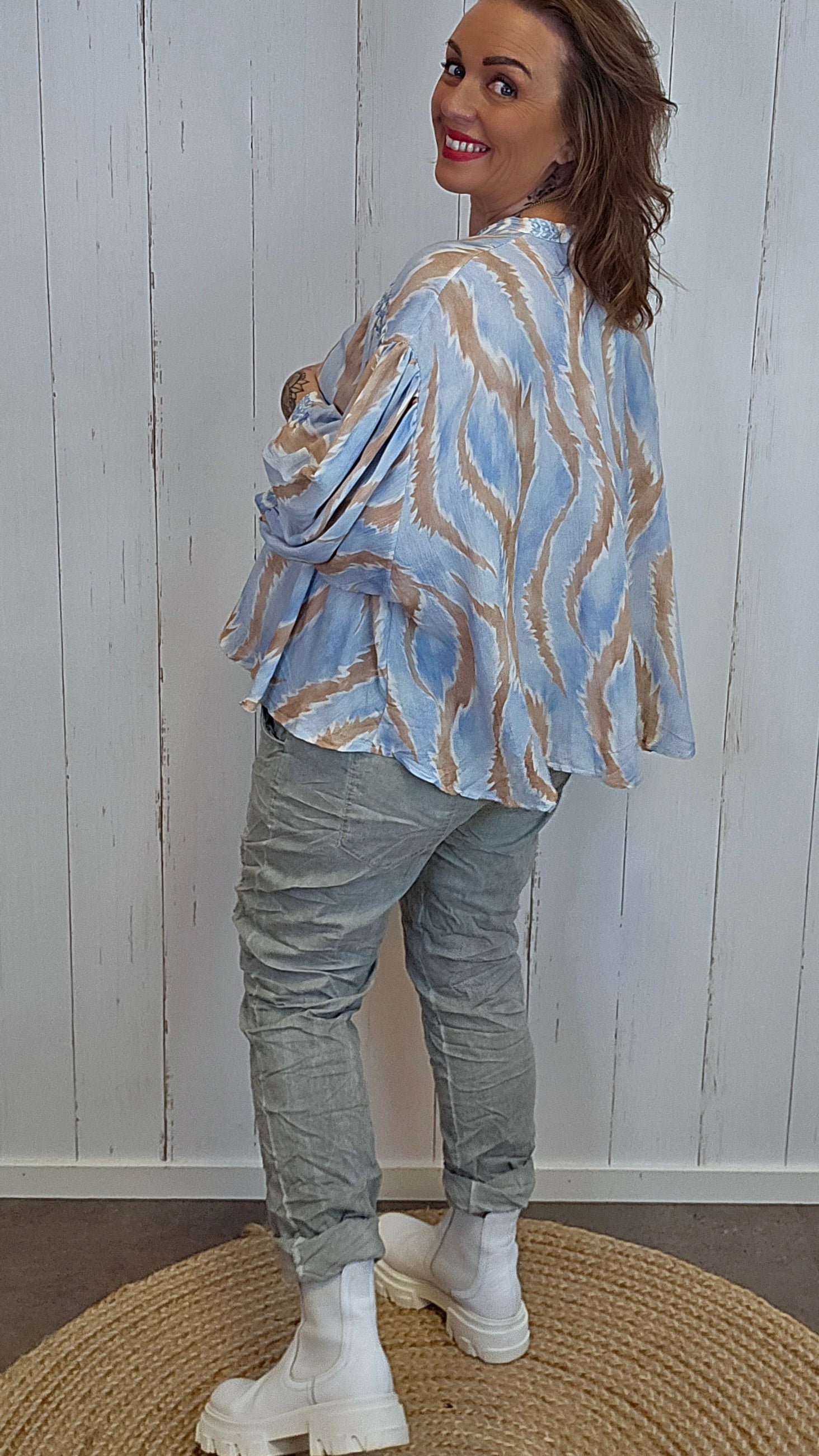 Bruk skjorteblusen sammen med smale jeans eller linbukser for å balansere volumet i plagget. Den er også fin å style med et skjørt og sandaler for en lett og sommerlig look.