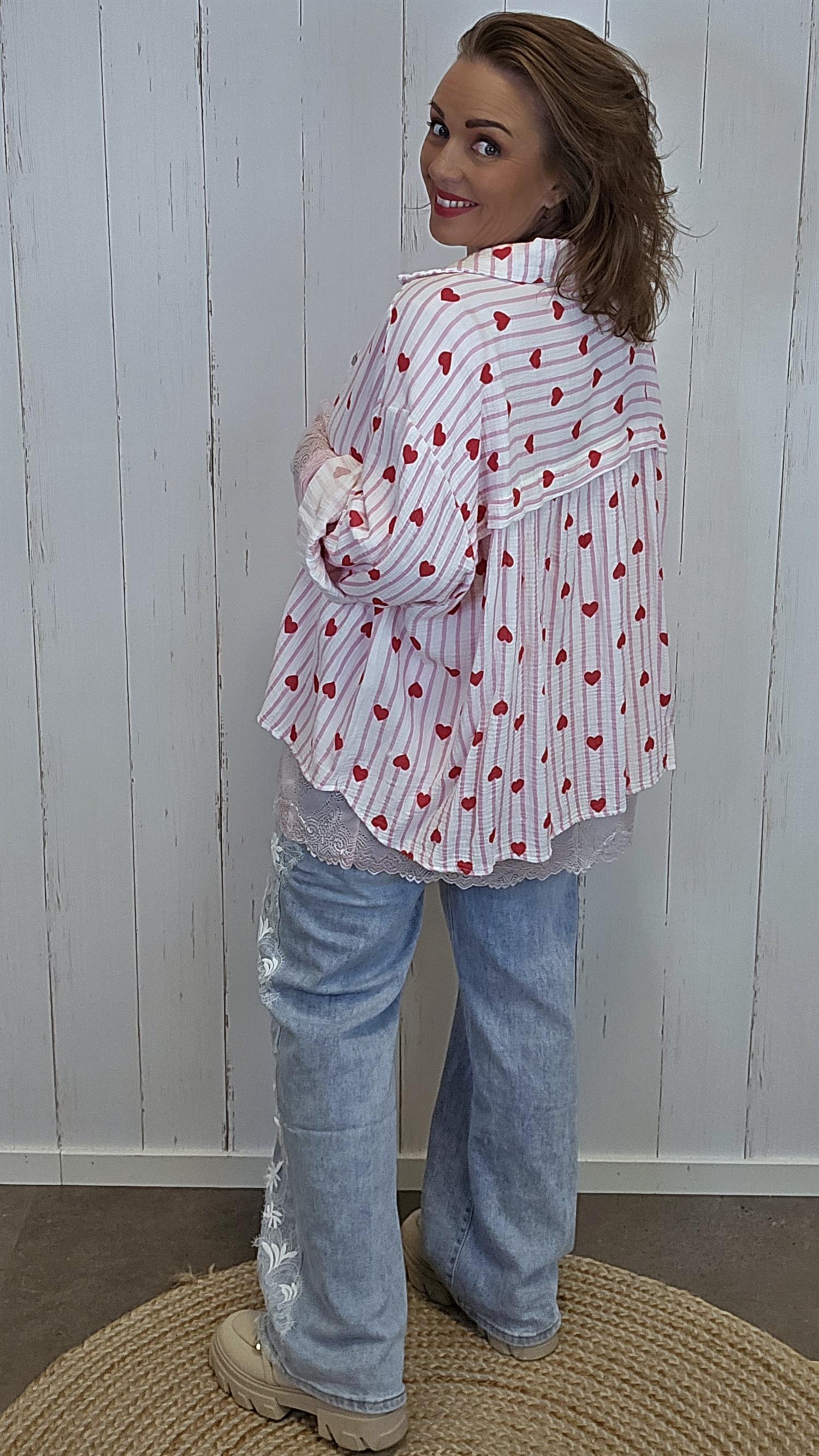Lett og sjarmerende skjortebluse i myk vaffelstruktur med vertikale striper og hjerteprint. Modellen har klassisk krage, knappelukking i front og lange ermer med lett volum og strikk nederst. Stoffets struktur gir et avslappet uttrykk samtidig som den føles behagelig mot huden. Litt lengre bak enn foran for en flatterende helhet.