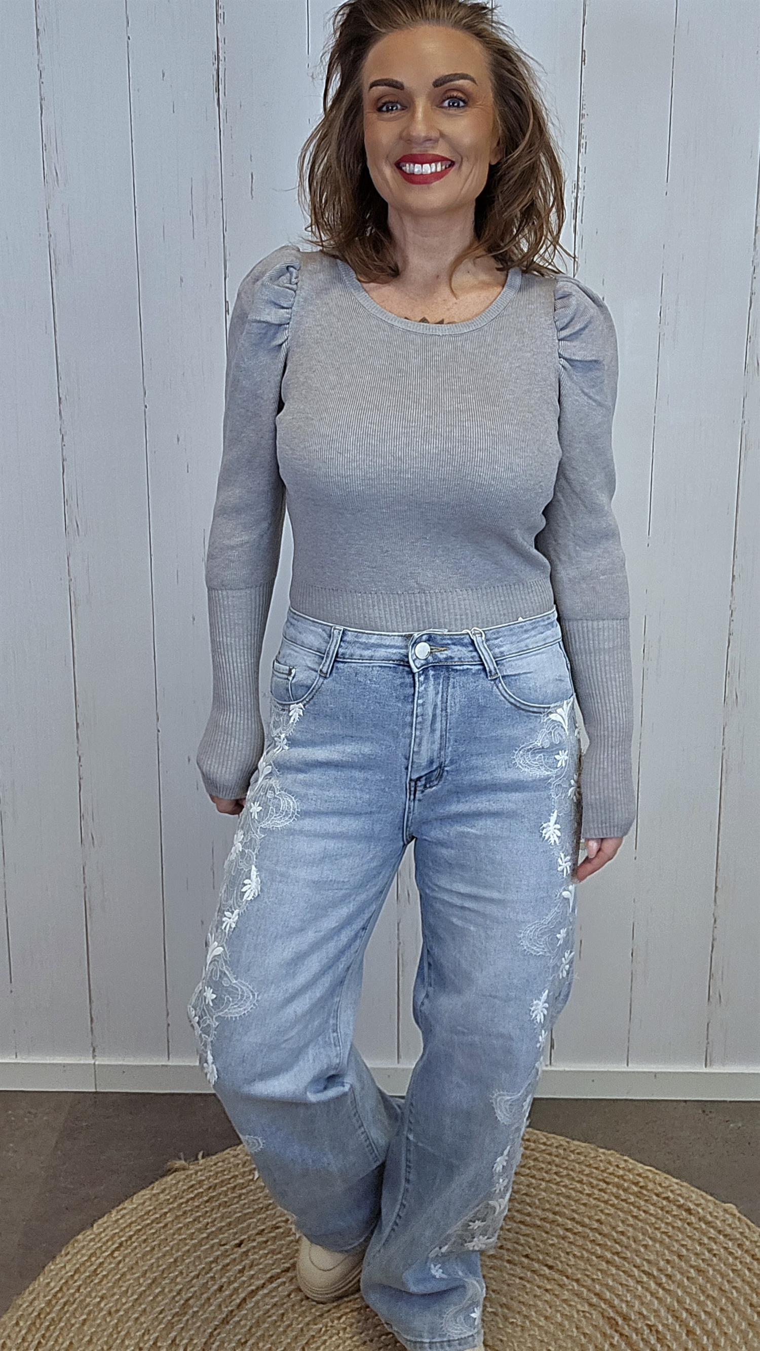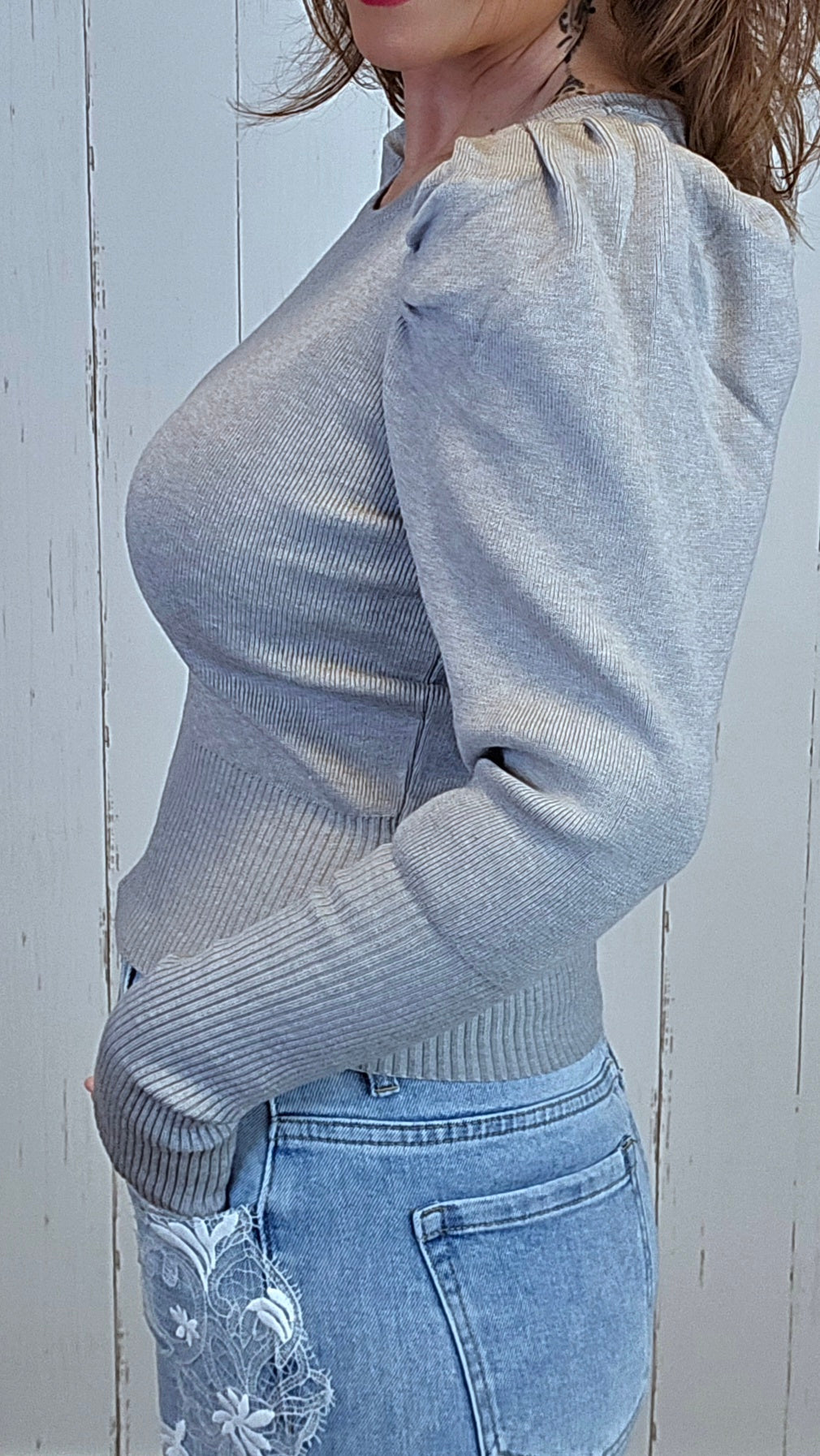 Myk strikkegenser med rund hals og markerte puffermer som gir et feminint og moderne uttrykk. Ribbestrikket avslutning nederst og på ermene gir en fin fasong og god komfort. En allsidig genser som passer like godt til hverdags som til mer pyntede antrekk.