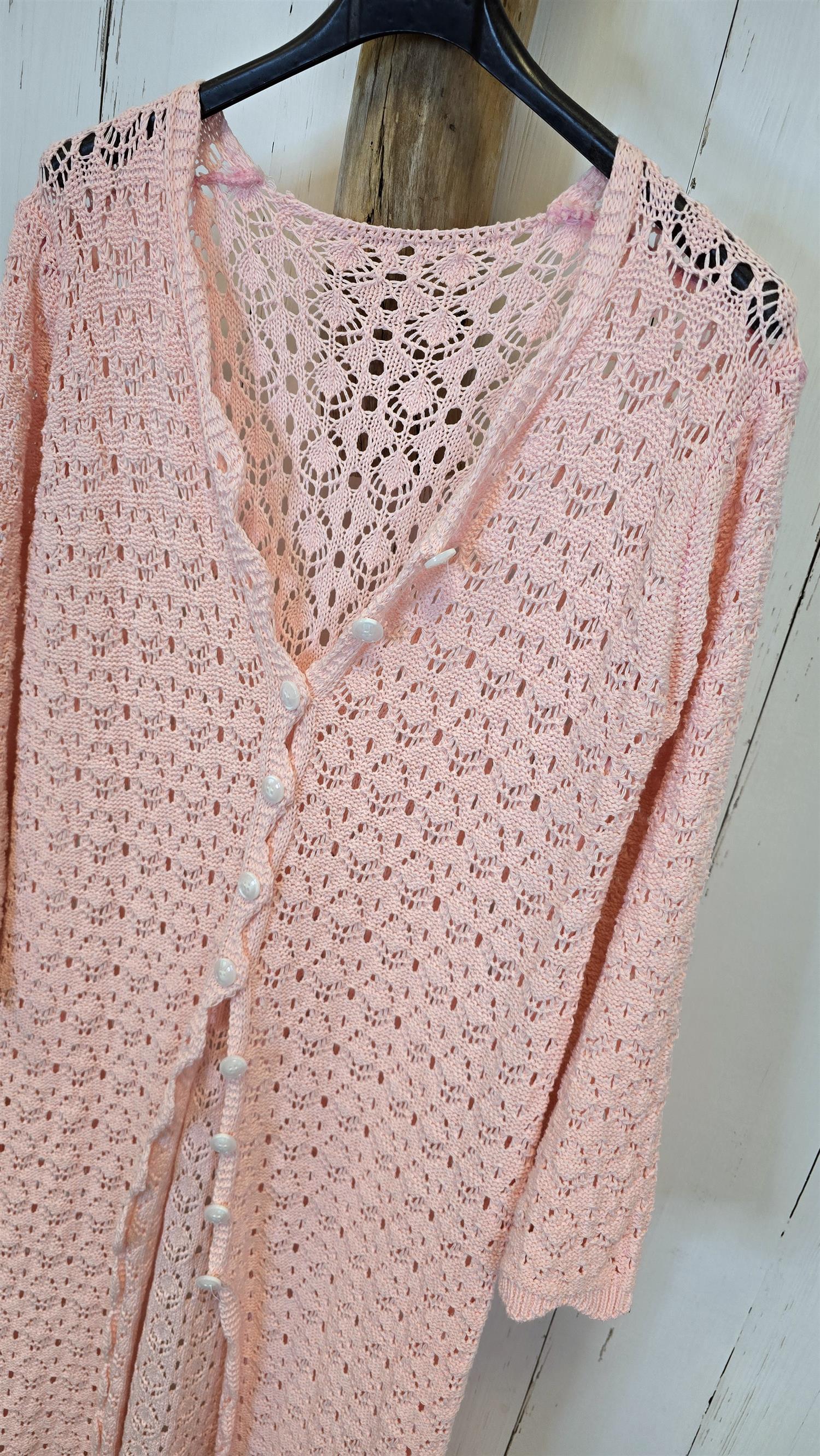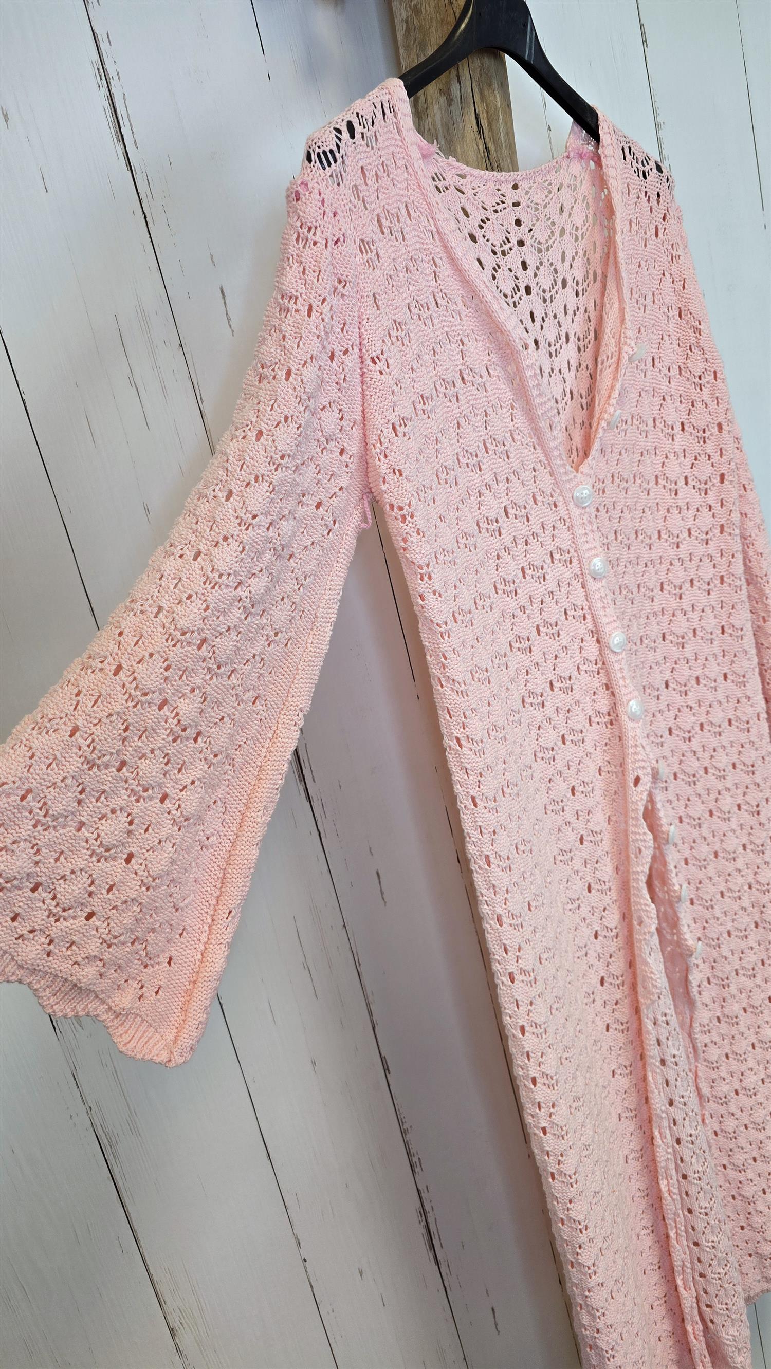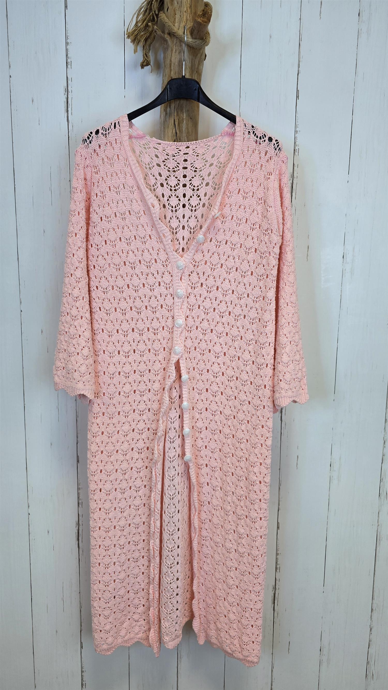 Lett og feminin heklet kjole med dekorative hullmønstre og knappelukking hele veien i front. Modellen har et mykt, luftig uttrykk og fungerer like fint som kjole som åpen cardigan. Den delikate rosatonen gir et sommerlig preg, mens det heklede mønsteret skaper dybde og tekstur. Et allsidig plagg som passer både strand og by.