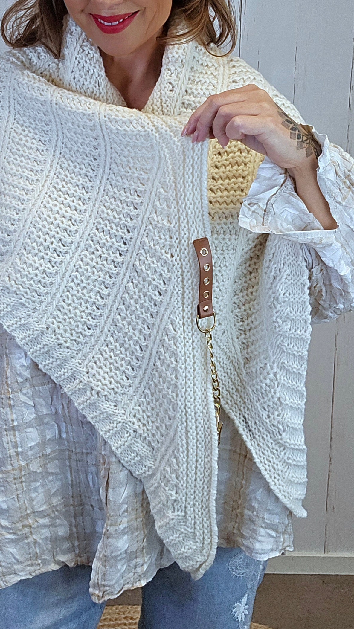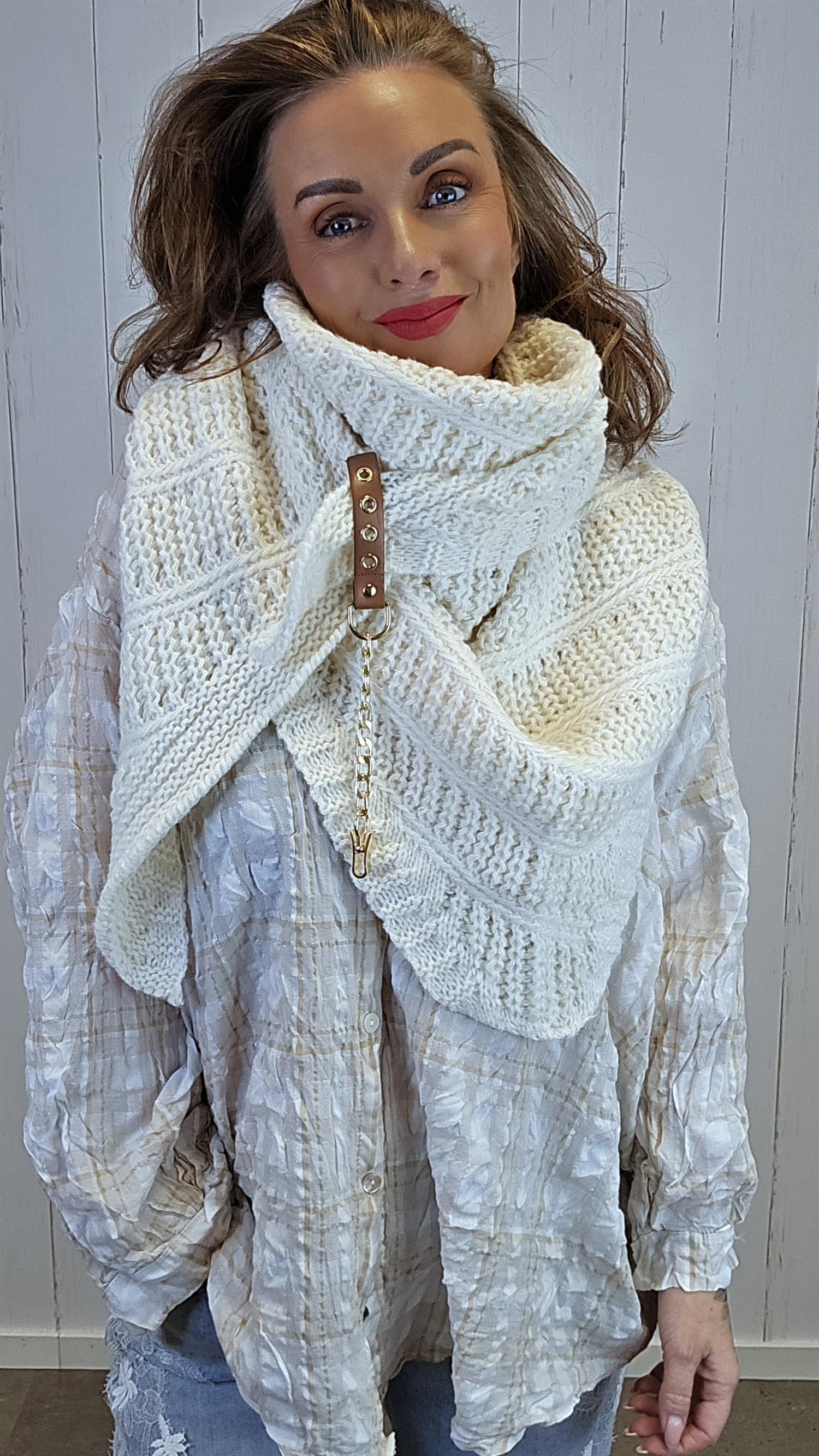 Mykt og dekorativt trekantsjal i grovstrikk med vakkert strukturmønster. Sjalet har en feminin fasong og faller pent over skuldrene. Detaljene med lærhempe og gullfarget lenke gir et røft, men elegant uttrykk som løfter antrekket.