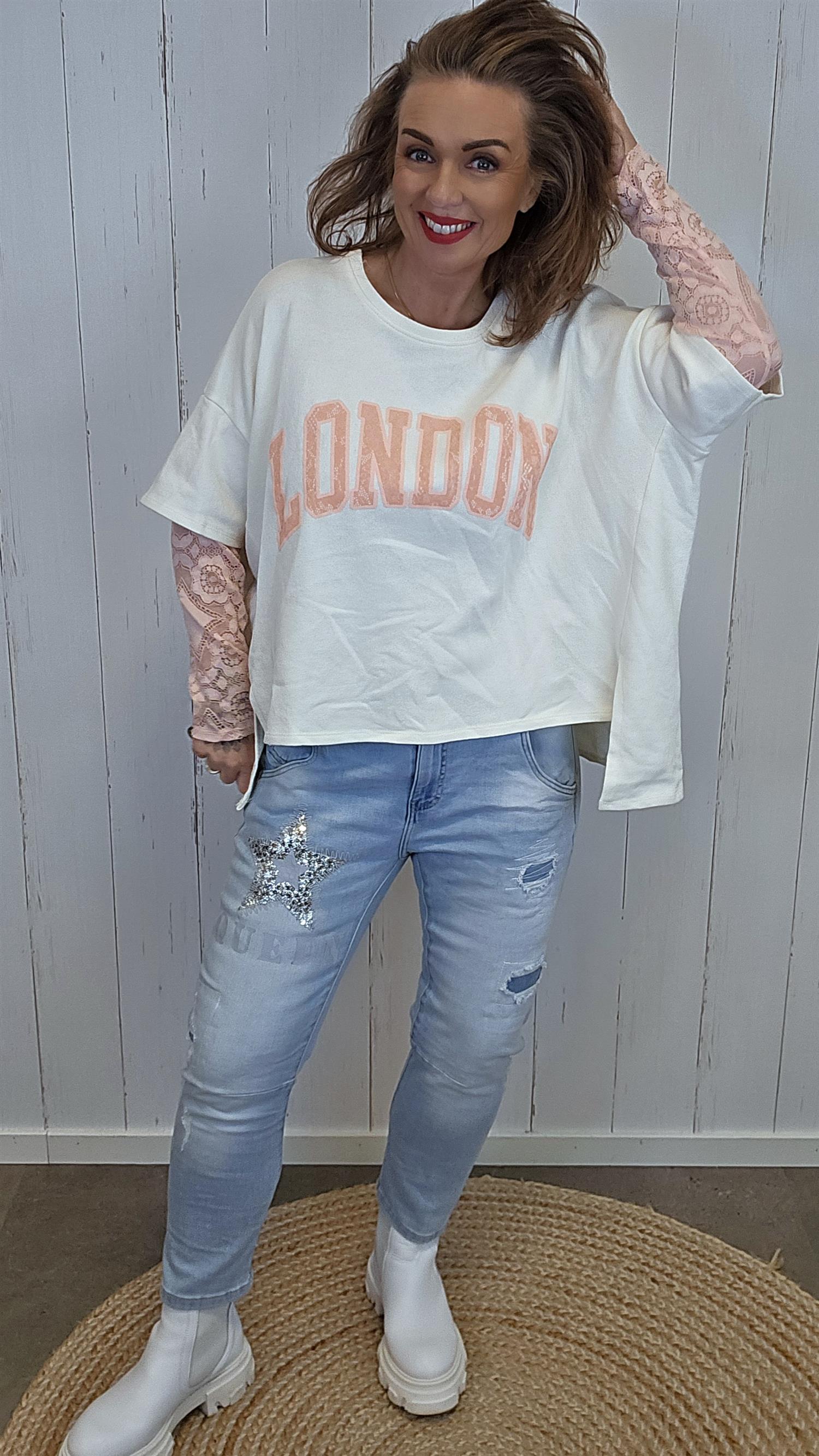 Lett og myk topp med avslappet fasong og dekorativ lag-på-lag-effekt. Modellen har korte ermer ytterst og lange blondeermer under, som gir et feminint og samtidig casual uttrykk. Tekstdetaljen i front tilfører en sporty kontrast, mens den lengre bakdelen gir en flatterende silhuett.