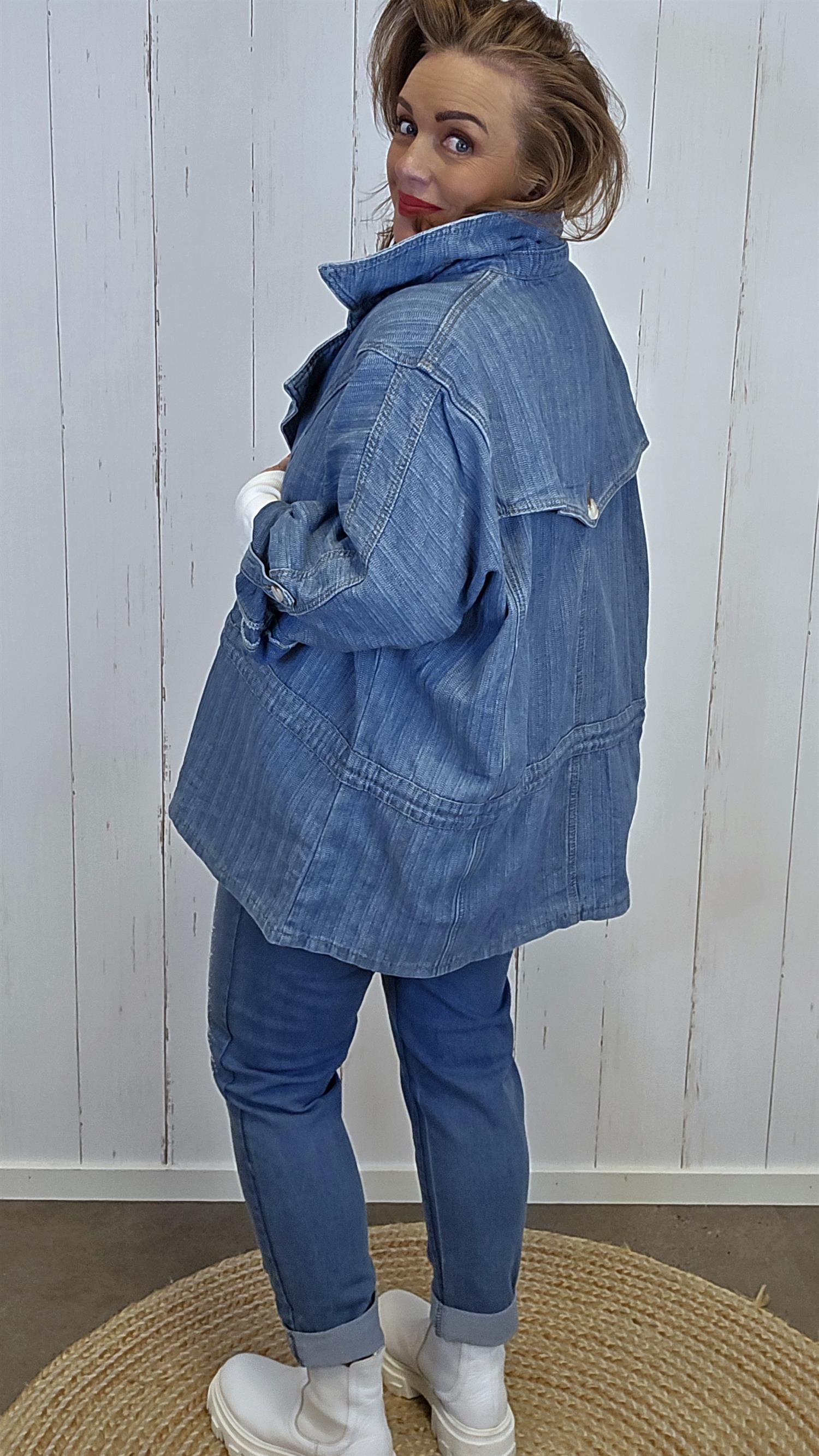Jakke i denim med dobbel knappelukking og markert krage. Modellen har snor til knyting et stykke ned på kroppen, som gir mulighet til å justere fasongen. Ermene kan brettes opp og hempes fast. Praktiske lommer foran og et avslappet, anvendelig uttrykk.