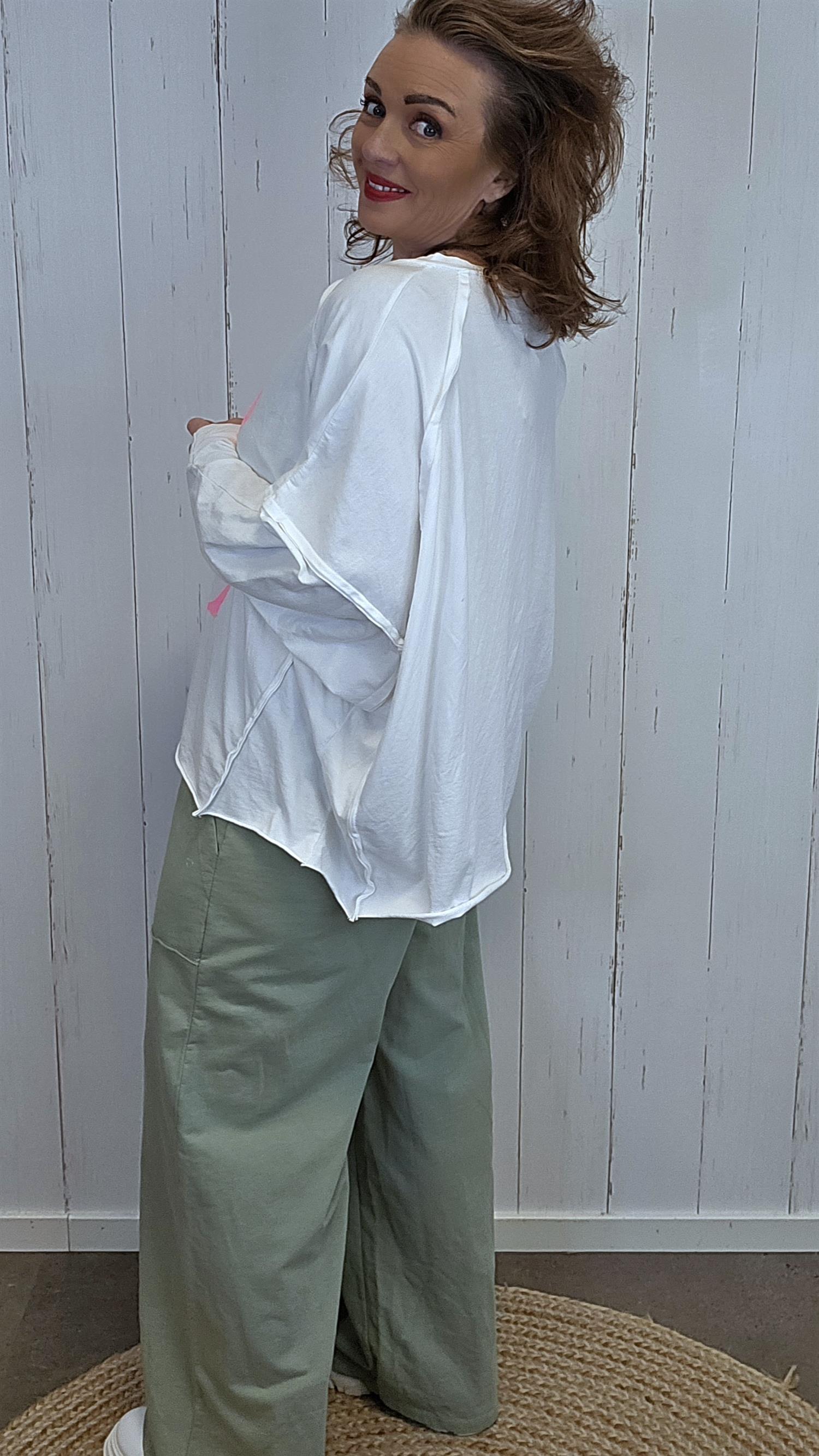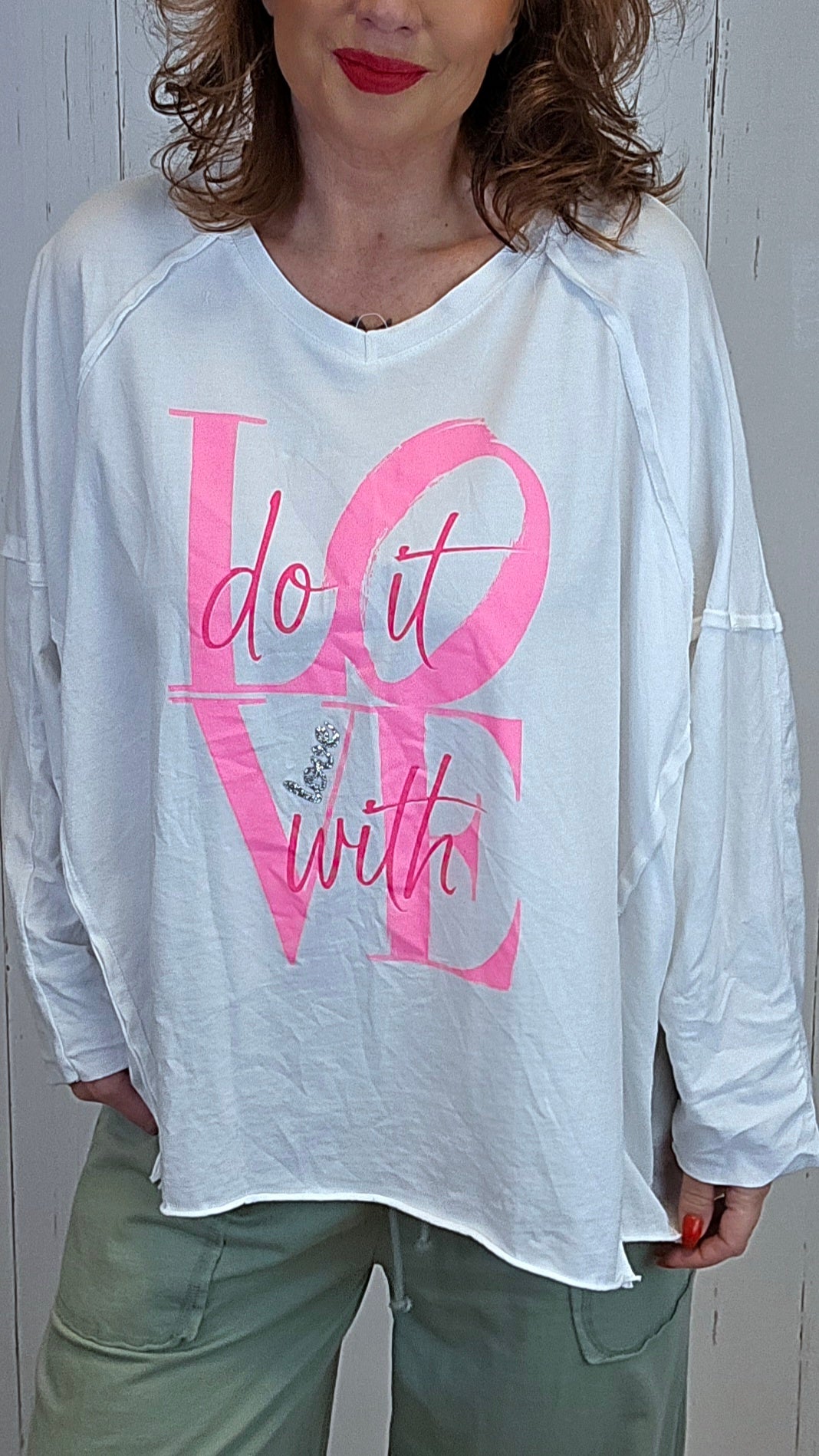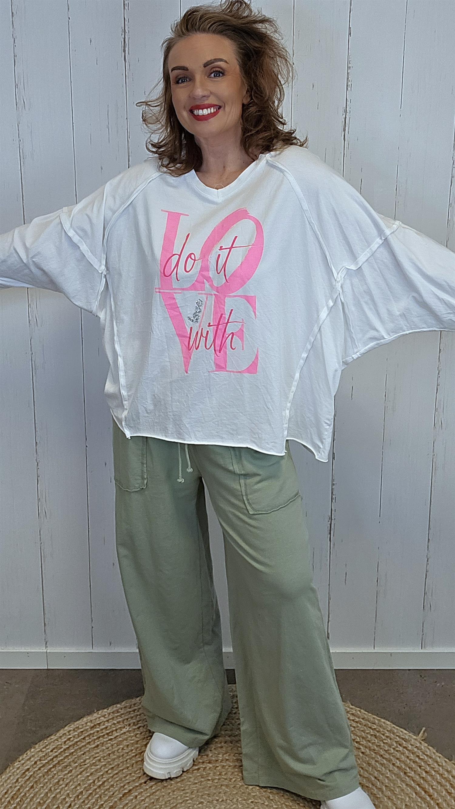 Myk og behagelig topp med avslappet passform og V-hals. Modellen har lange ermer og dekorativt print i front med teksten «Do it with love». Inne i V-en er ordet «love» markert med glitrende steiner som gir et feminint og lett pyntet uttrykk. En komfortabel topp som er enkel å bruke både til hverdag og litt penere anledninger.