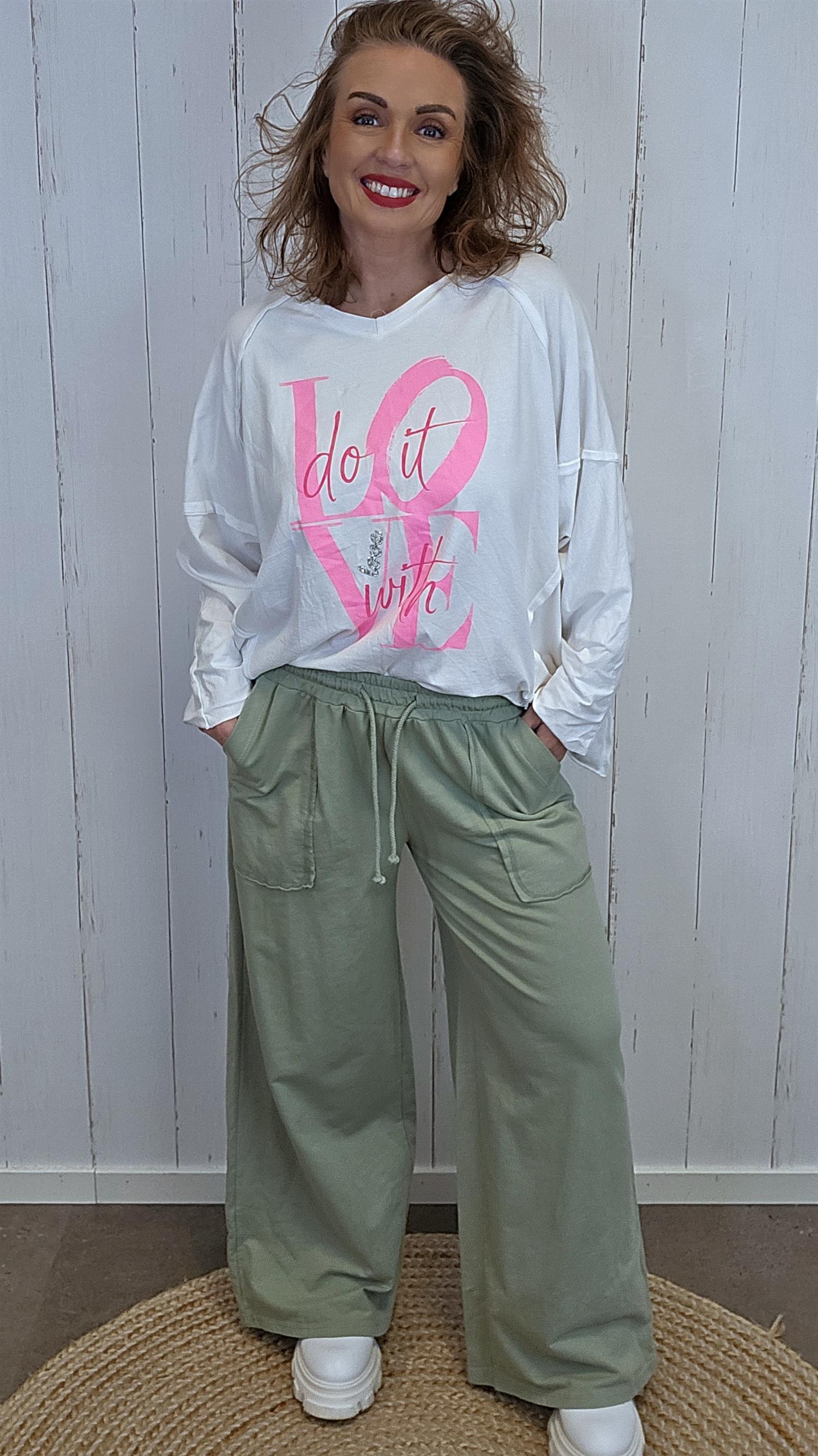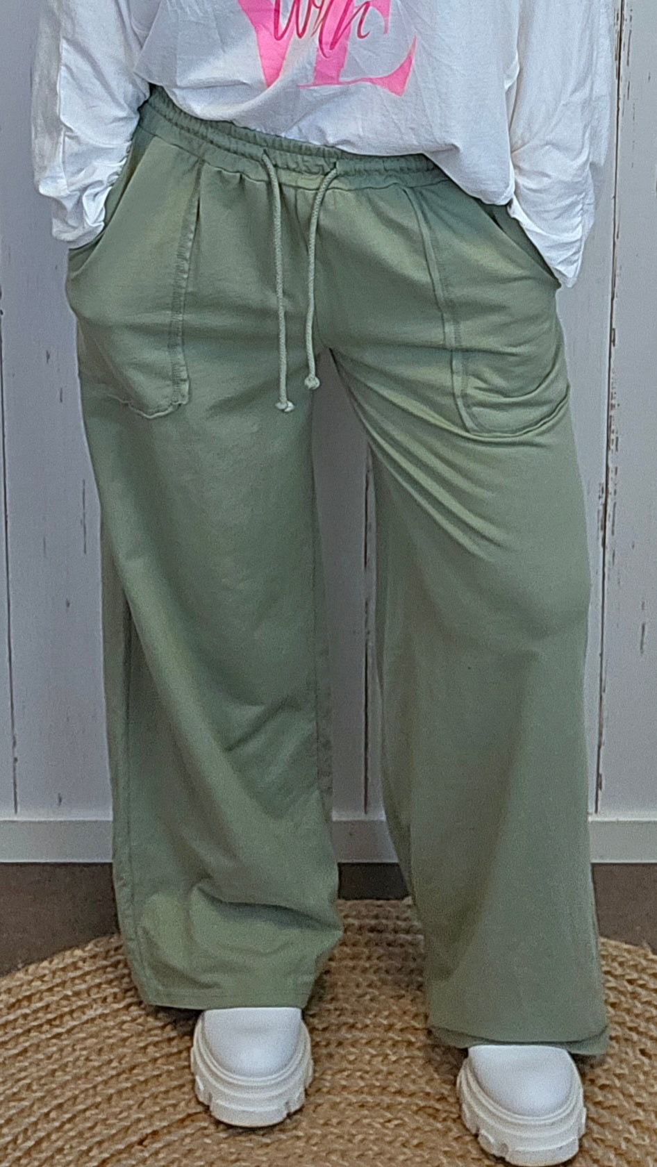 Myk og komfortabel bukse med elastisk linning og snøring i livet. Modellen har rette, vide ben og praktiske lommer foran som gir et avslappet, men gjennomført uttrykk. Stoffet er lett og behagelig, perfekt både til hverdagsbruk og rolige dager.